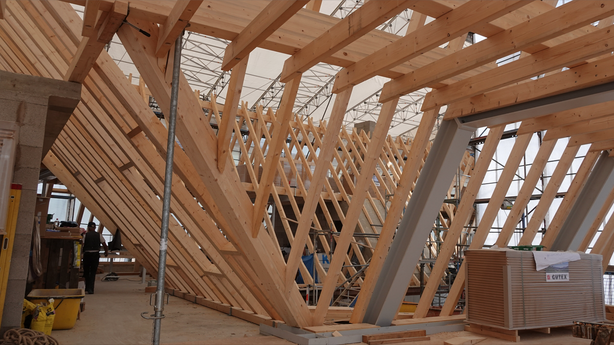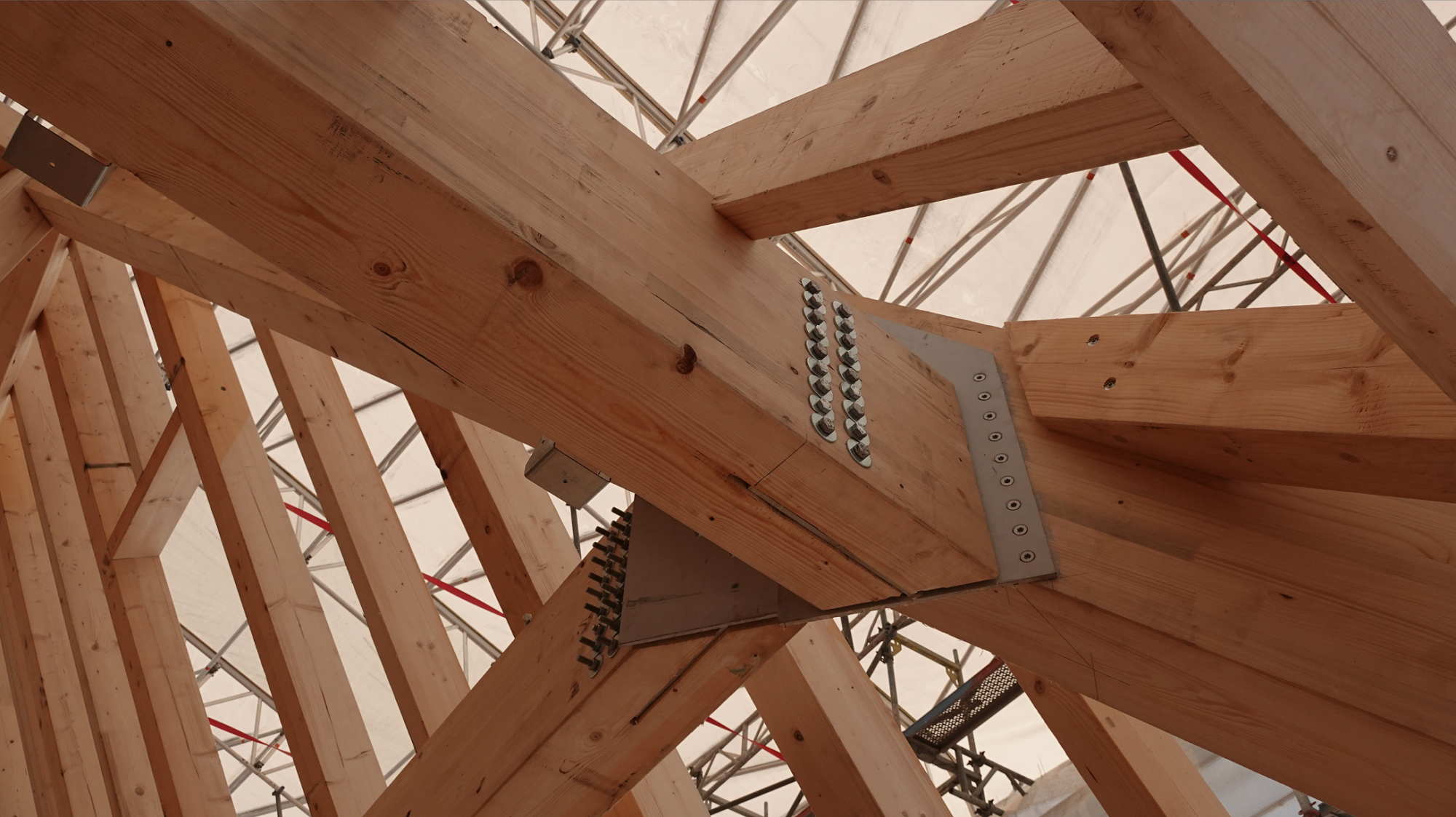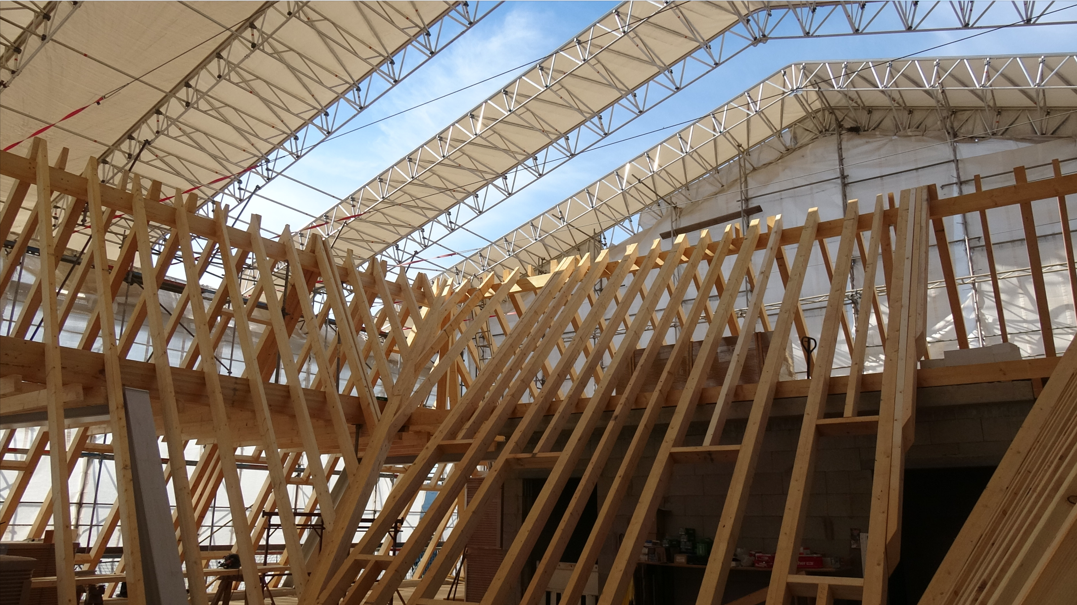 Mit Stolz präsentieren die Zimmermänner ihre geschaffene Dachkonstruktion, dass sie unter schwierigen Bedingungen unter dem Zeltdach errichten mussten.