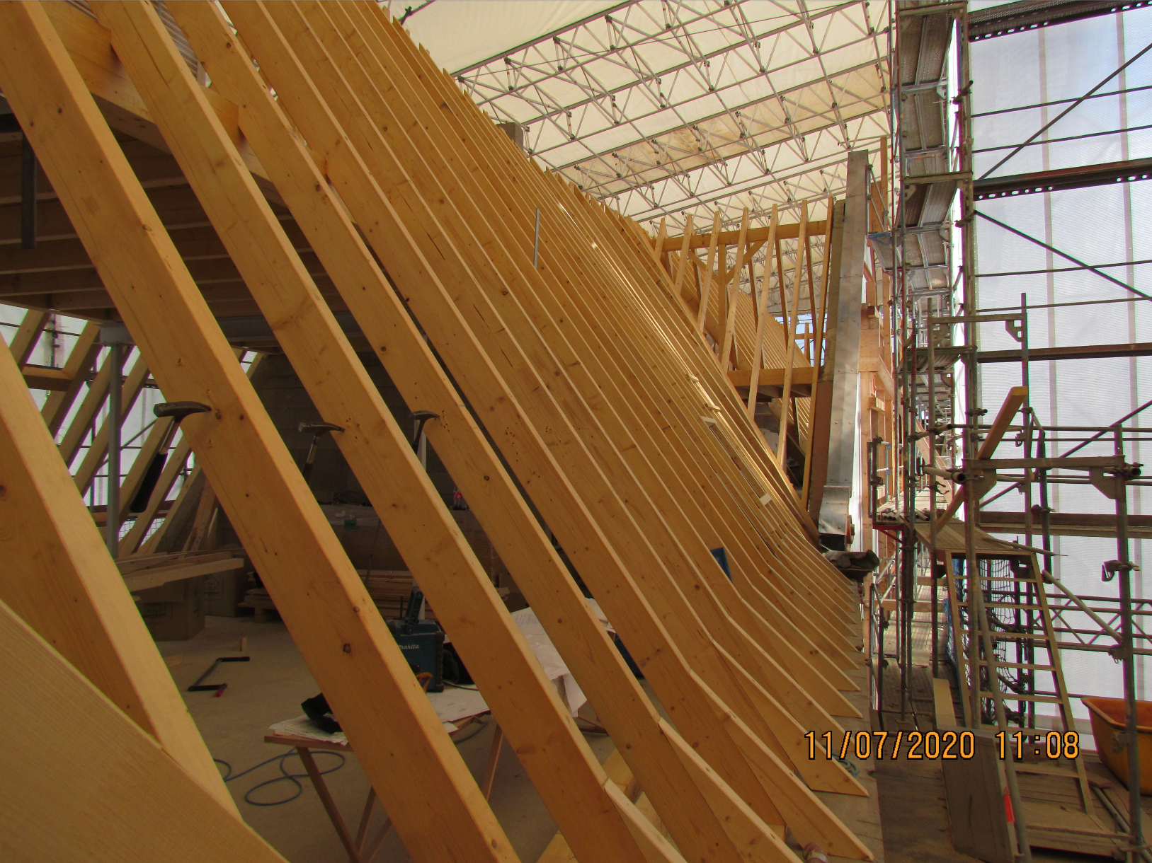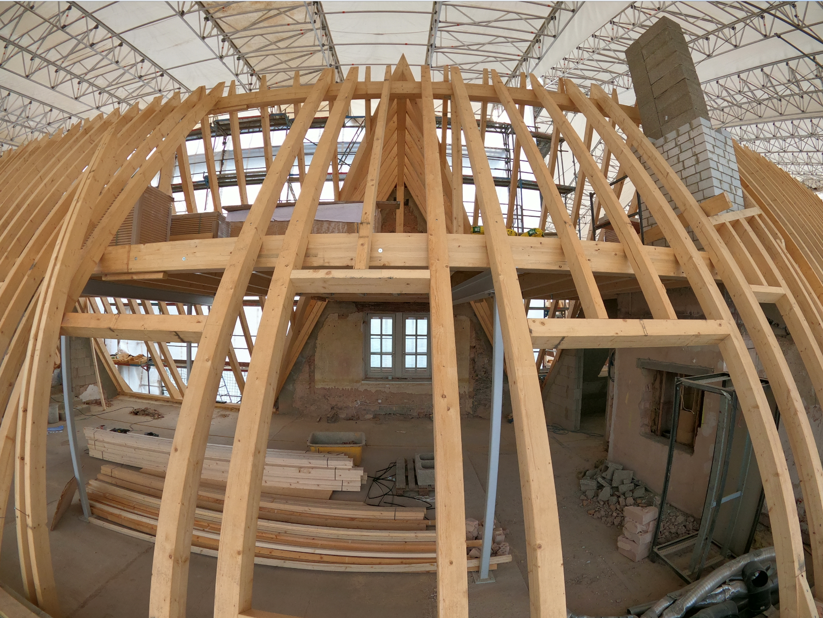 Die unförmigen Gemäuer, die nach dem Brand sichtbar wurden, erforderten eine passgenaue Vorgabe der Denkmalbehörde und der heutigen bauphysikalischen Wärmeschutzverordnung sowie der Statik beim Bau der neuen Konstruktion. Fachkenntnisse und Beherrschung der geometrischen Gesetze und handwerkliches Geschick waren das Ergebnis.