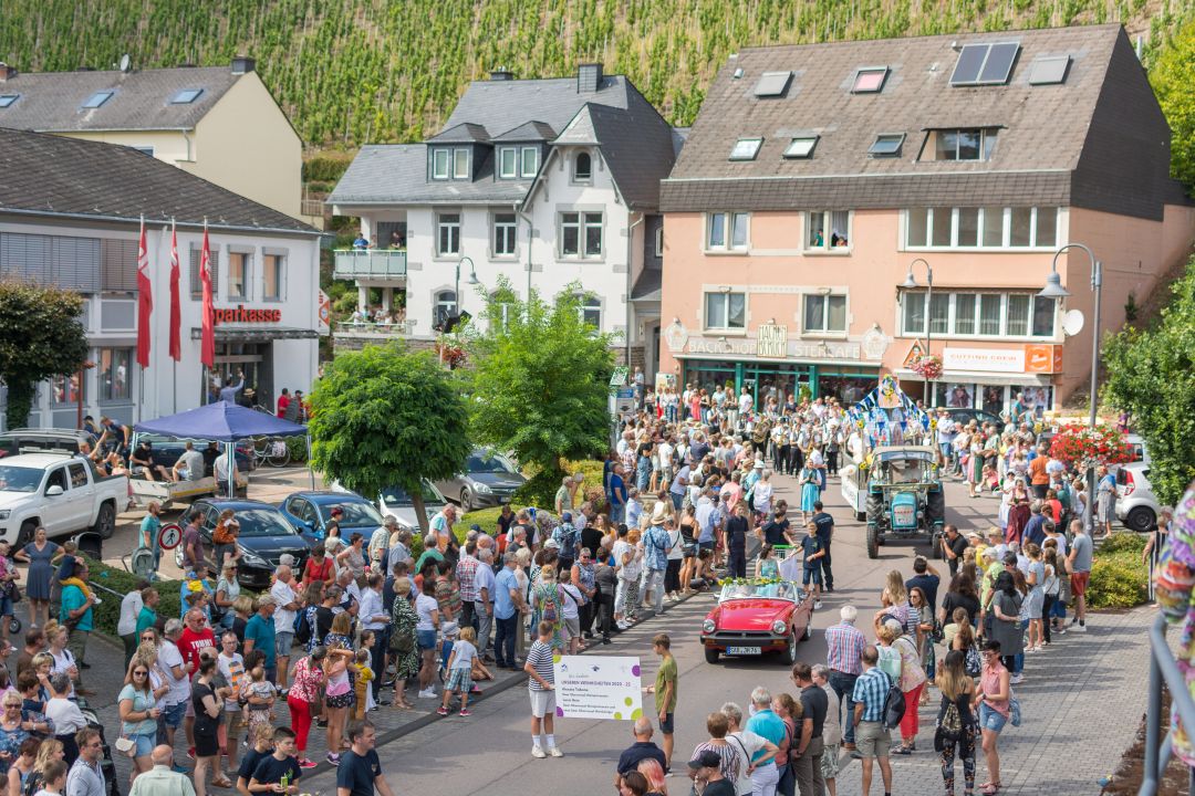 Nach einer für viele Festbesucher kurzen Nacht zog am Sonntag ab 14 Uhr der bunte Festumzug mit 27 Gruppen durch die Innenstadt. Nahezu alle Vereine der Stadt sowie viele Ortsgemeinden der Verbandsgemeinde Saarburg-Kell repräsentierten fröhlich ihre Heimat und gaben Festwein, Saft, Trauben oder Schmalzbrote aus. Der Wagen der Stadt Saarburg war im Rahmen der 70 Jahre Partnerschaft umgestaltet worden und die französische Abgeordnete Bernadette Panizzi aus der Partnerstadt Sarrebourg und der Beigeordnete der Stadt Saarburg Franz-Josef Reiter verteilten gemeinsam nicht nur Wein, sondern auch kleinere deutsch-französische Geschenke. Die Kulturgießerei war nach dem Umzug Anlaufpunkt für Familien: Dort standen die Kleinen im Mittelpunkt und konnten kreativ sein, hausgemachten Kuchen probieren und das Museum entdecken. Begeistert waren auch die Teilnehmerinnen und Teilnehmer der beiden Weinführungen der Kultur- und Weinbotschafter Christiane Beyer und Alexander Schumitz. Am Sonntagabend und gab es dann viel Musik mit den Bands Phoenix Unplugged, Emotions und Egon Altenhofen. Am Montagabend klang dann das Fest aus mit Jürgen Trunczik, Wolfgang Prinz und Kuß n‘Groove. Die Veranstaltung wurde von der Westenergie, der Sparkasse Trier, den Stadtwerken Trier und der Volksbank Trier unterstützt.
