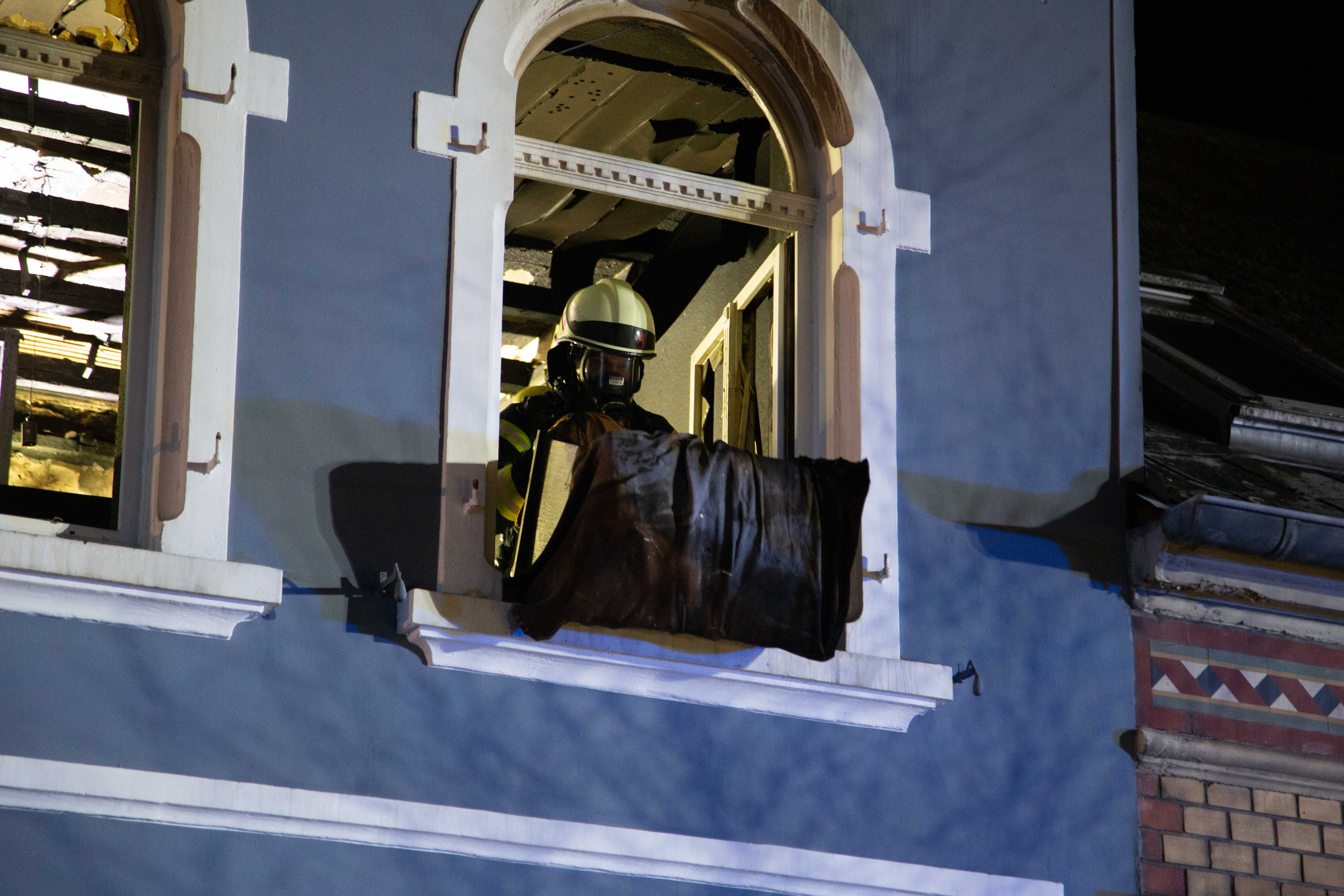 Aus dem ersten Obergeschoss musste unter Atemschutz Brandschutt entfernt werden. Es wurde in einem Container gesammelt und abgelöscht.