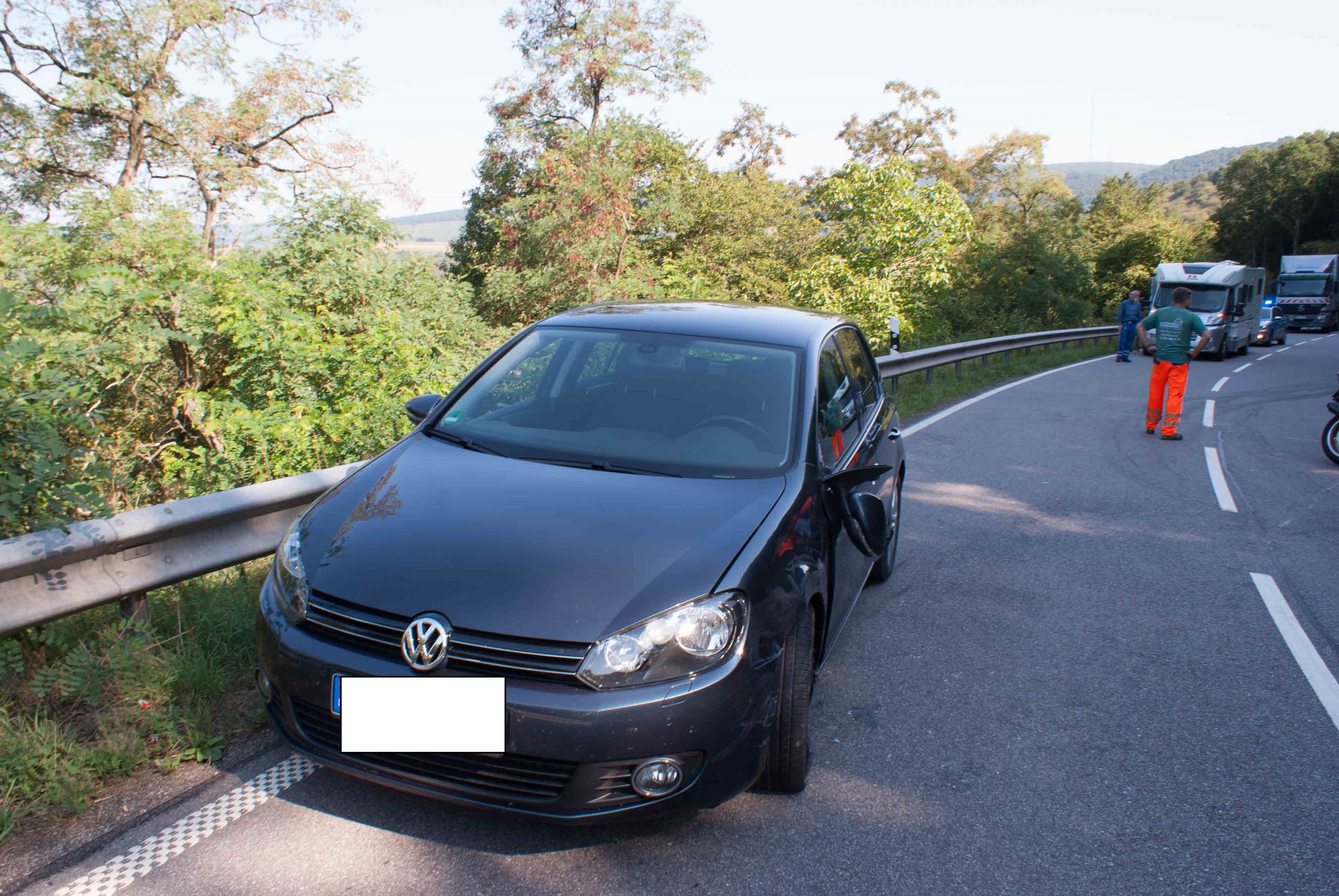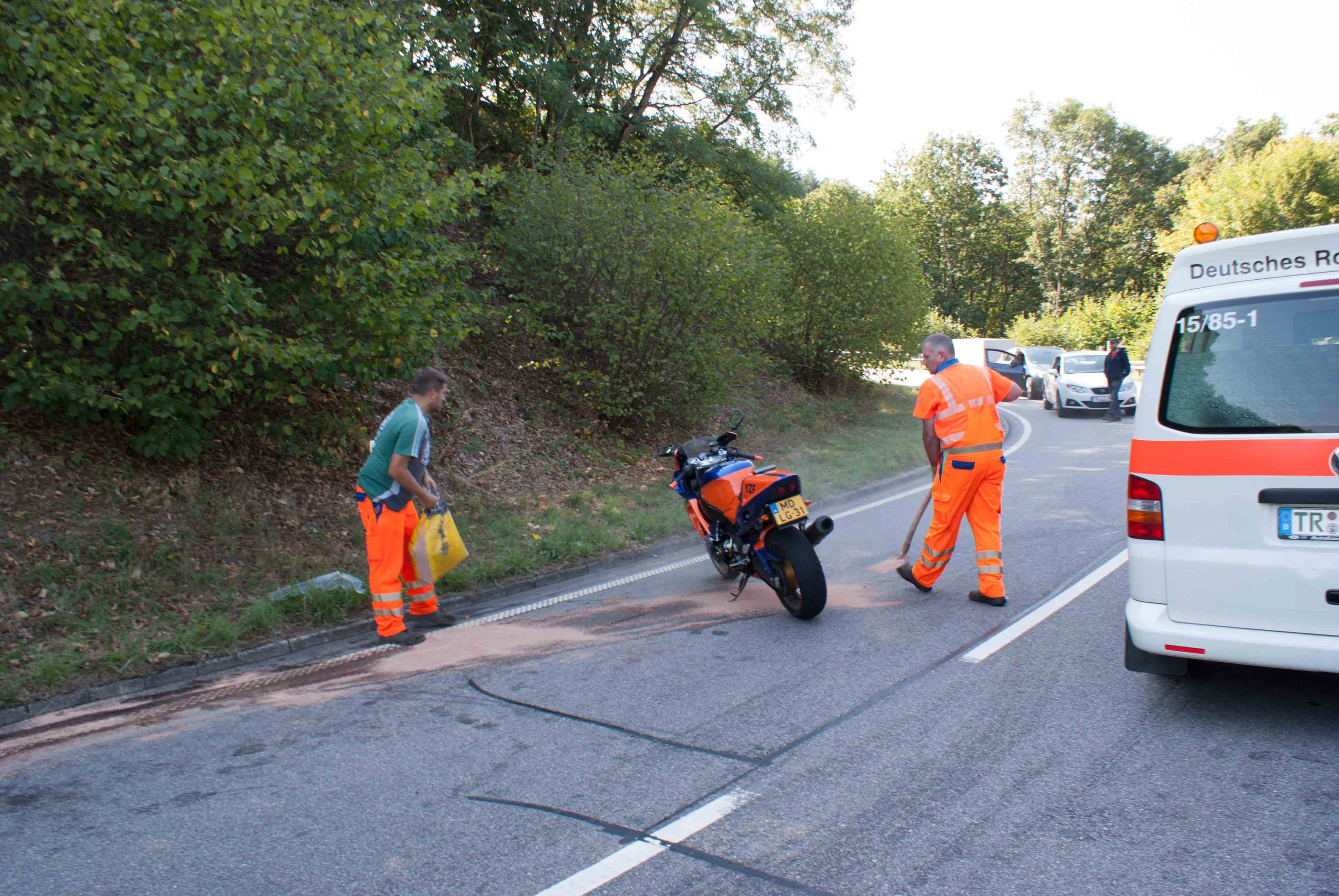 Am Freitagmorgen  (10.15 Uhr) befuhr eine Gruppe holländischer Motorradfahrer die B 407 von Vierherrenborn in Richtung Irsch. In einer engen Rechtskurve kurz vor Irsch kollidierte einer der Gruppenmitglieder in der Kurve mit einen VW Golf aus Kreis Trier-Saarburg. Es kam zu einem Sturz und Überschlag des 26 jährigen Kradfahrer. Den Unfallhergang und Ursache ermittelt die Polizeiinspektion Saarburg. Der Kradfahrer wurde mit mittelschweren Verletzungen von DRK Saarburg in ein Krankenhaus verbracht. Im Einsatz waren der Rettungshubschrauber aus Luxembourg, der RTW aus Saarburg und die PI Saarburg. Beide Fahrzeuge mußten abgeschleppt werden. Es enstand ein Schaden in Höhe von etwa 15 tsd. Euro. Die B 407 war für circa eine Stunde voll gesperrt. Wegen auslaufender Betriebstoffe mußte die Fahrbahn von der Landesbetrieb Mobilität aus Hermeskeil gereinigt werden.