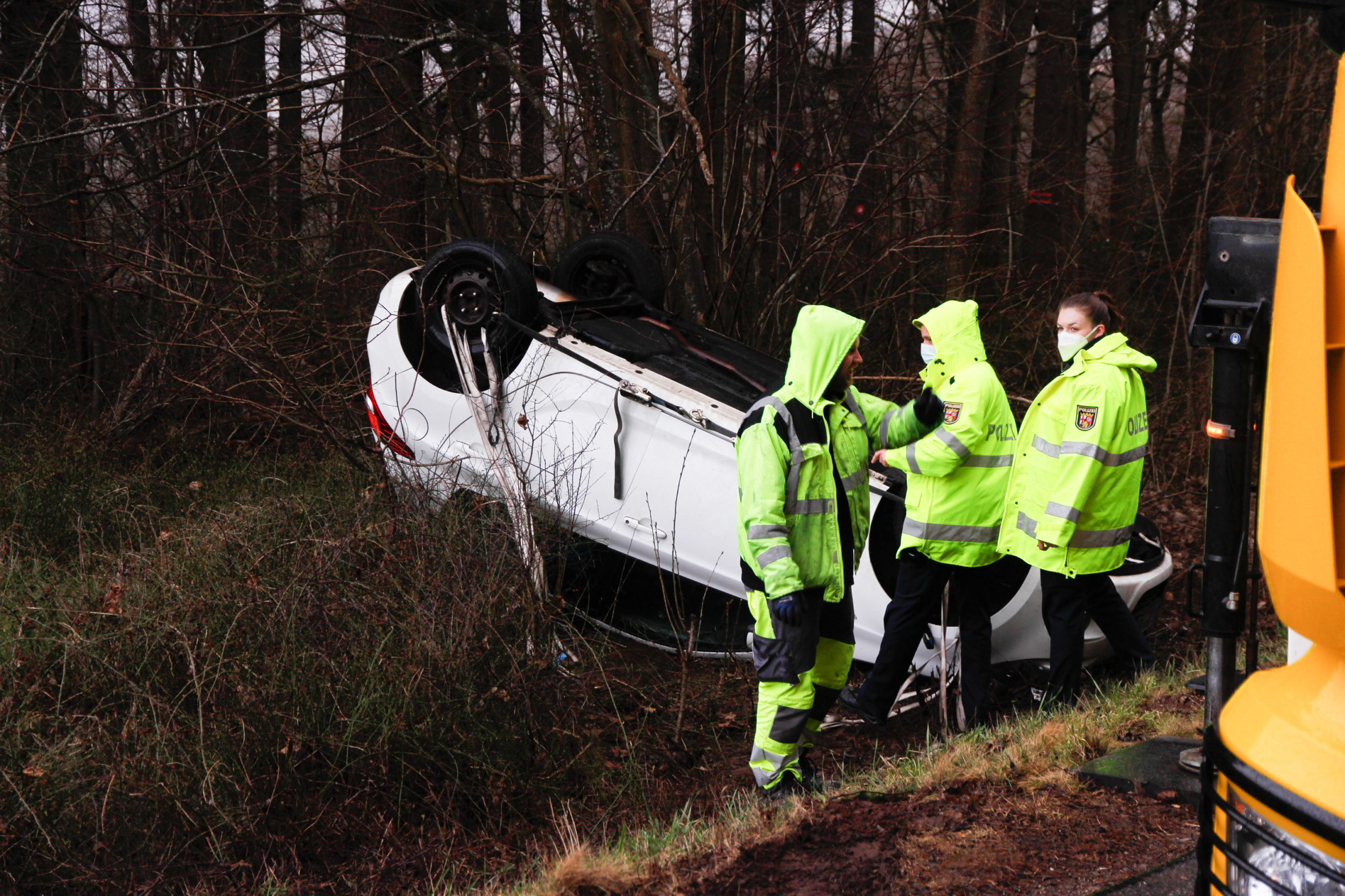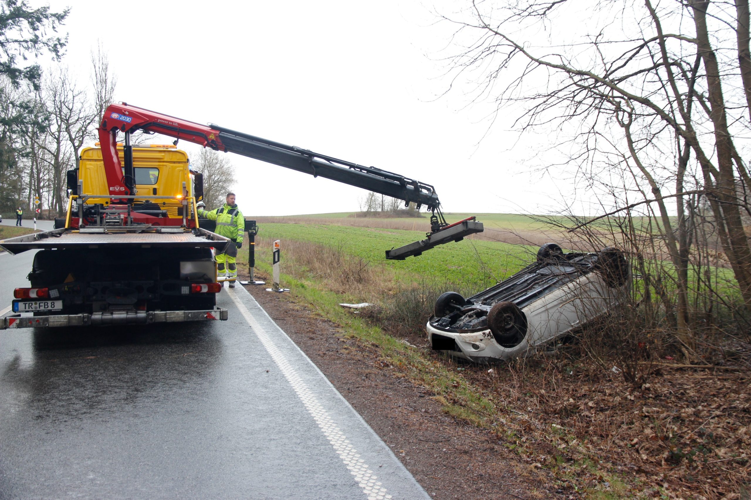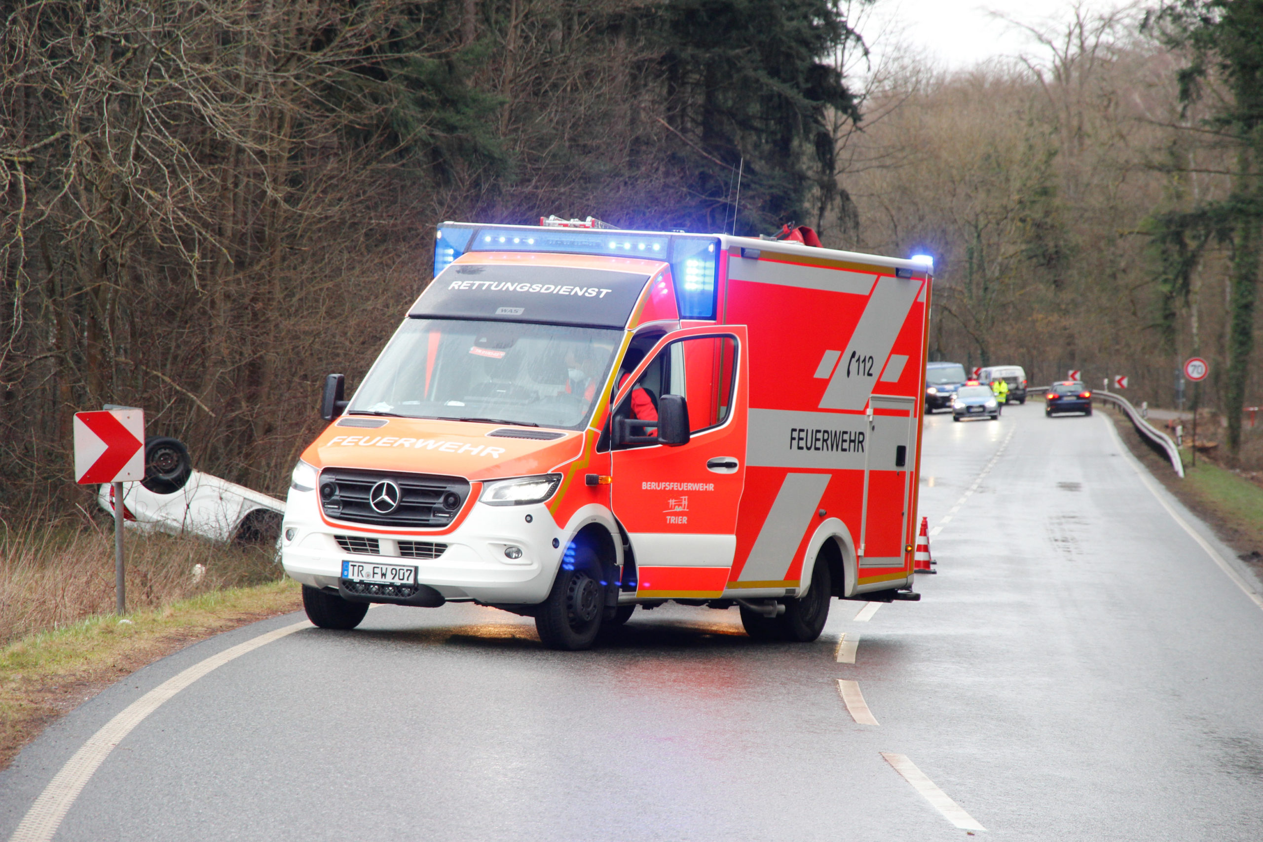 Trier-Feyen. Heute morgen gegen 9.30 Uhr es laut der Leitstelle Trier zu einem Verkehrsunfall auf der B 268 bei Feyen. Ein Honda besetzt mit zwei Personen befuhr die B268 von Pellingen kommend in Richtung Trier. In eine langgezogenen Rechtskurve in Höhe der Abfahrt Niedermennig überschlug sich der PKW und kam kopfüber vermutlich aufgrund überhöhter Geschwindigkeit im Seitenstreifen zum Stillstand.