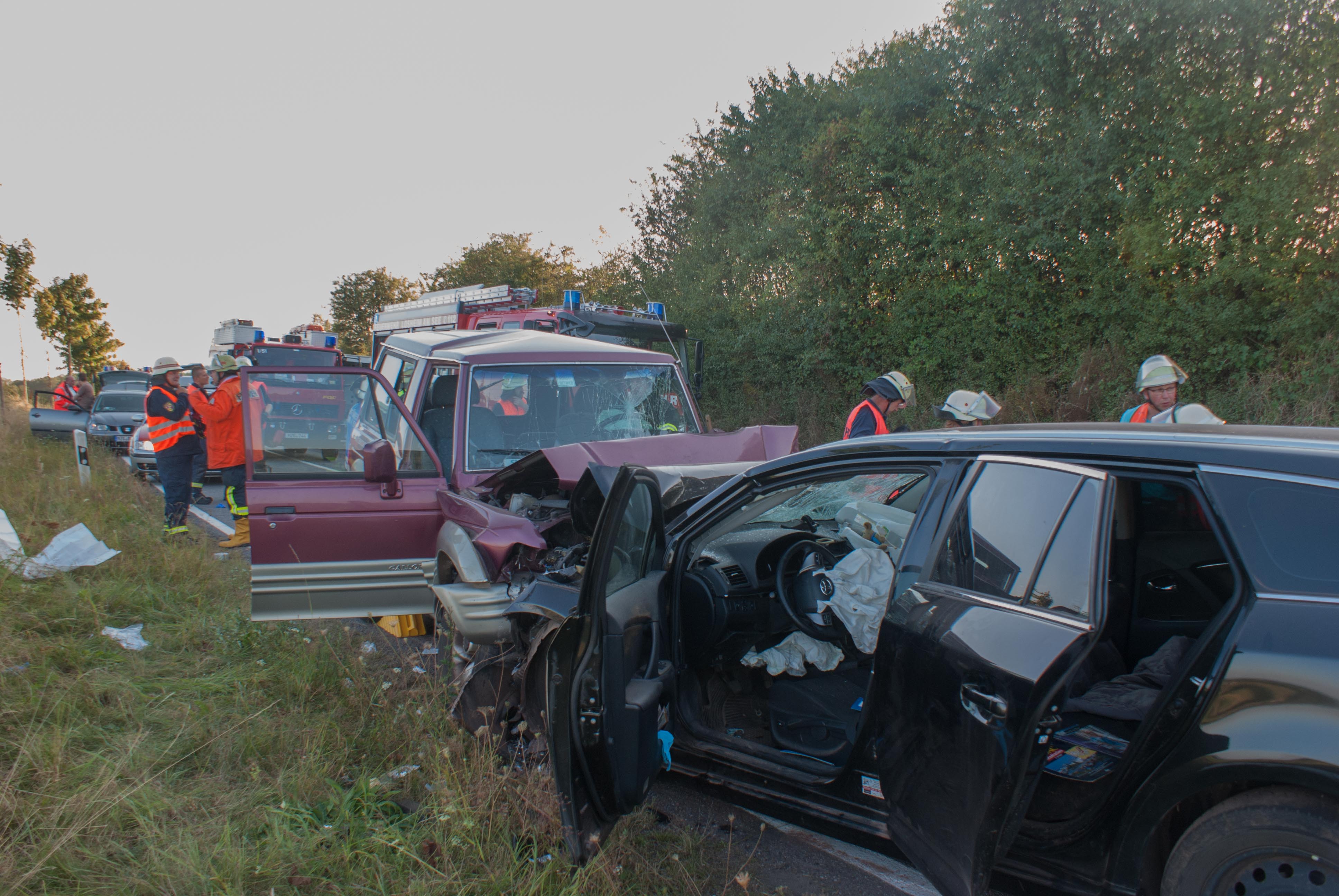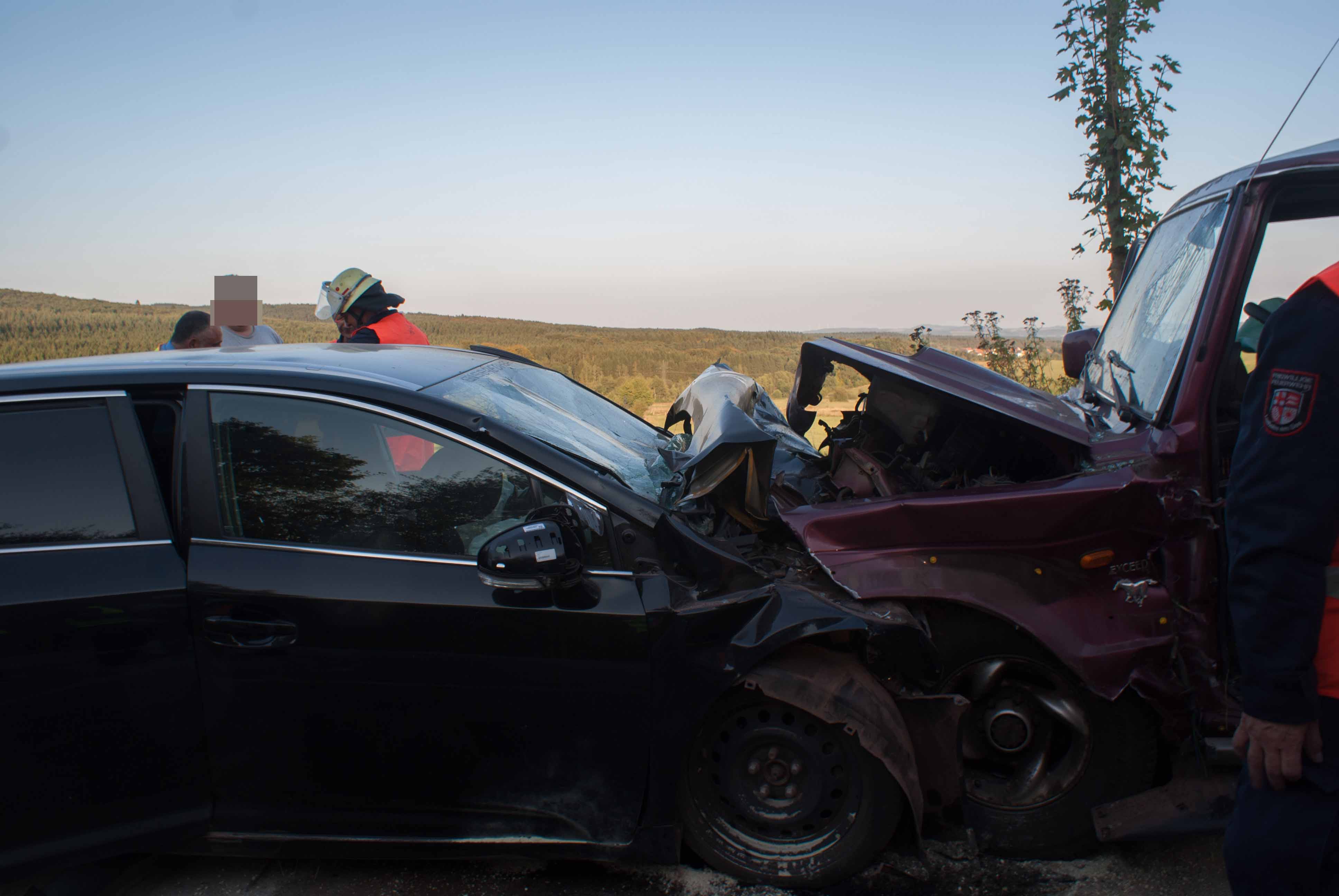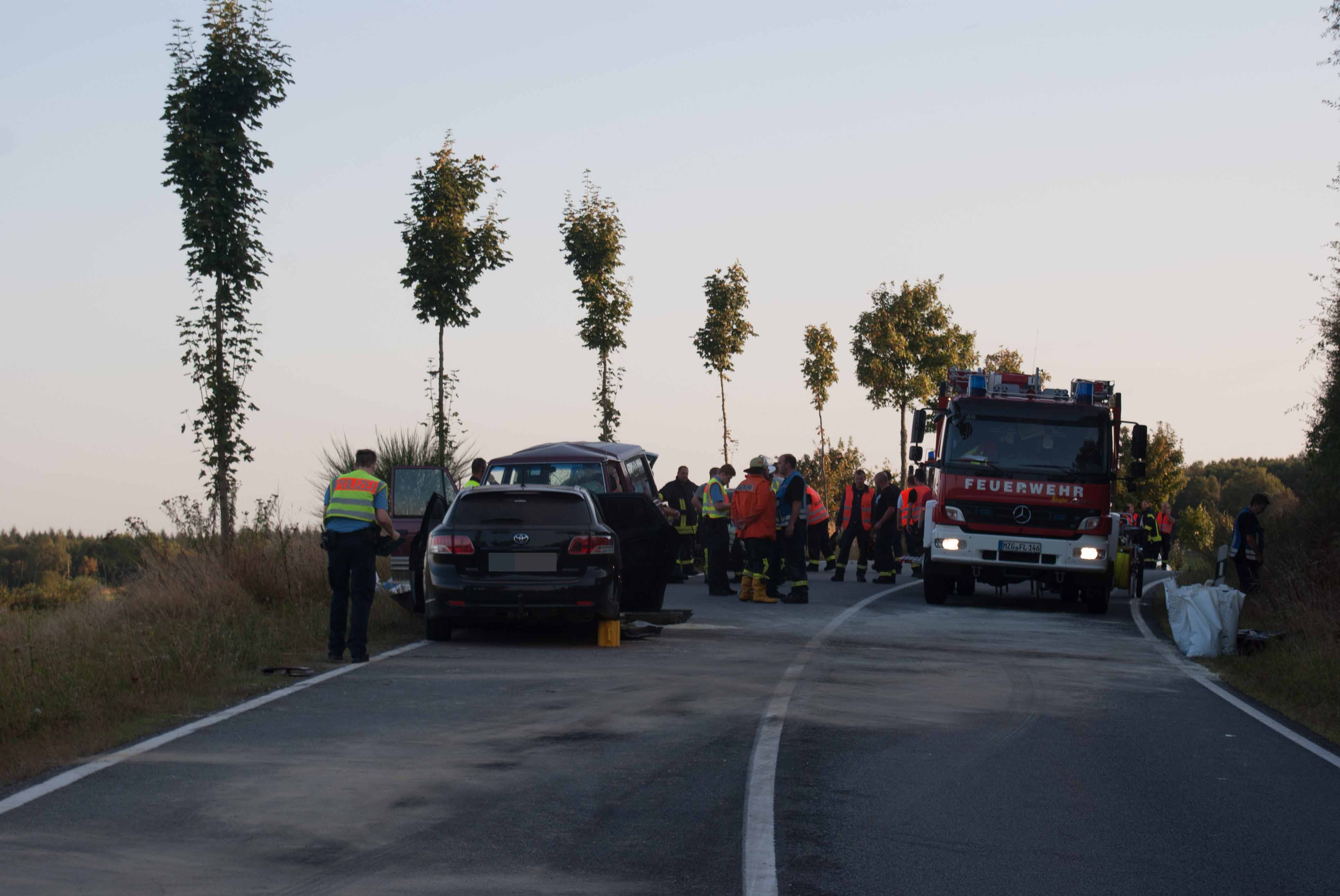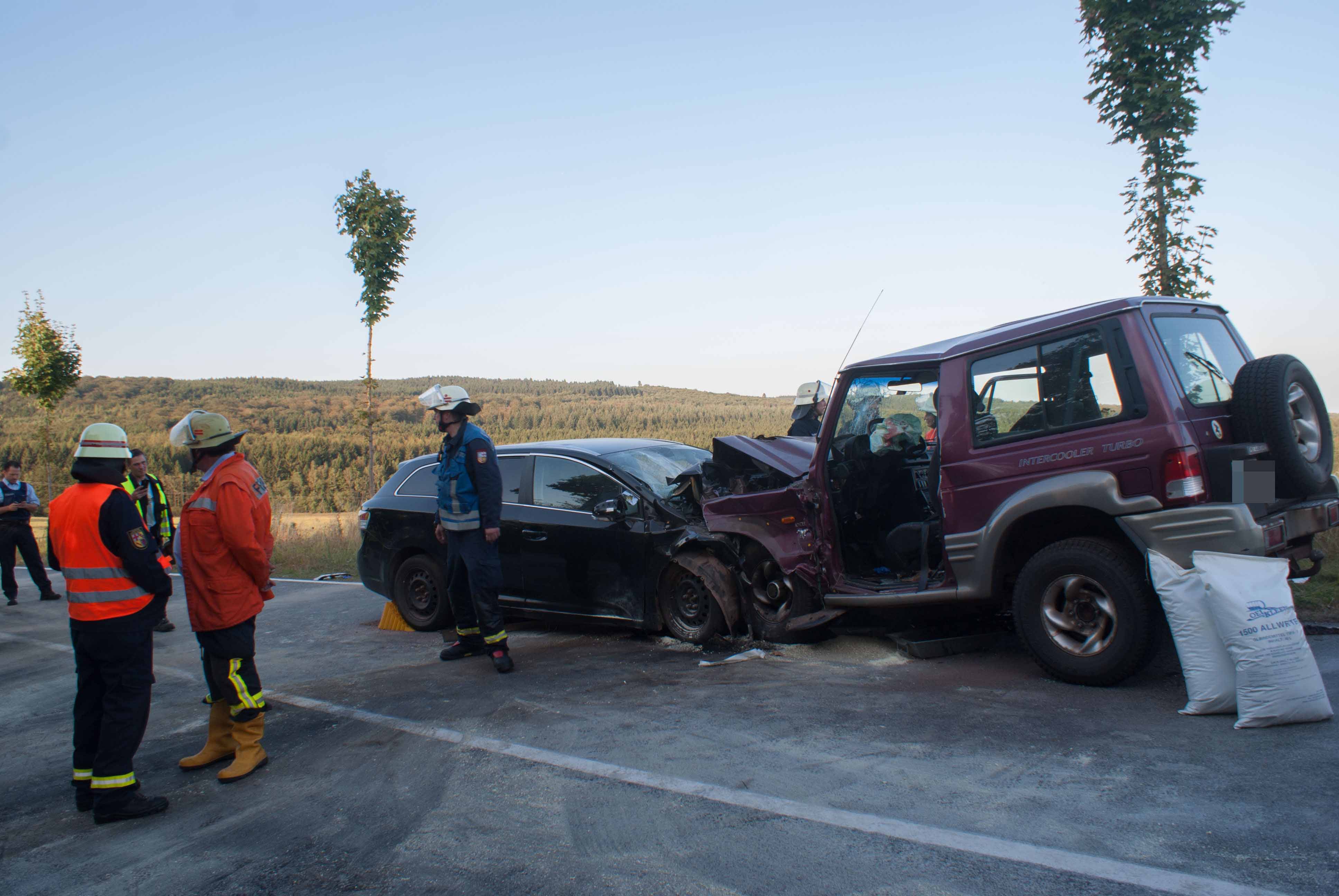 Britten/B268. Gegen 18.00 Uhr kam es in einer langgezogenen Rechtskurve kurz vor Britten zu einem schweren Unfall. Ein Geländewagen und ein Toyota Kombi krachten frontal zusammen. Die Identität der beiden weiblich und männlichen Fahrzeugführer konnten zum Zeitpunkt der Unfallaufnahme noch nicht ermittelt werden. Der aus Richtung Zerf kommende Toyota überfuhr die durchgezogene Mittellinie. Die Fahrerin hatte noch einen Hund mit im Fahrzeug, der unverletzt blieb und seitens der Feuerwehr Losheim am See betreut wurde. Der Fahrer des Geländewagens hatte keine Chance auszuweichen. Beide Fahrer wurden schwer verletzt. Im Einsatz waren die beiden Rettungshubschrauber Christoph 16 und der Air Rescue 3 aus Luxemburg, der Notarzt aus Merzig, die Rettungswagen aus Zerf und Mettlach, die Feuerwehren Losheim am See, Britten, Zerf und Greimerath. Die alarmierten Wehren aus Saarburg und Mandern konnten den Einsatz abrechen. Insgesamt waren 58 Wehrleute aus Losheim und der VG Kell am See im Einsatz. Die B 268 musste zwischen dem Panzhaus und Britten bis in die späten Abendstunden aufgrund der Räumungsarbeiten gesperrt werden. Ein Gutachter wurde zur Einsatzstelle beordert.