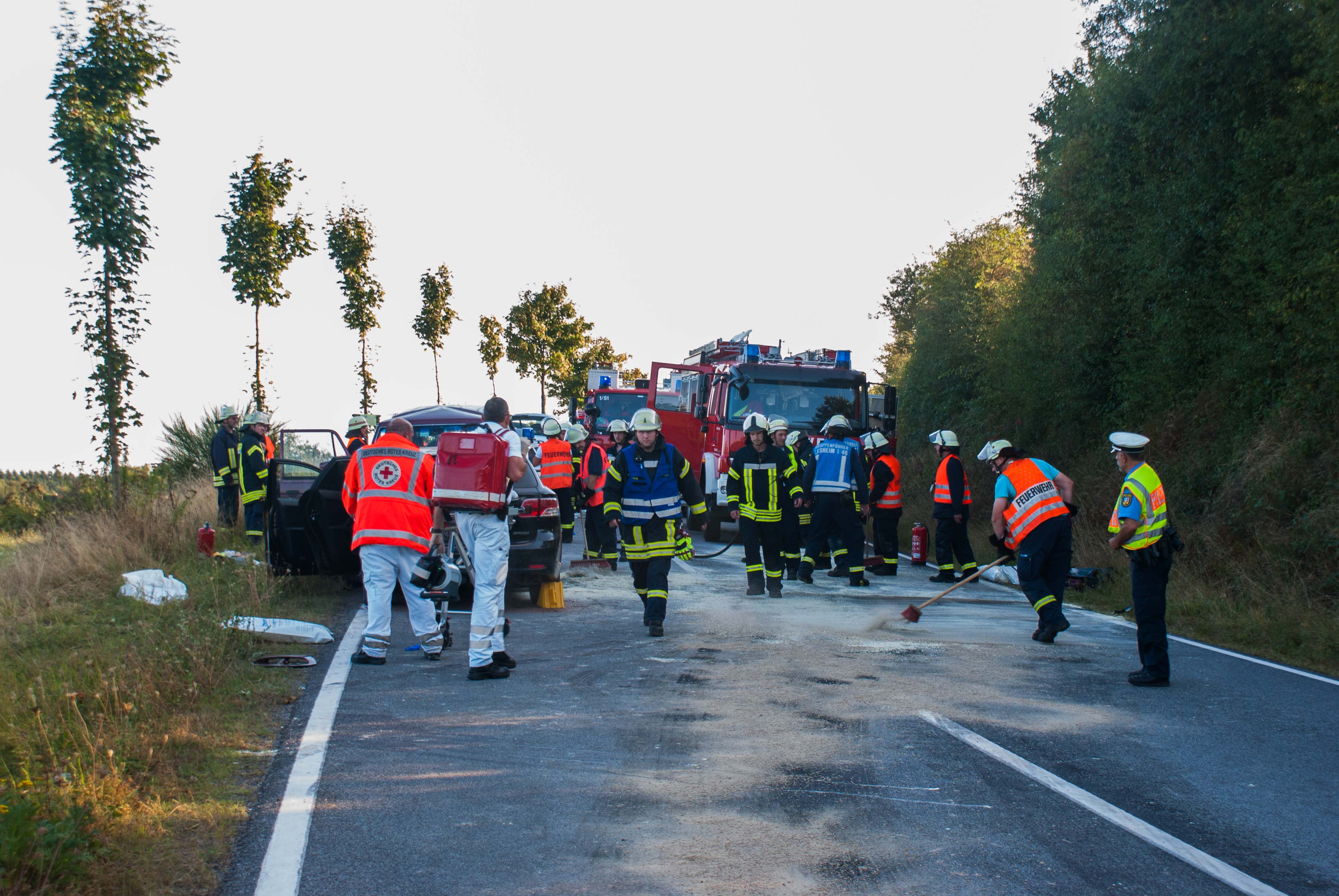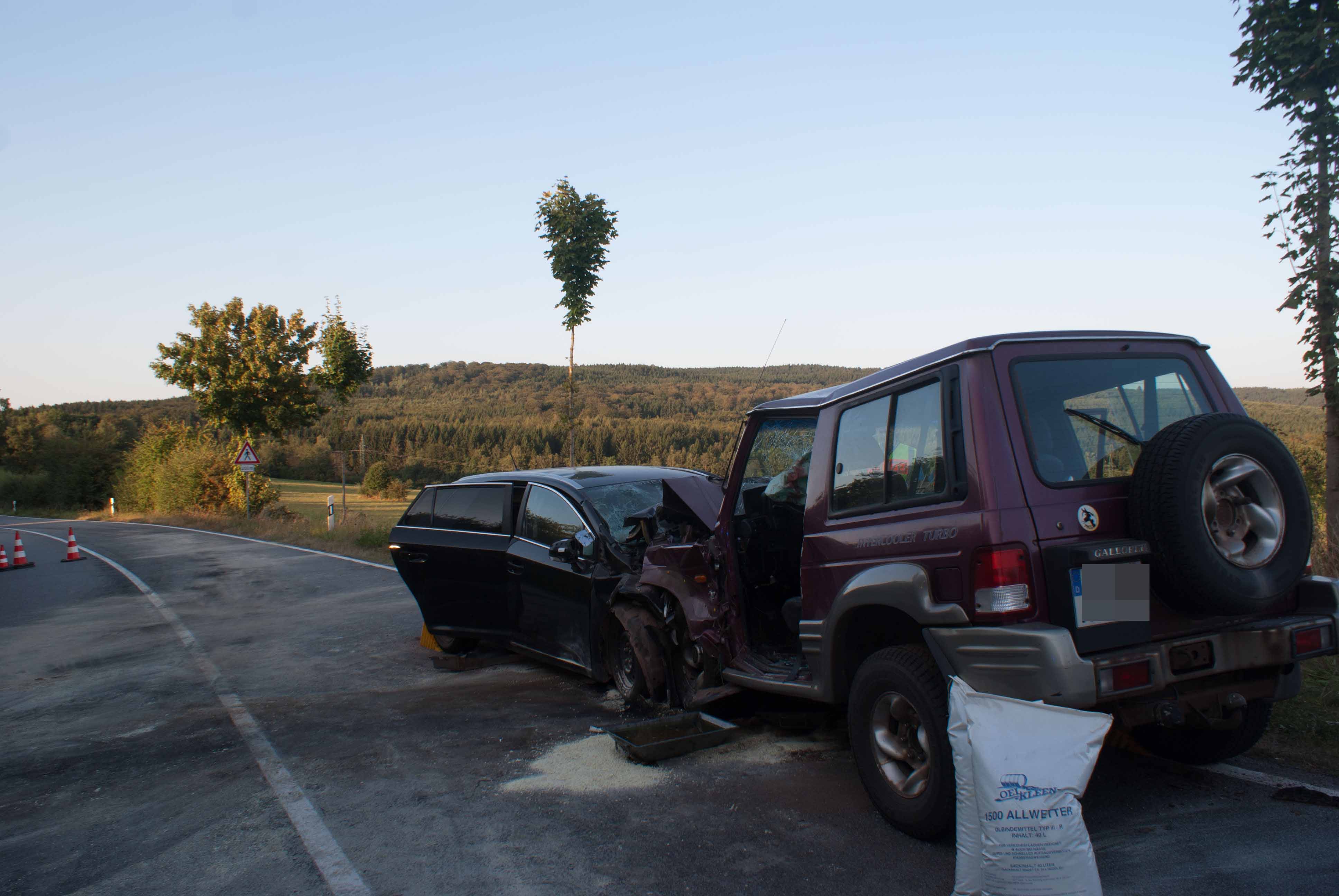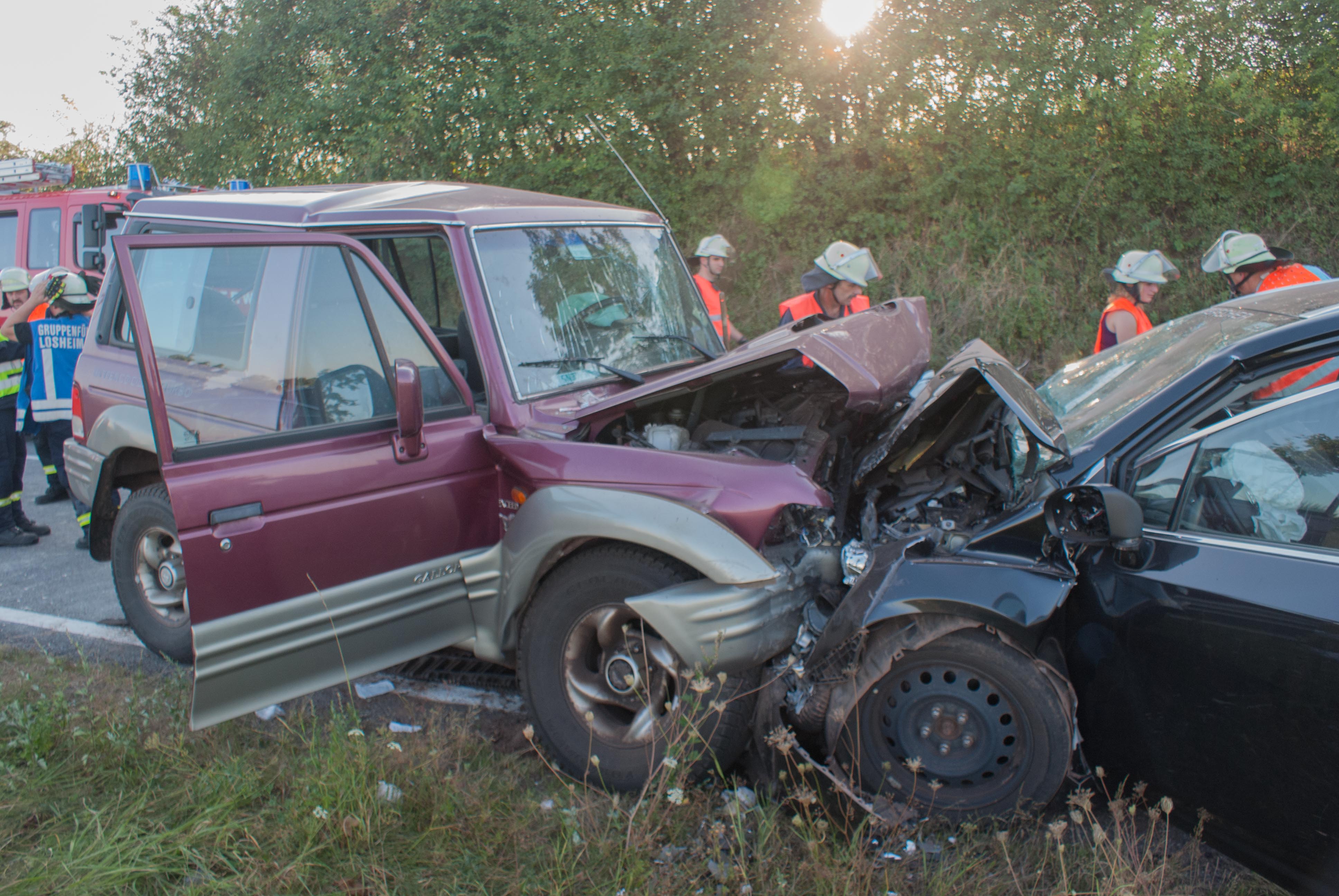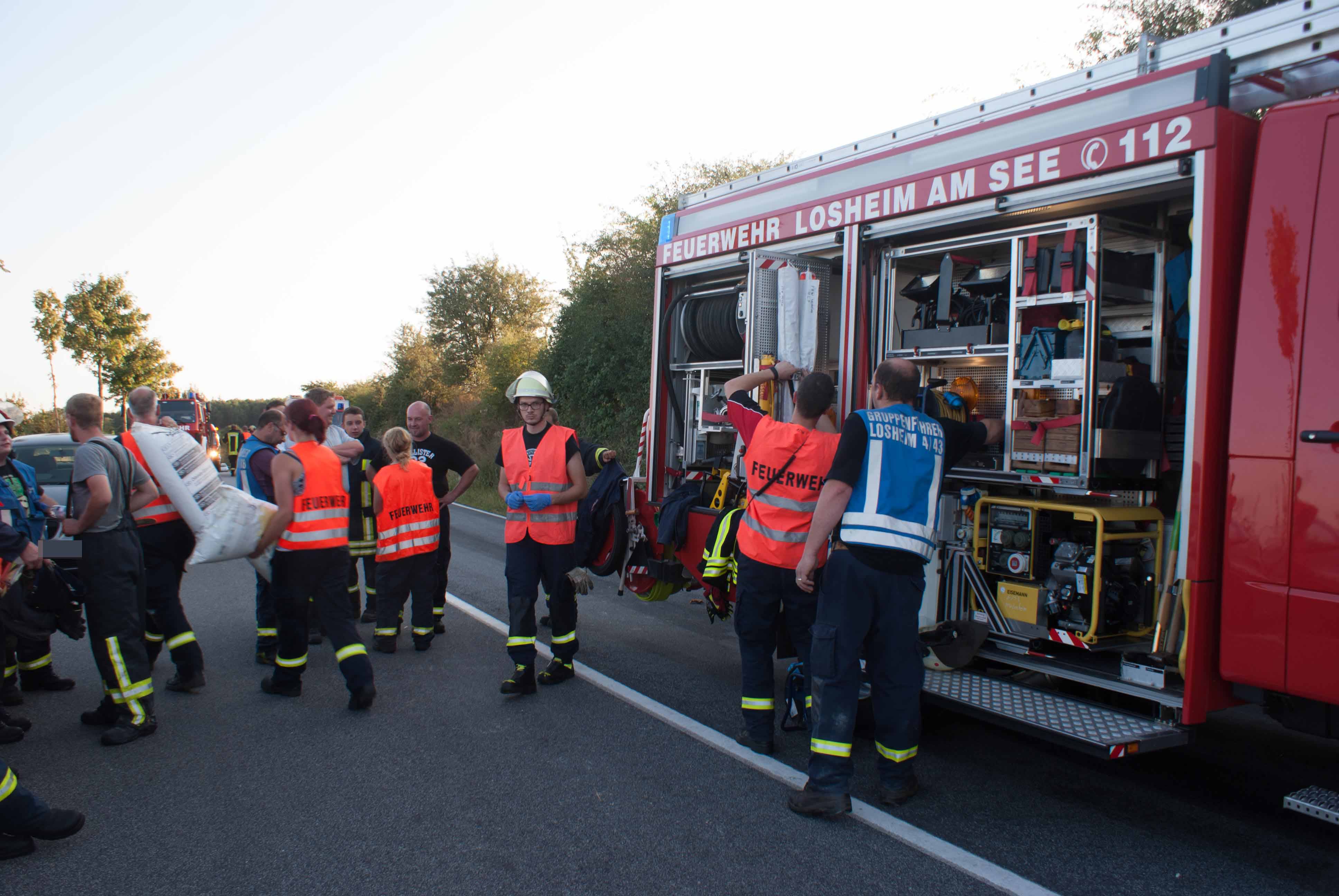 Britten/B268. Gegen 18.00 Uhr kam es in einer langgezogenen Rechtskurve kurz vor Britten zu einem schweren Unfall. Ein Geländewagen und ein Toyota Kombi krachten frontal zusammen. Die Identität der beiden weiblich und männlichen Fahrzeugführer konnten zum Zeitpunkt der Unfallaufnahme noch nicht ermittelt werden. Der aus Richtung Zerf kommende Toyota überfuhr die durchgezogene Mittellinie. Die Fahrerin hatte noch einen Hund mit im Fahrzeug, der unverletzt blieb und seitens der Feuerwehr Losheim am See betreut wurde. Der Fahrer des Geländewagens hatte keine Chance auszuweichen. Beide Fahrer wurden schwer verletzt. Im Einsatz waren die beiden Rettungshubschrauber Christoph 16 und der Air Rescue 3 aus Luxemburg, der Notarzt aus Merzig, die Rettungswagen aus Zerf und Mettlach, die Feuerwehren Losheim am See, Britten, Zerf und Greimerath. Die alarmierten Wehren aus Saarburg und Mandern konnten den Einsatz abrechen. Insgesamt waren 58 Wehrleute aus Losheim und der VG Kell am See im Einsatz. Die B 268 musste zwischen dem Panzhaus und Britten bis in die späten Abendstunden aufgrund der Räumungsarbeiten gesperrt werden. Ein Gutachter wurde zur Einsatzstelle beordert.