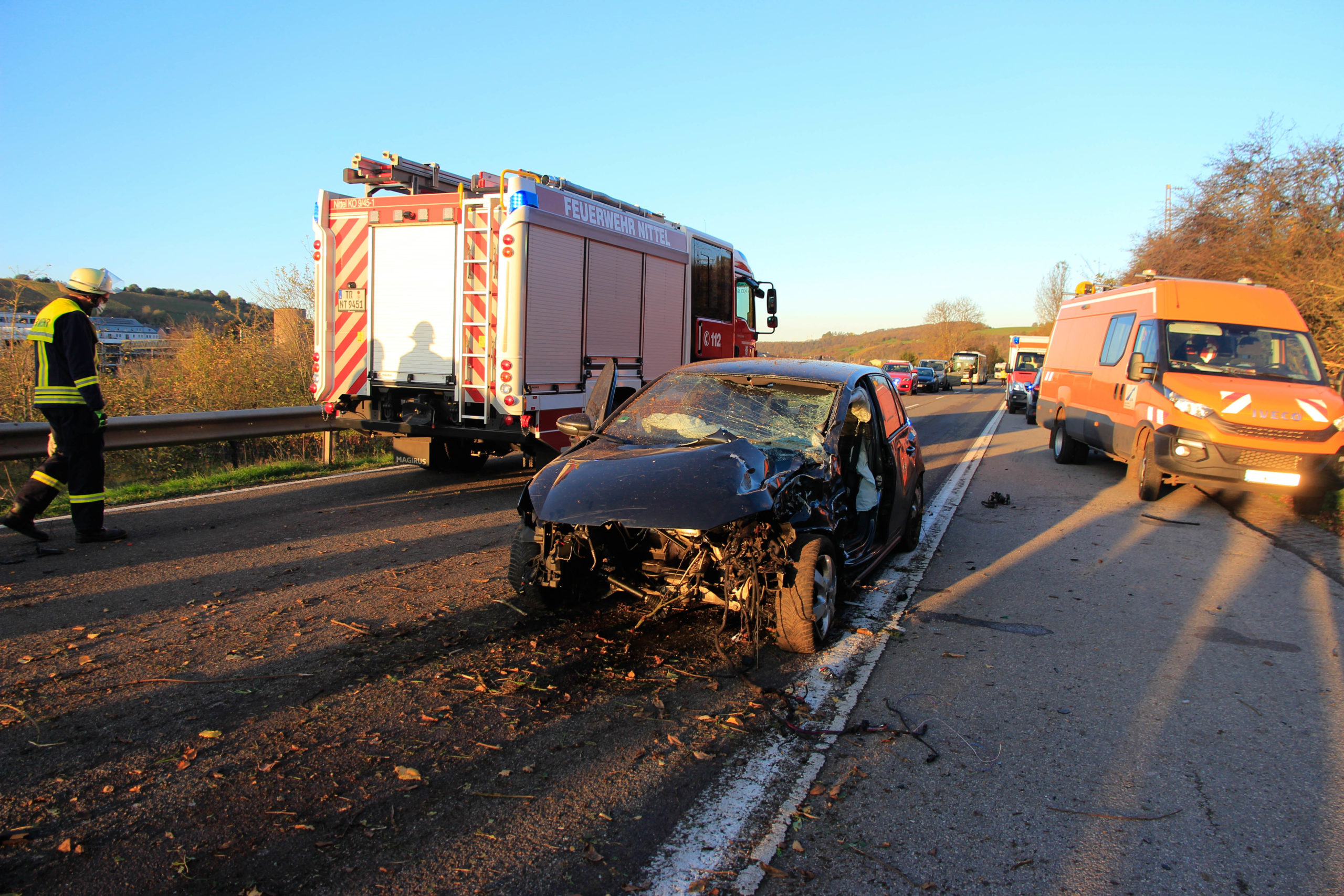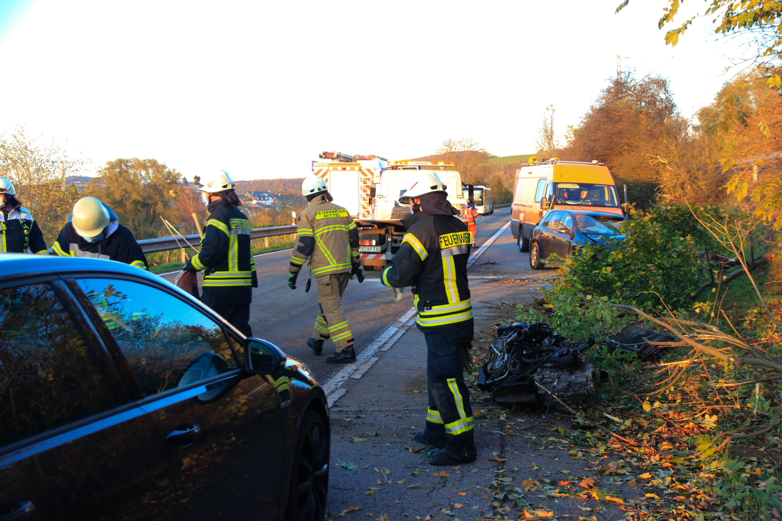 Dabei wurde der Motor komplett herausgerissen und in Fahrtrichtung Temmels gegen die Leitplanke geschleudert. Der 20 jährige wurde eingeklemmt und musste mit schweren Gerät der Feuerwehr aus dem Fahrzeug befreit werden. Der 20 jährige Unfallverursacher wurde hierbei schwer verletzt. Die beiden anderen Fahrzeugführer wurden leicht verletzt, wobei beide in Krankenhäuser nach Trier verbracht wurden. Die B 419 war bis circa 17.00 Uhr voll gesperrt.
