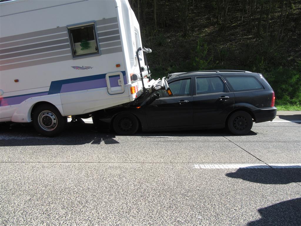 Aufgrund einer aktuellen Baustelle zwischen den Anschlussstellen Föhren und Salmtal staute sich der Verkehr auf der BAB A-1 leicht zurück. Zunächst konnte ein 54-jähriger Lkw-Fahrer mit seinem Sattelzug am Stauende noch anhalten. Ein 77-jähriger Fahrer eines Wohnmobils erkannte das Stauende zu spät und fuhr infolge zu geringem Sicherheitsabstand auf den stehenden Sattelzug vor sich auf. Durch den heftigen Aufprall wurde der Fahrer des Wohnmobils in seinem Fzg eingeklemmt und später schwer verletzt geborgen und in das Krankenhaus nach Wittlich verbracht. Ebenfalls durch den heftigen Aufprall wurde das Heck des Wohnmobils in die Höhe katapultiert. Eine dem Wohnmobil nachfolgende 49-jährige Pkw-Fahrerin erkannte den Unfall ebenfalls zu spät und fuhr unter das herunterfallende Heck des Wohnmobils. Hierdurch wurde die Fahrerin und der Beifahrer des Pkw leicht verletzt und in ein Krankenhaus in Trier verbracht.