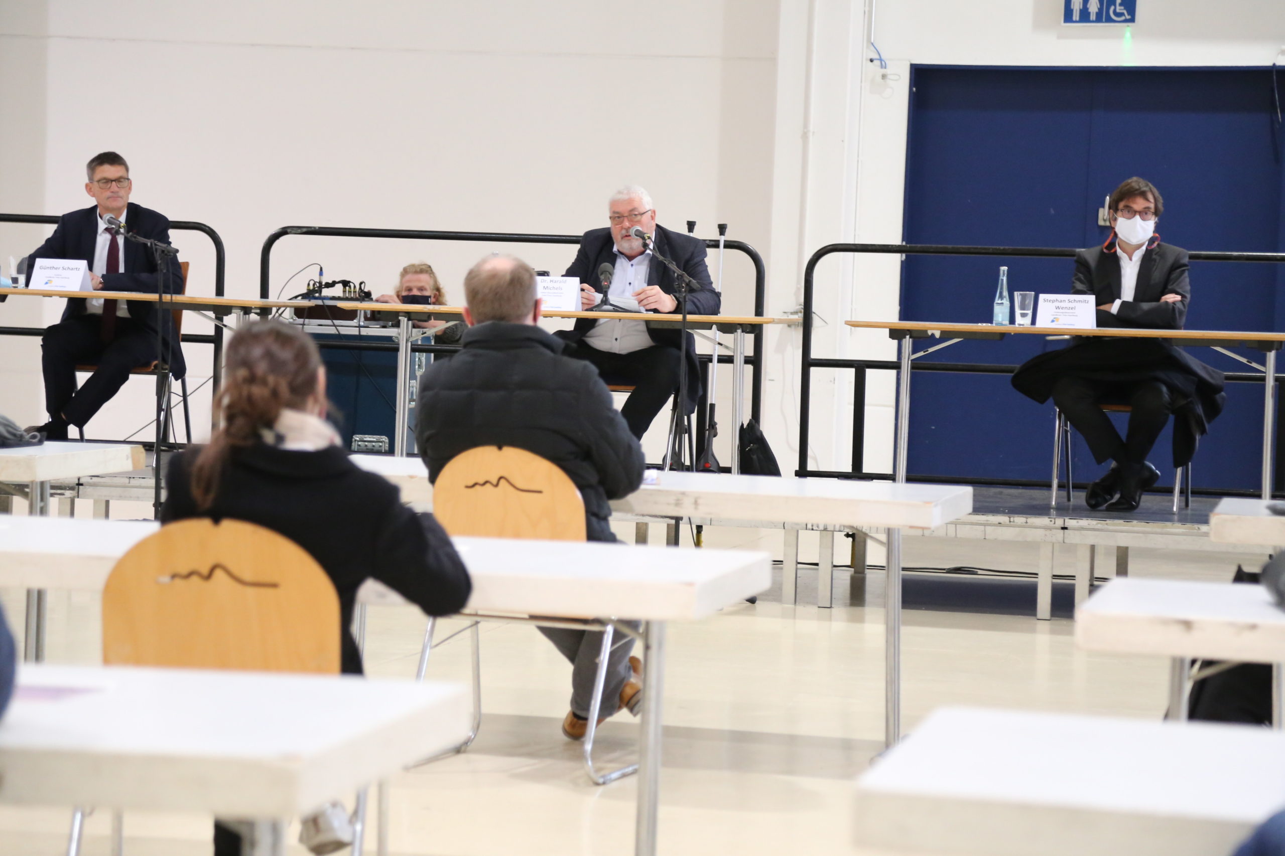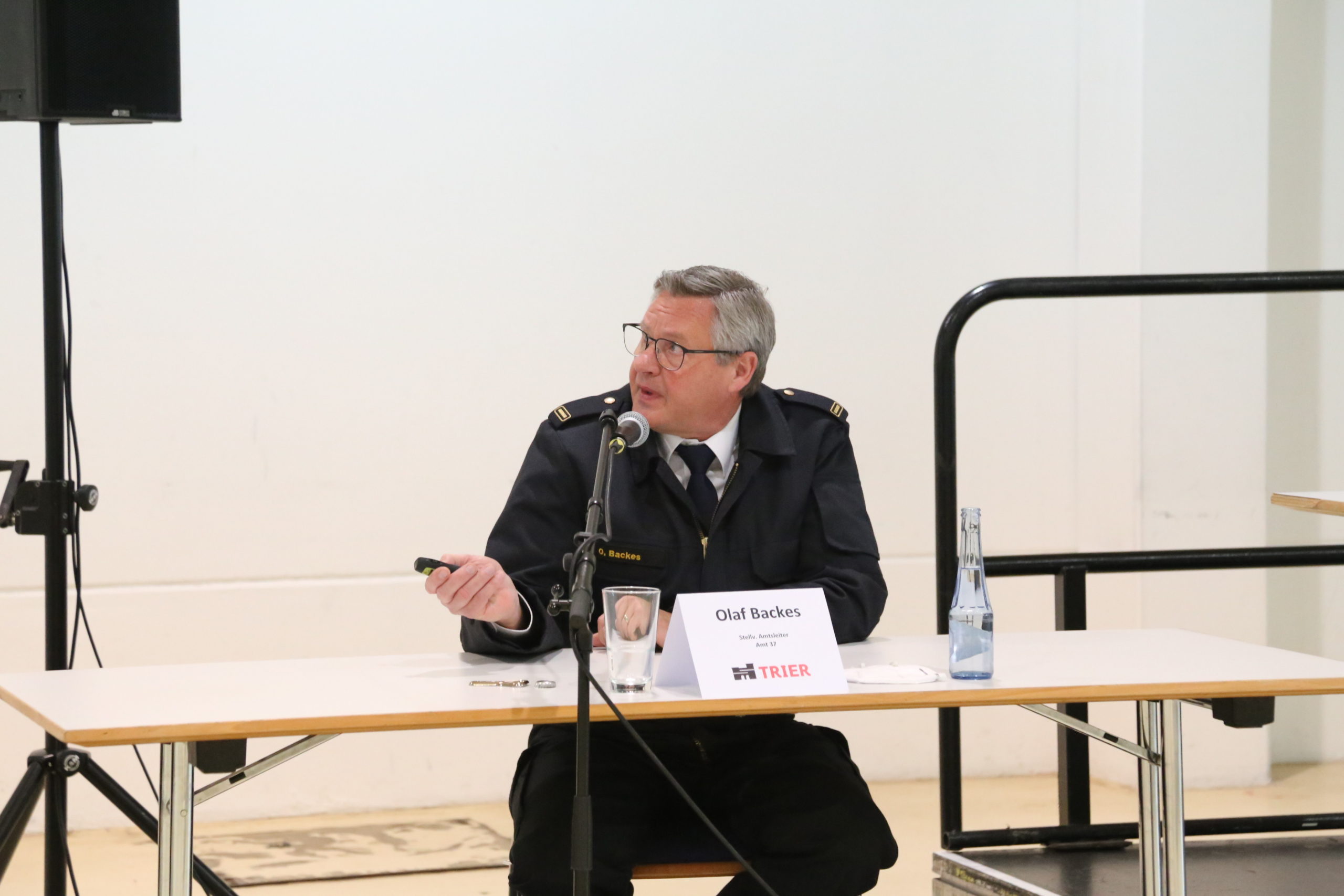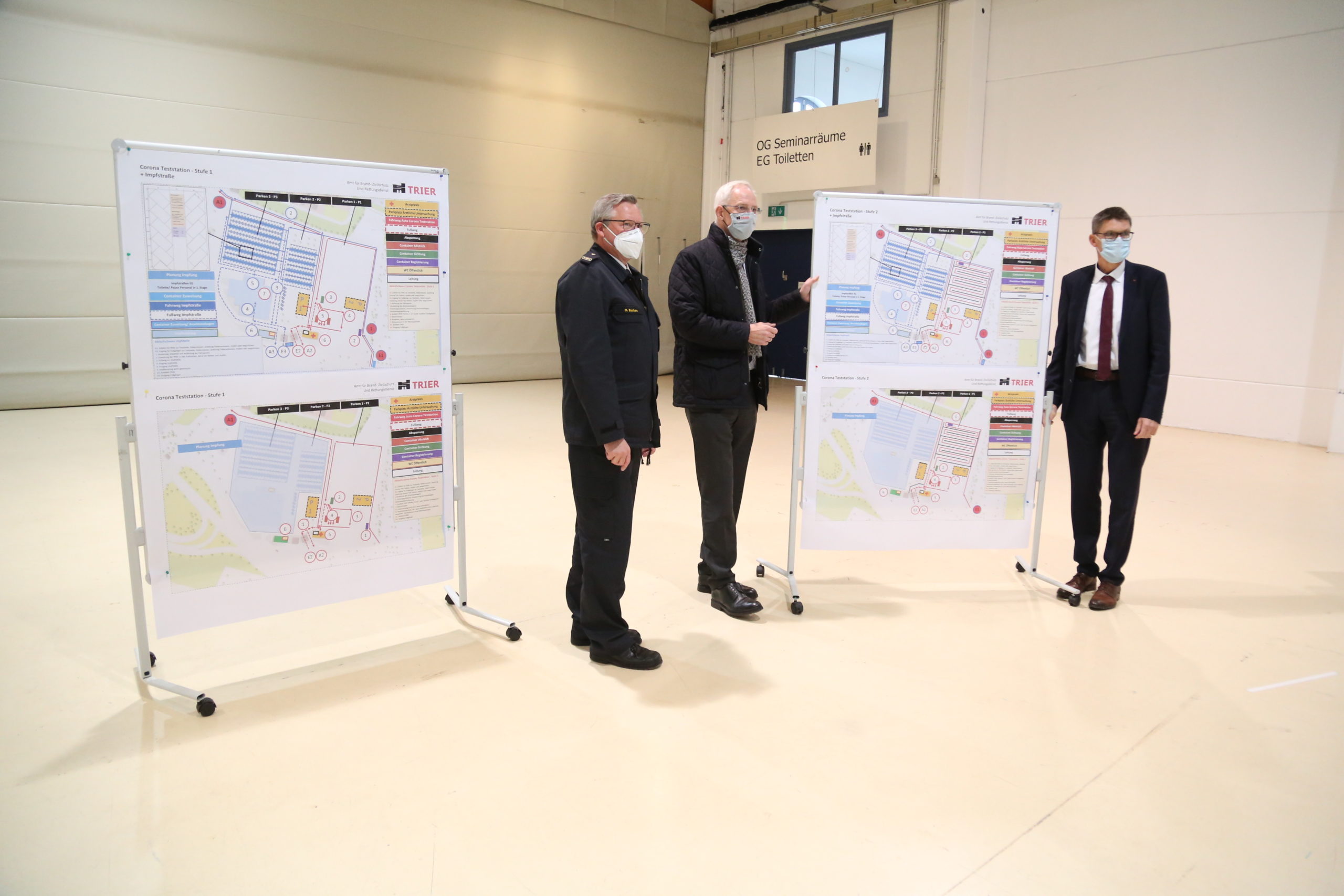 Olaf Backes, stellvertretender Leiter der Trierer Berufsfeuerwehr, erläuterte den zahlreichen Pressevertretern, dass – vorausgesetzt der Impfstoff steht zur Verfügung – am 15. Dezember mit acht sogenannten „Impfstraßen“ gestartet wird. Bei Bedarf sind bis zu 16 möglich. Somit sind theoretisch bis zu 5000 Impfungen pro Tag möglich. Geöffnet werden könnte das Zentrum im Extremfall im Zwei-Schichtbetrieb zwischen 6 und 22 Uhr, es würden dann rund 80 Menschen im Einsatz sein.