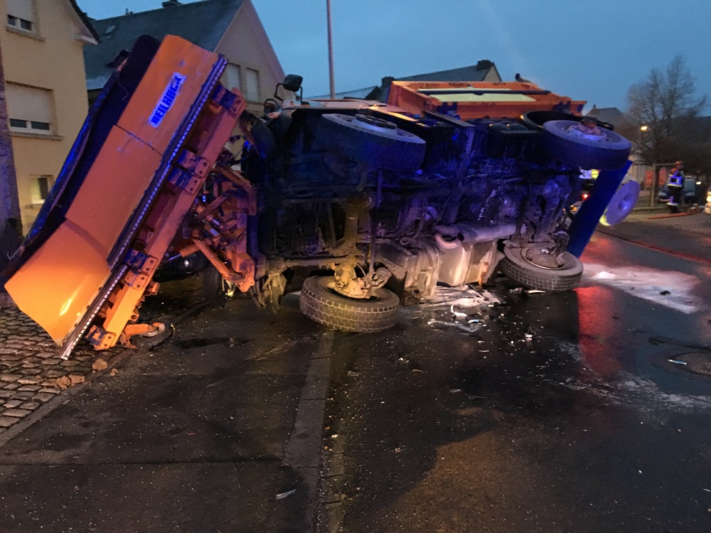 Es entstand ein hoher Materialschaden. Die drei Insassen sowie der Streudienstwagenfahrer wurden mit leichten Verletzungen ins Krankenhaus gebracht.