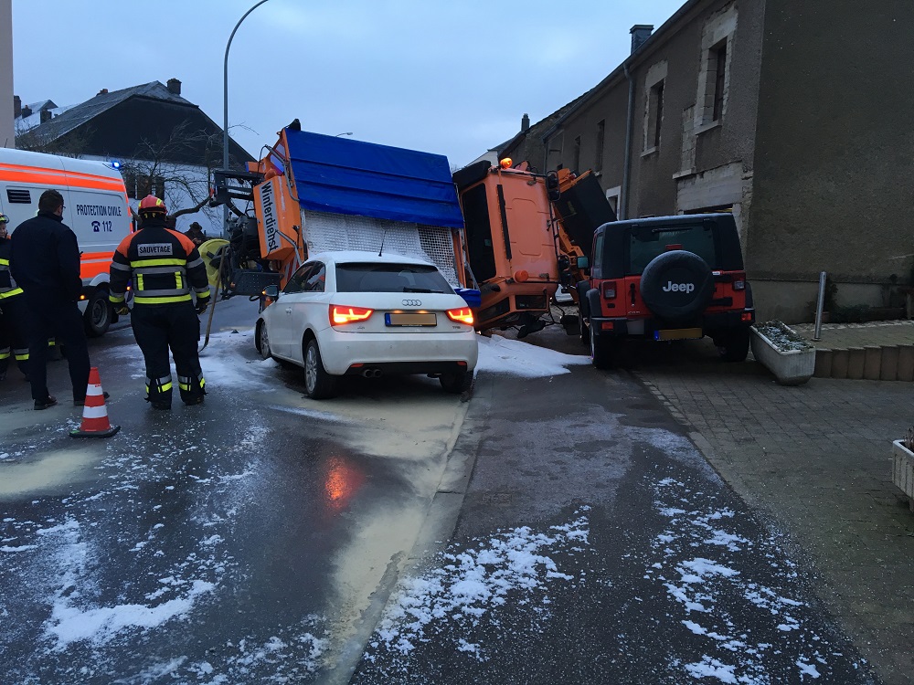 In einer Kurve verlor heute Morgen ein Streudienstwagenfahrer aufgrund der Straßenglätte die Kontrolle über sein Gefährt. Der Wagen geriet ins Schleudern und wurde auf die Gegenfahrbahn gesteuert. Hierbei kam es zu einer Kollision mit zwei abgestellten Fahrzeugen. Zu einem weiteren Zusammenstoß kam es mit einem entgegenkommenden Fahrzeug, in welchem sich insgesamt drei Insassen befanden.
