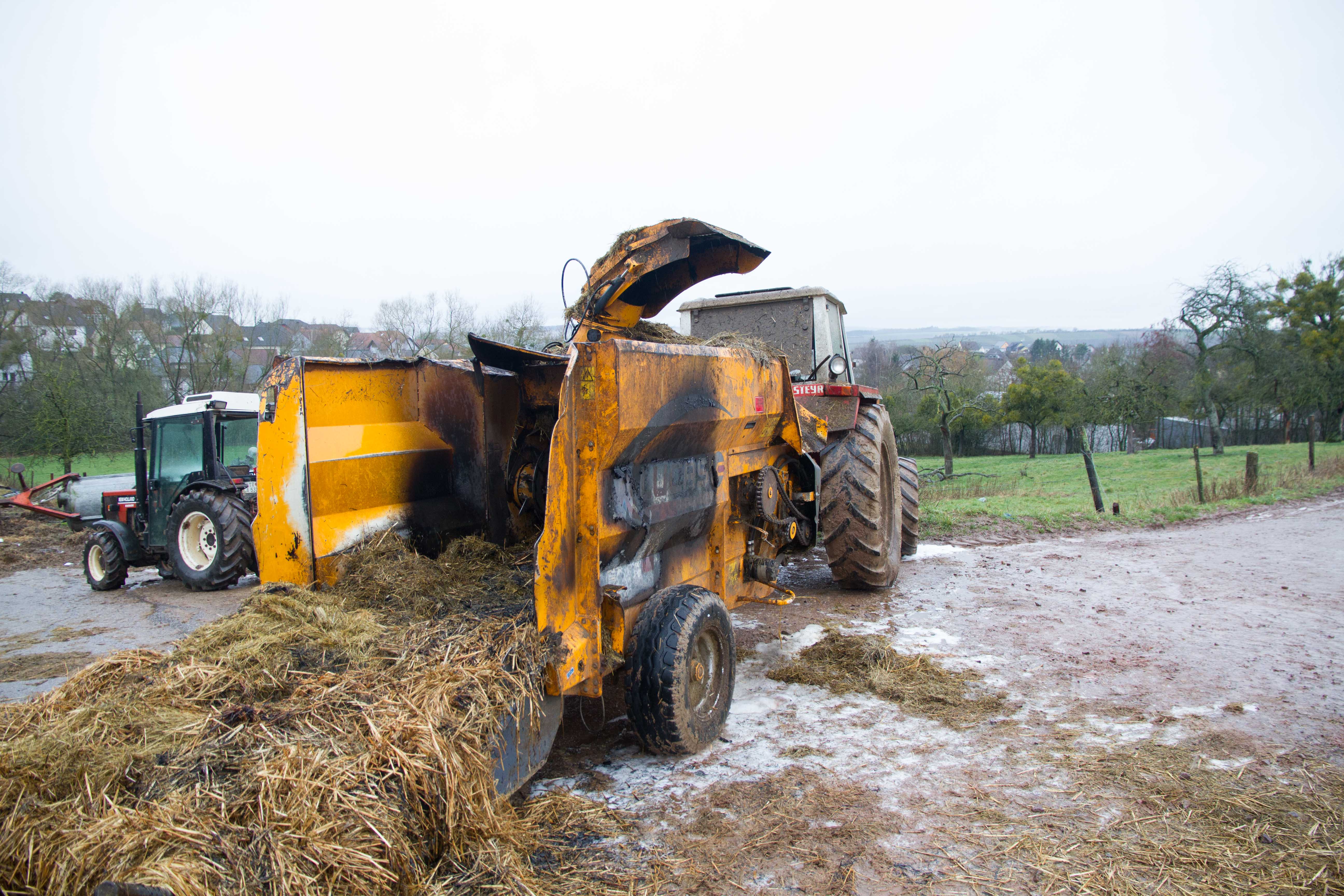 Wincheringen.Gegen 10.40 Uhr heute Vormittag wurde ein Fahrzeugvollbrand in einem landwirtschaftlichen Betrieb in Wincheringen gemeldet. Ein Strohballenhecksler hatte während des Betriebes den darin befindlichen Strohballen durch einen technische Defekt in Brand gesetzt. Da dieser landwirtschaftliche Betrieb in unmittelbarer Nähe des Gerätehauses der FFW Wincheringen lag, konnte die landwirtschaftliche Maschine durch die Feuerwehr Wincheringen schnell gelöscht werden. Vorsorglich wurde dennoch das TLF 4000 der Feuerwehr Saarburg alarmiert. An dem Hecksler entstand ein erheblicher Schaden den ein Gutachter bewerten muss. Im Einsatz waren die Feuerwehren Wincheringen, die FEZ Saarburg, der Rettungswagen aus Saarburg sowie die Polizeiinspektion Saarburg.