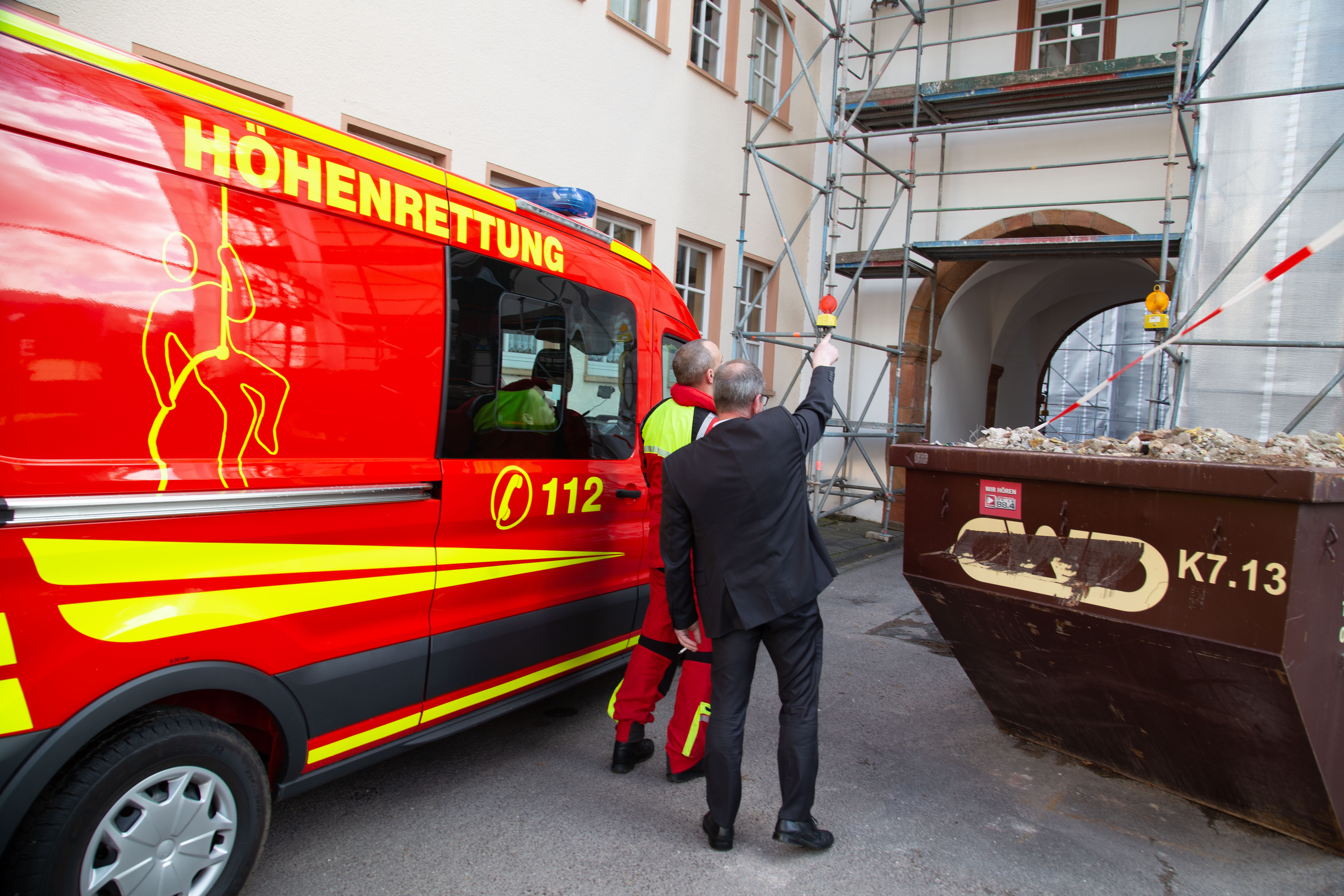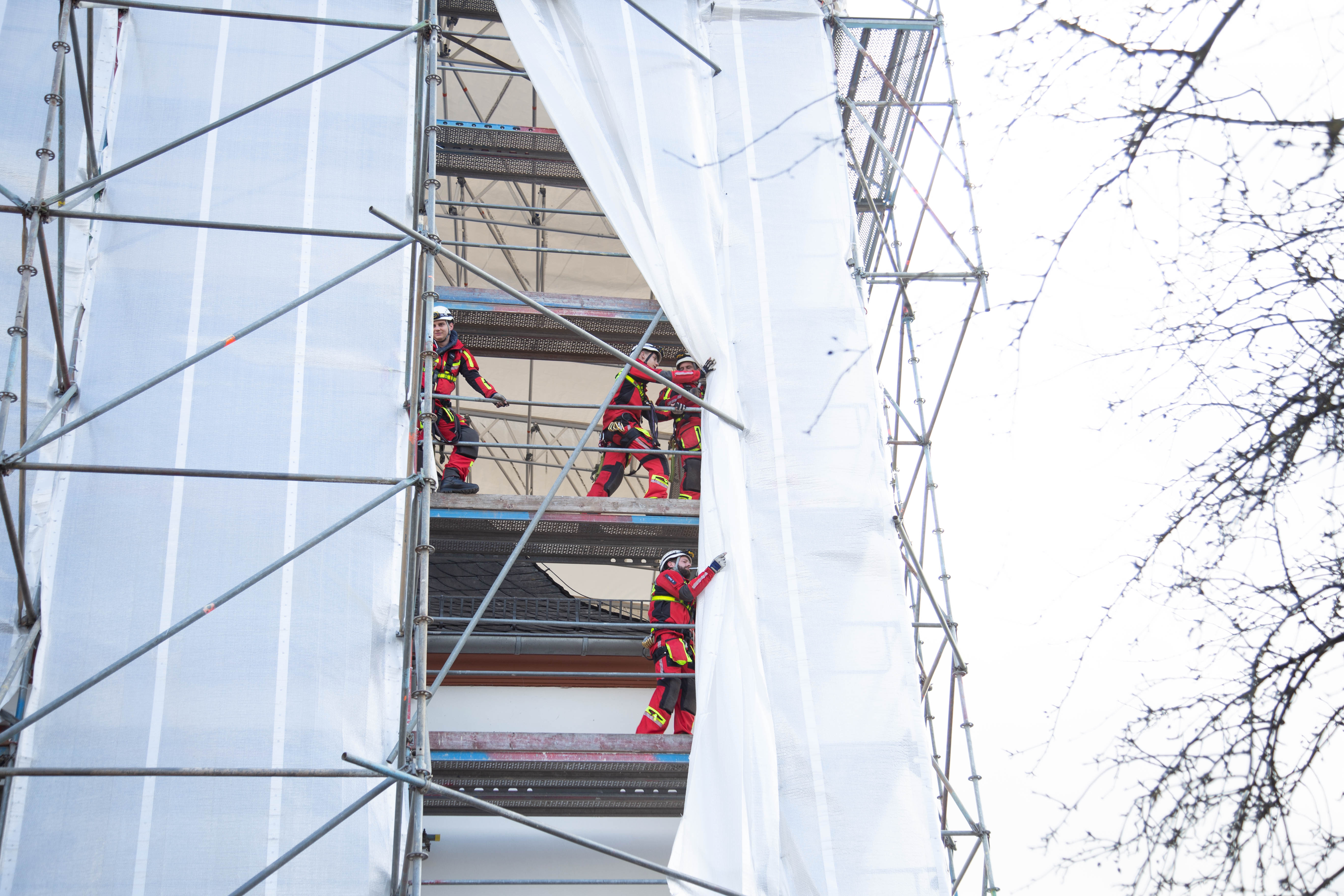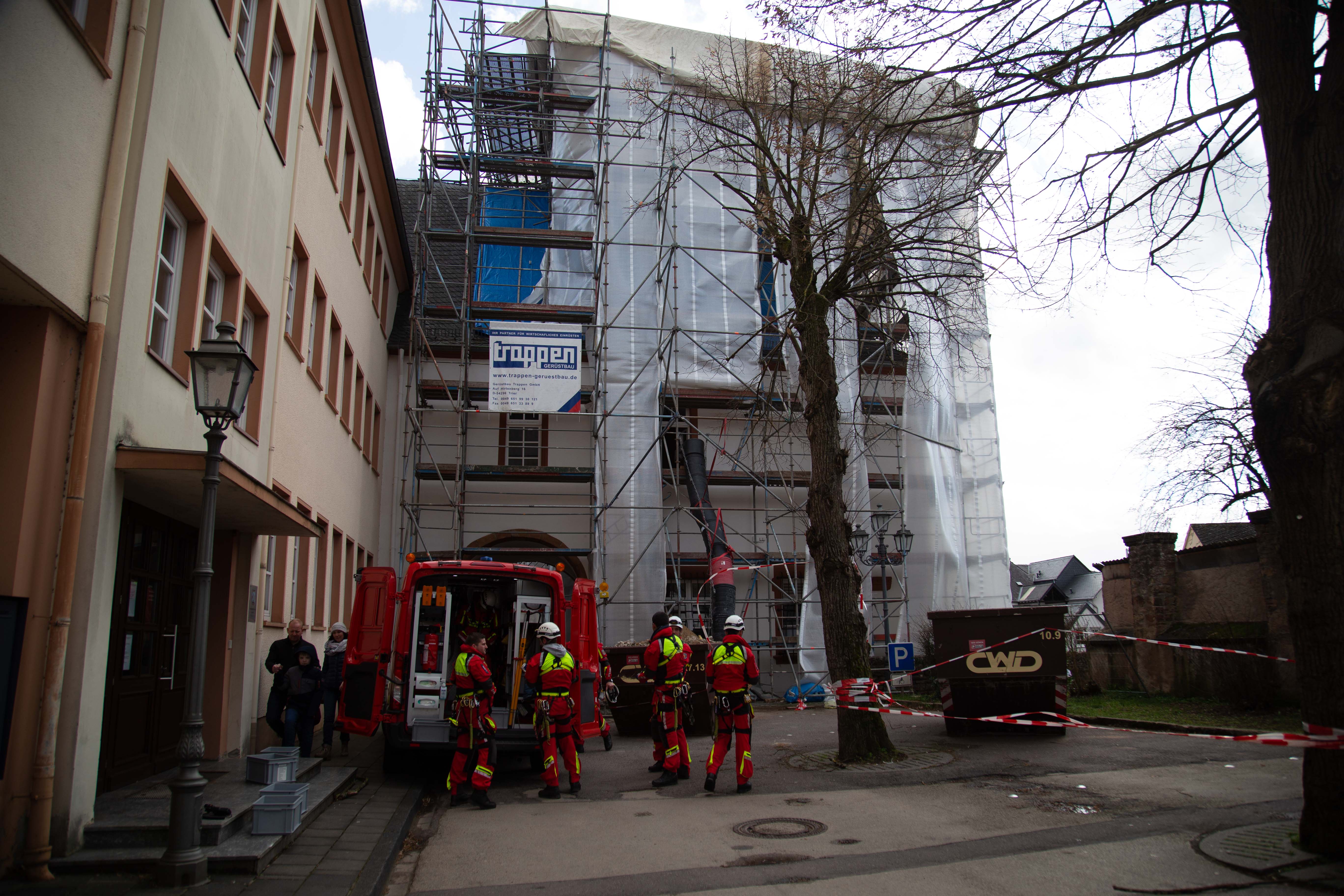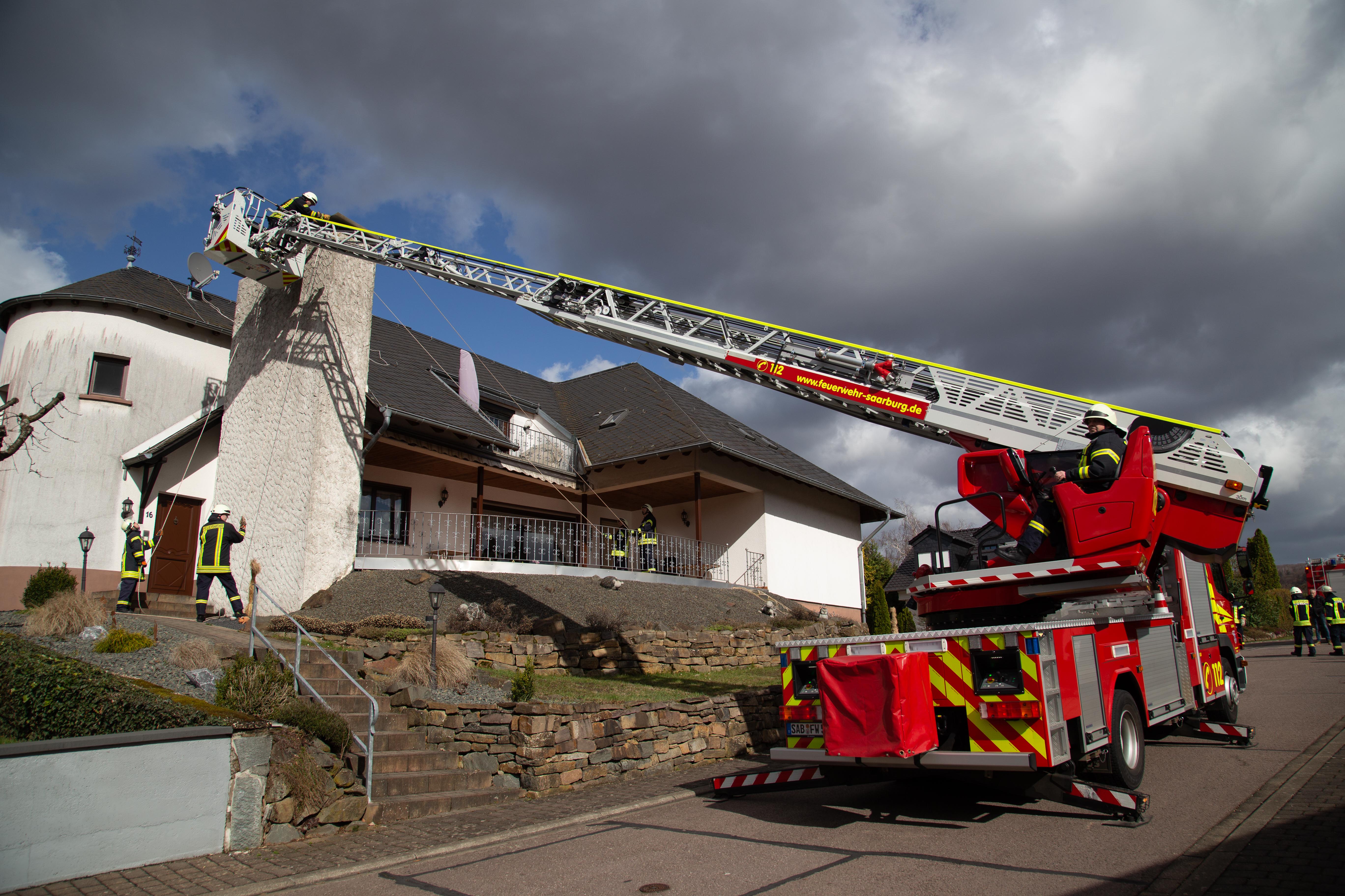Am Nachmittag wurde die Höhenrettung der Feuerwehr Beurig auf die Verbandsgemeindeverwaltung auf dem Schlossberg in Saarburg alarmiert. Bei dem sich im Wiederaufbau befindenden Bauwerk haben sich Teile der Abdeckung gelöst. Die Plane musste von den Höhenretter wieder befestigt werden und größere Schäden zu verhindern. Erschwert wurde die Arbeit durch di teils extremen Windböen.