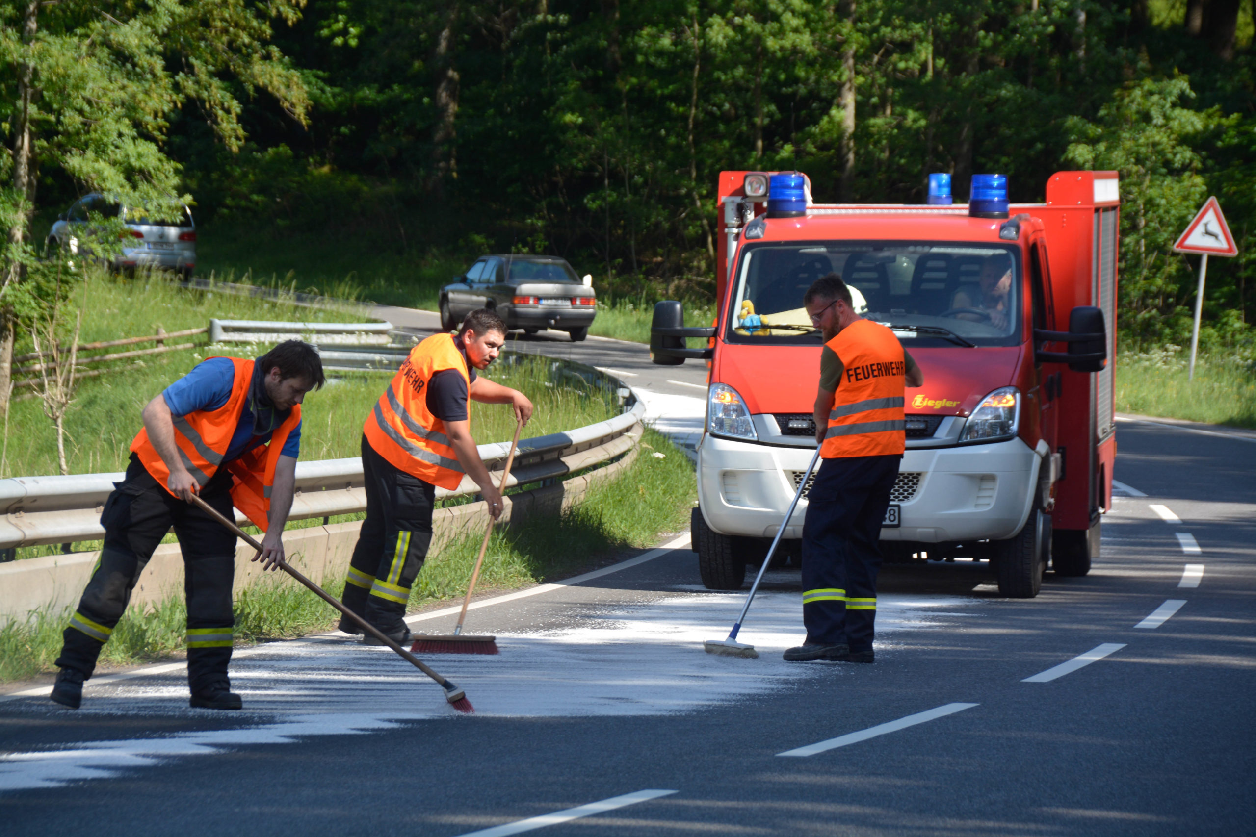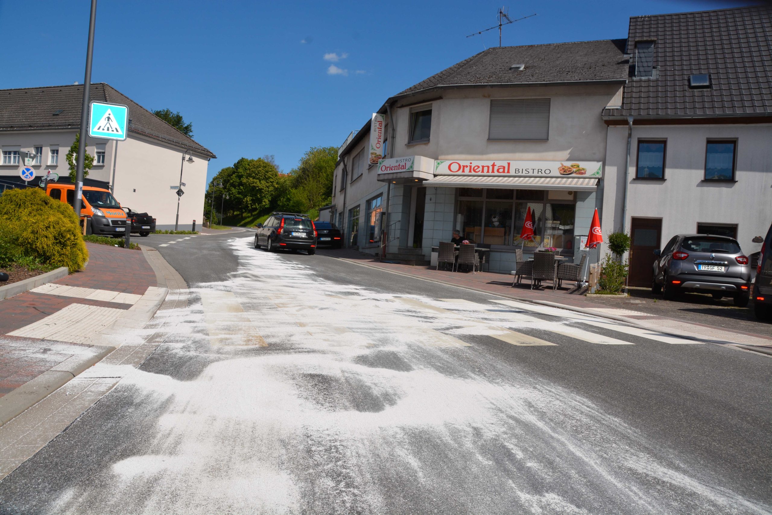 Großflächig mussten die Gefahrenbereiche auf der B 407, besonders in den Kurvenbereichen innerhalb und außerhalb der Ortslage Zerf abgestreut und Ölbindemittel eingesetzt werden.