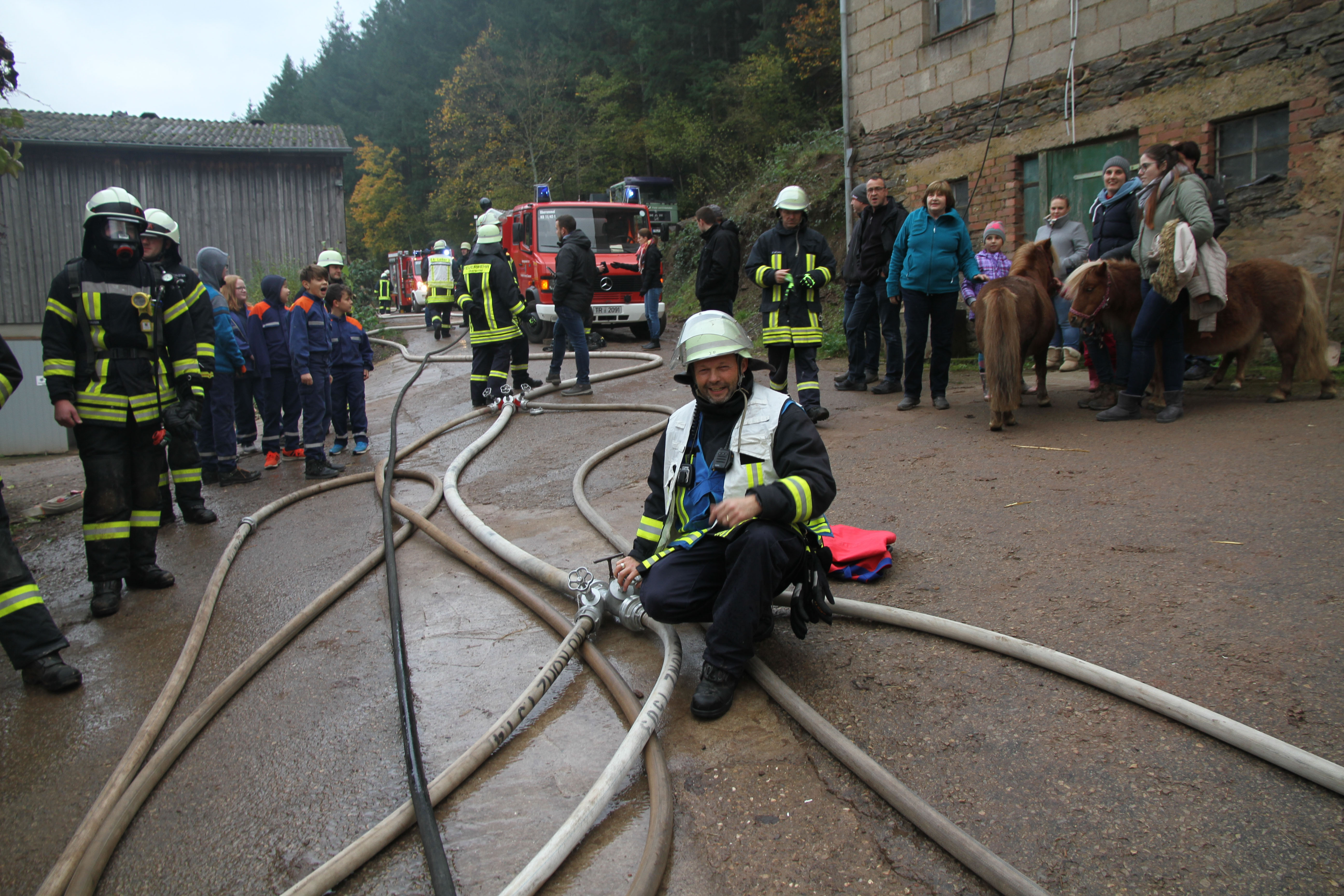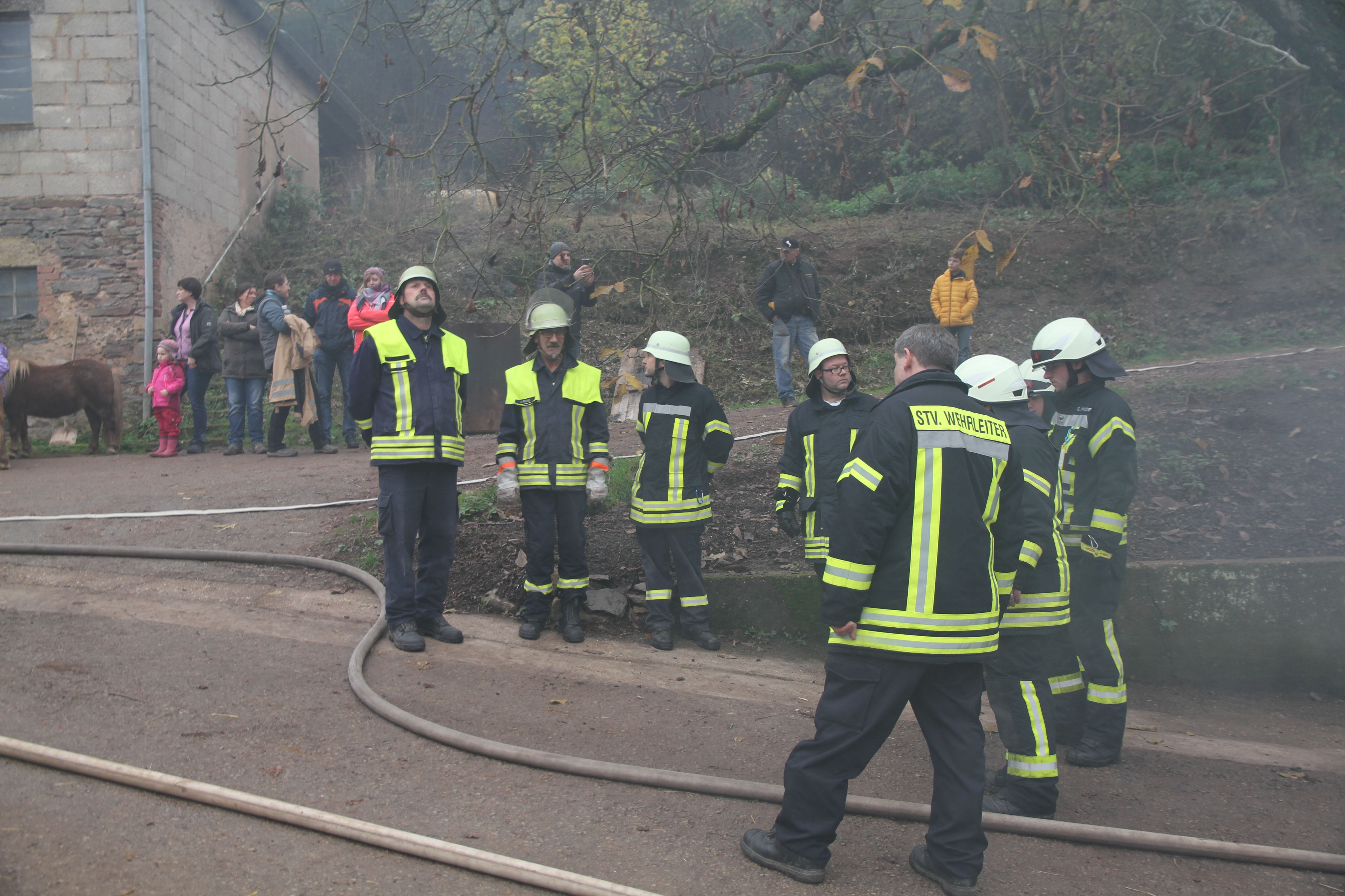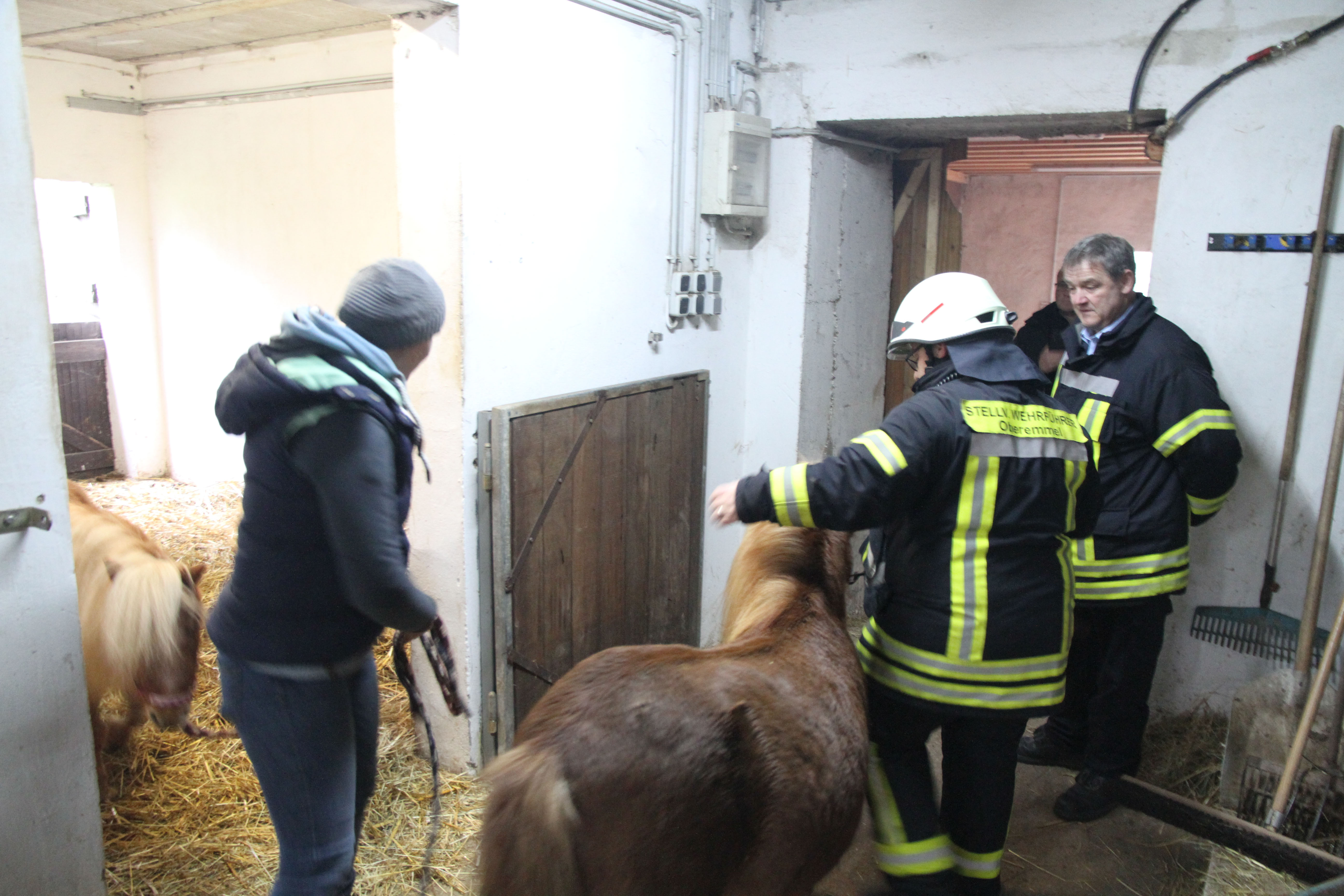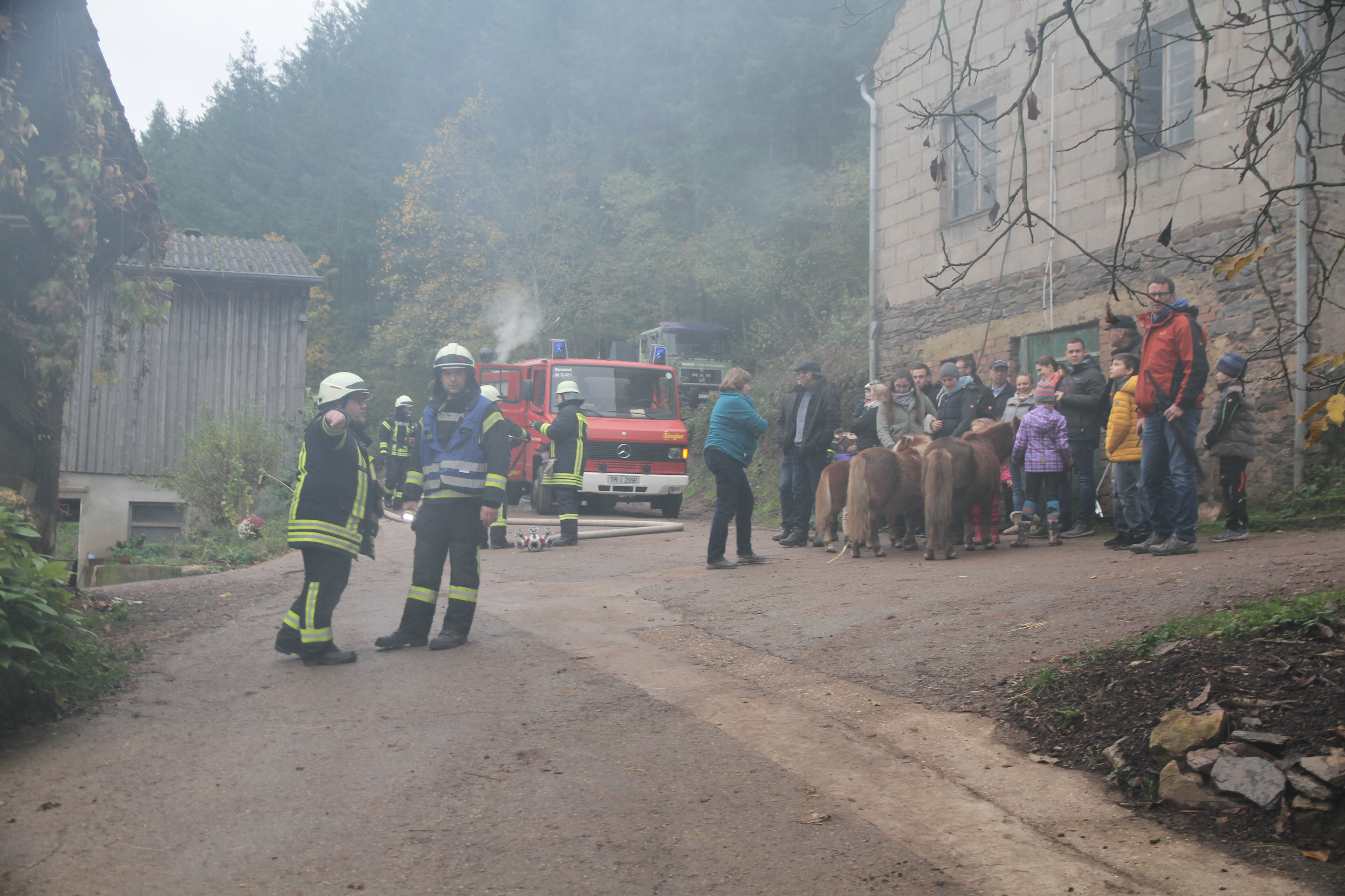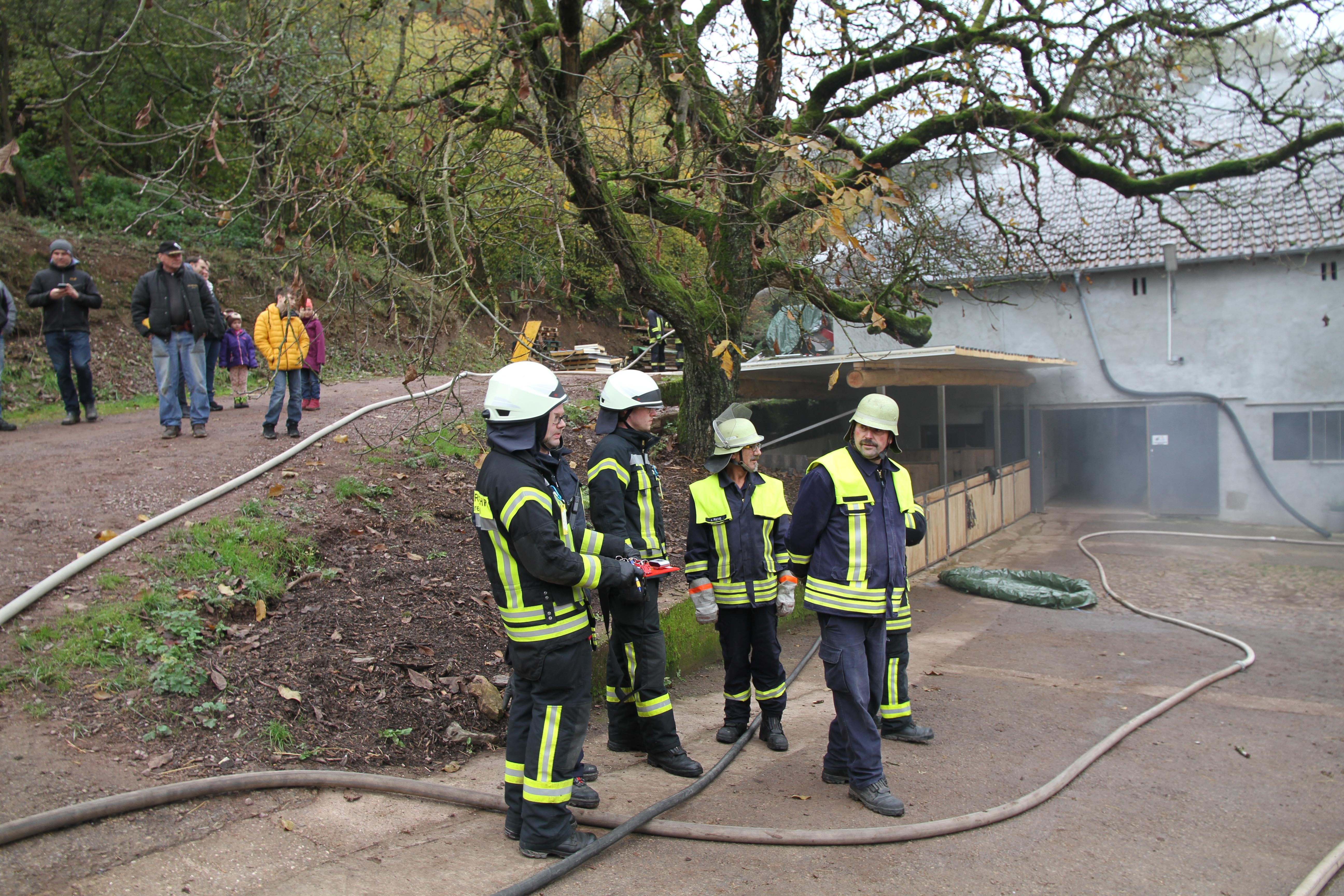 Die erst eintreffendem Einsatzkräfte bei dieser Jahreshauptübung stellten sowohl im Nebentrakt eines Stallgebäudes sowie im Hauptgebäude eine starke Rauchentwicklung fest. Nach Angaben des Betreibers der Pferdepension Ivanka Bernardy befinden sich ungefähr fünf Personen im Hauptgebäude. Noch bevor die Wasserversorgung von einem 1,5 km entfernten Niederflur Hydranten von den nachrückenden Einsatzkräften aufgebaut wurde, konnten einige Kleinpferde aus dem Stallgebäude gerettet werden.