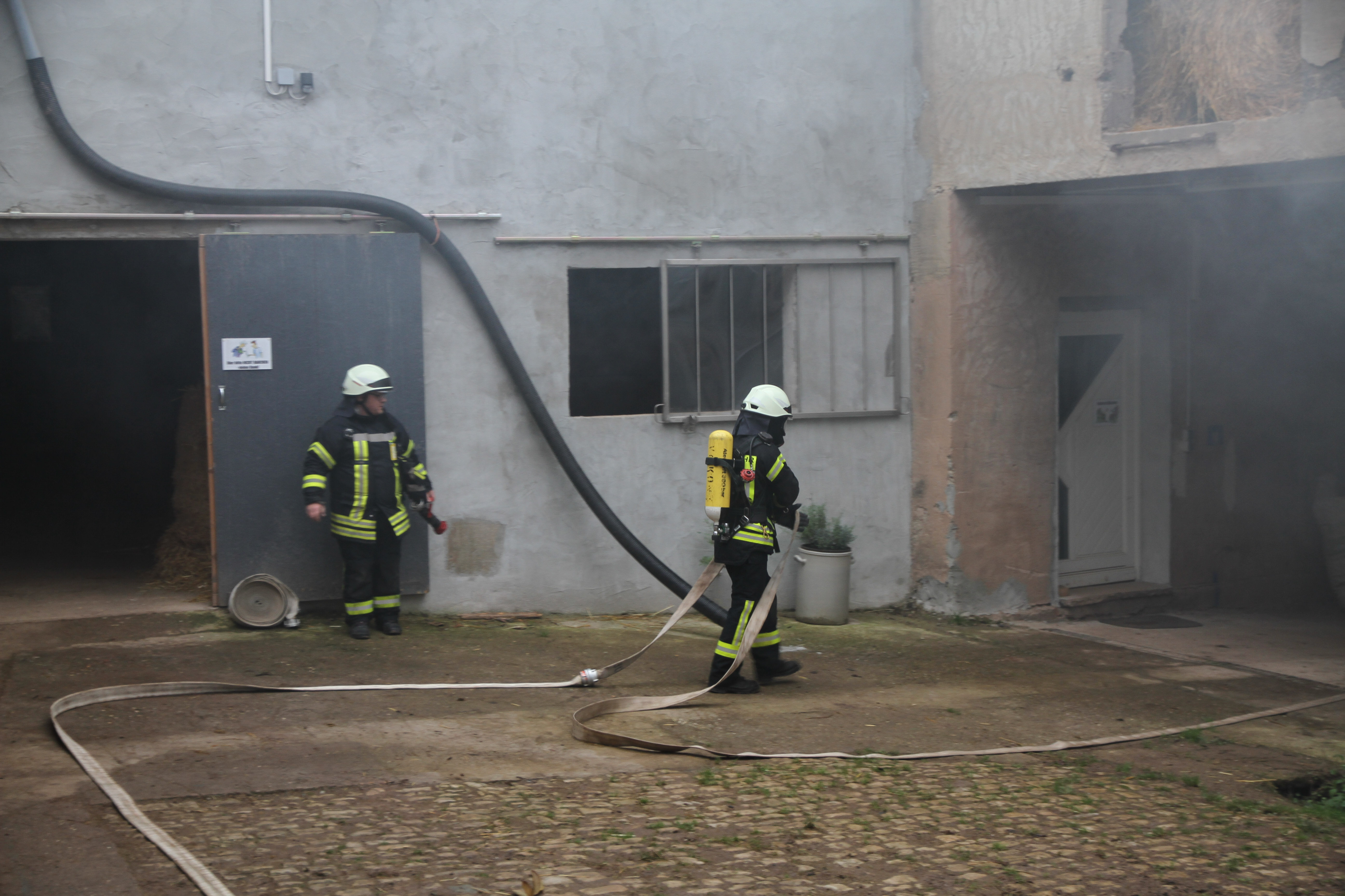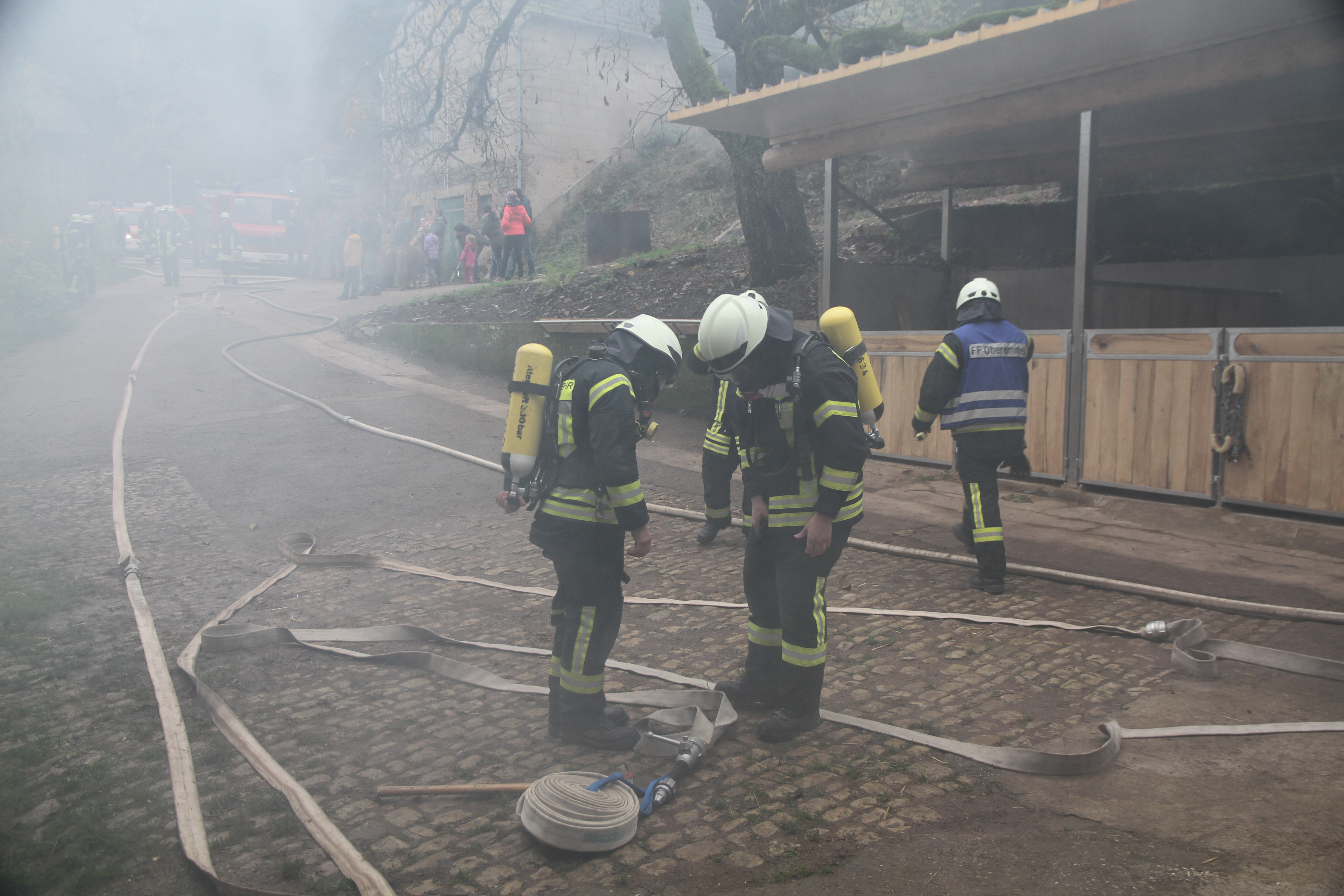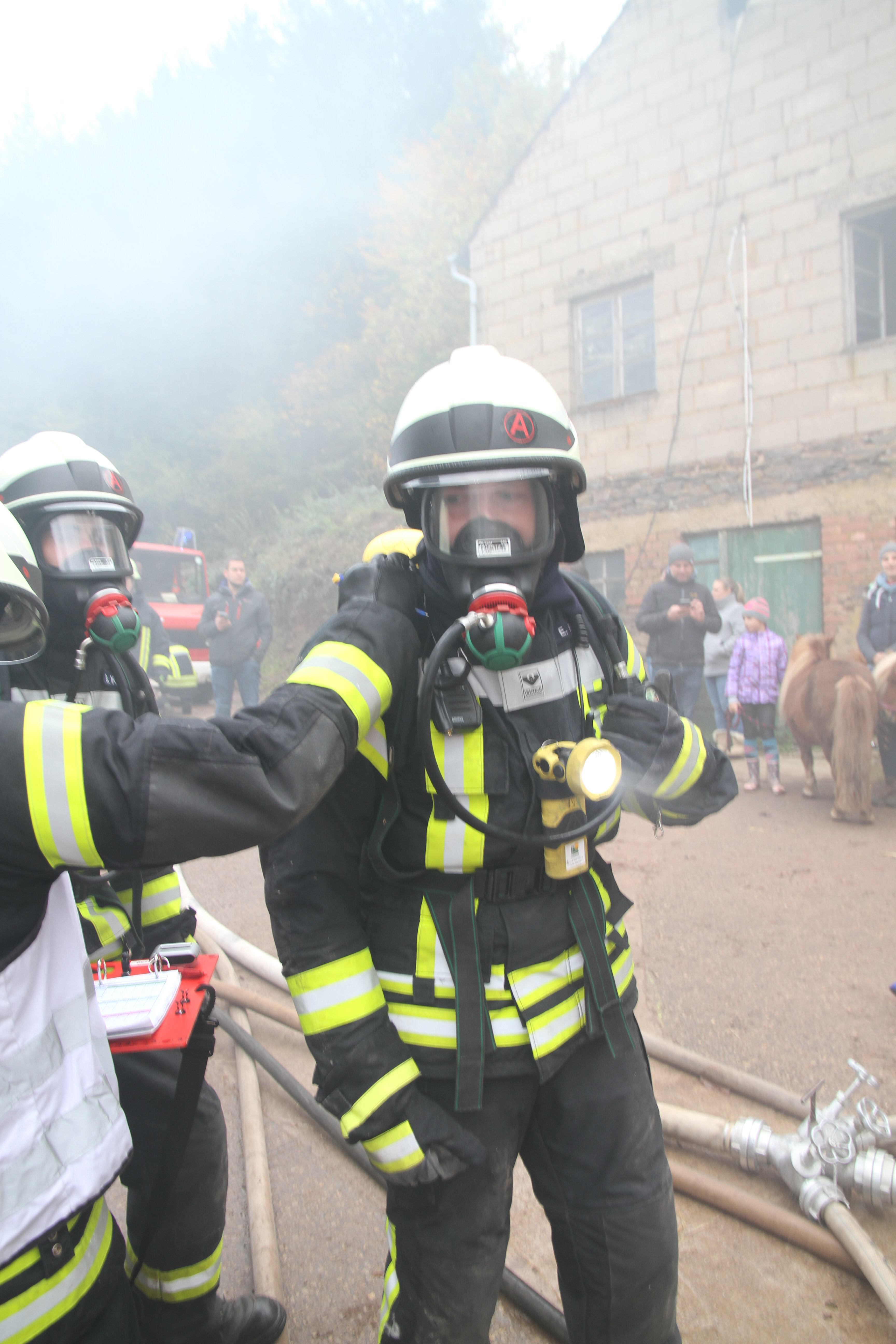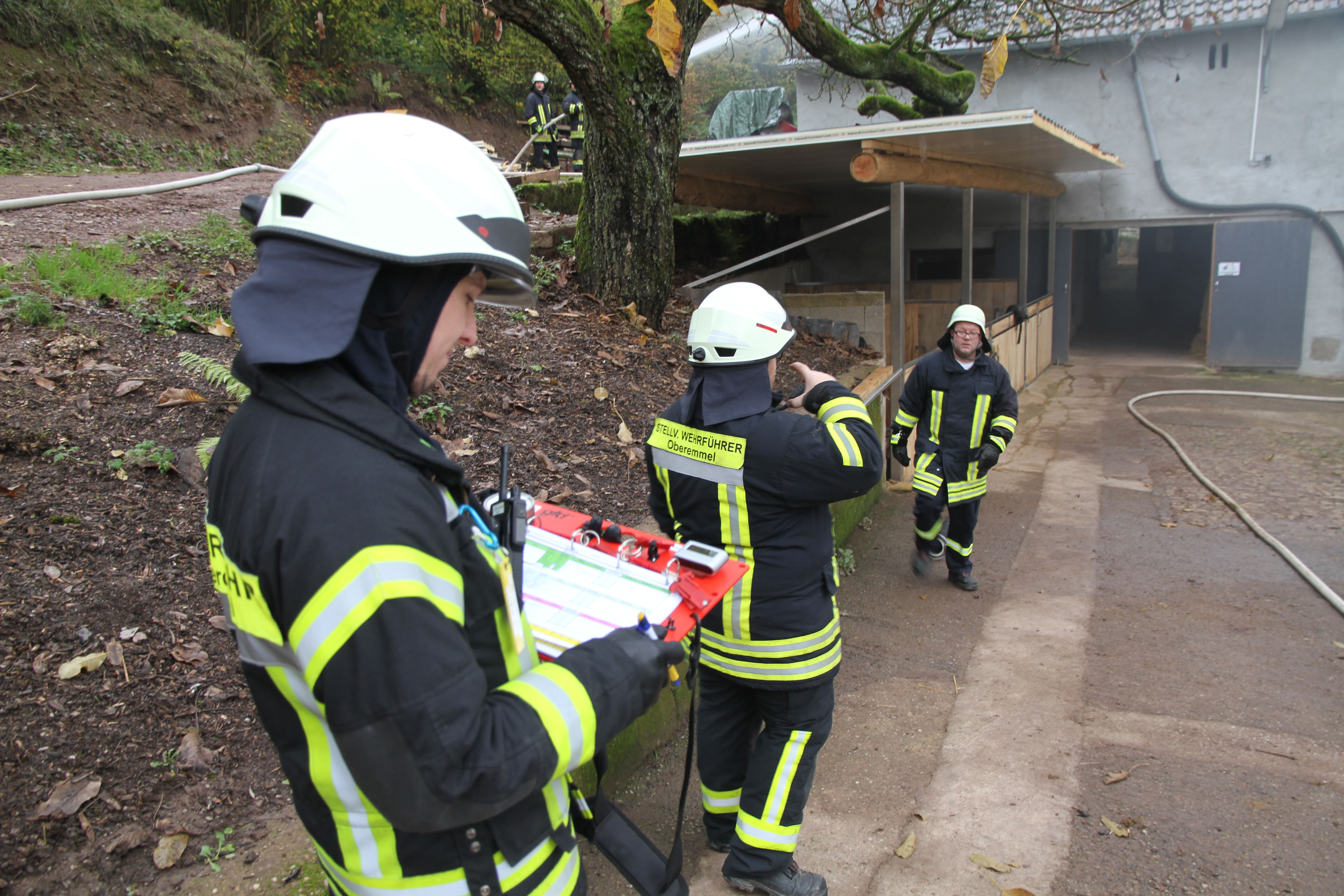 Die erst eintreffendem Einsatzkräfte bei dieser Jahreshauptübung stellten sowohl im Nebentrakt eines Stallgebäudes sowie im Hauptgebäude eine starke Rauchentwicklung fest. Nach Angaben des Betreibers der Pferdepension Ivanka Bernardy befinden sich ungefähr fünf Personen im Hauptgebäude. Noch bevor die Wasserversorgung von einem 1,5 km entfernten Niederflur Hydranten von den nachrückenden Einsatzkräften aufgebaut wurde, konnten einige Kleinpferde aus dem Stallgebäude gerettet werden.