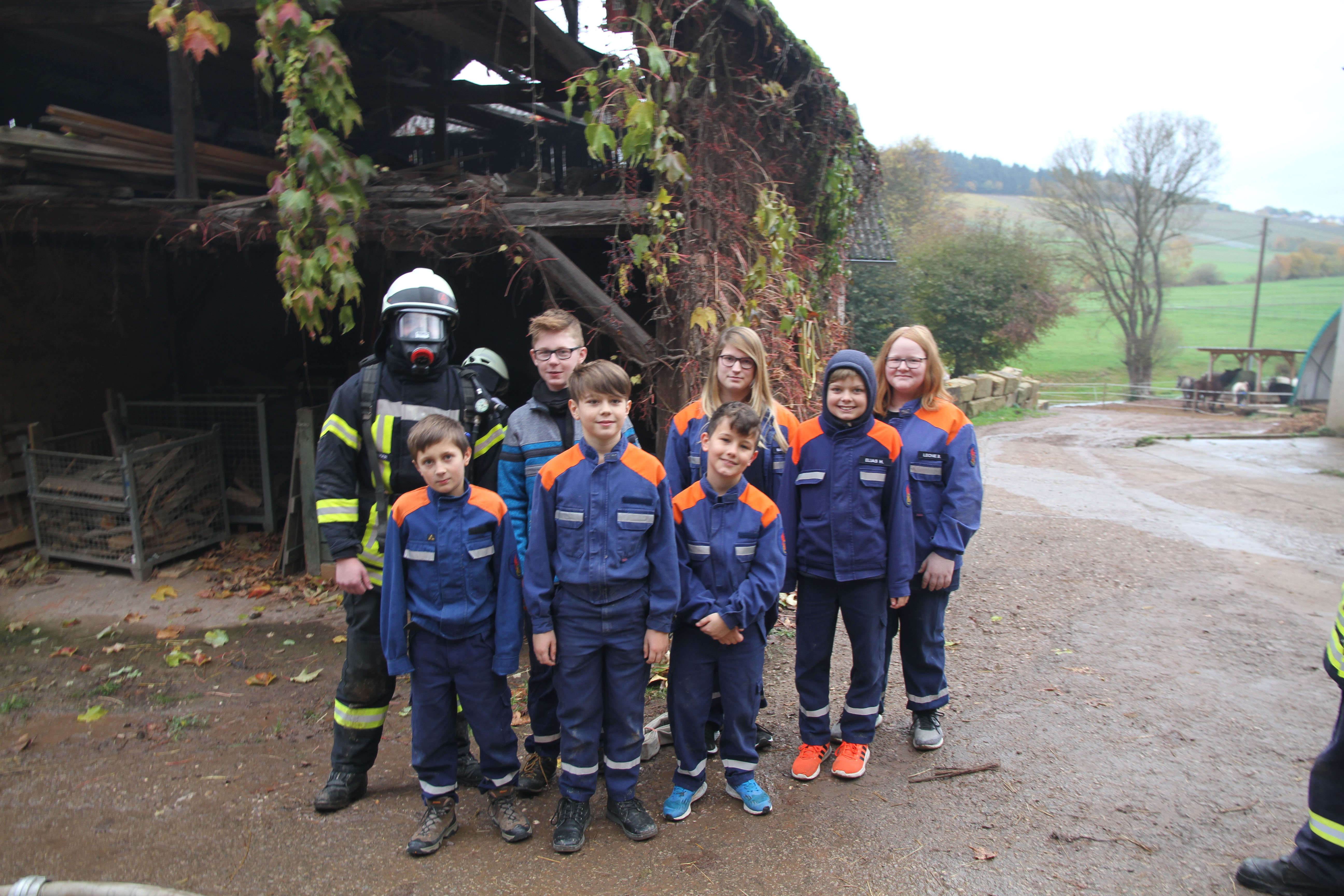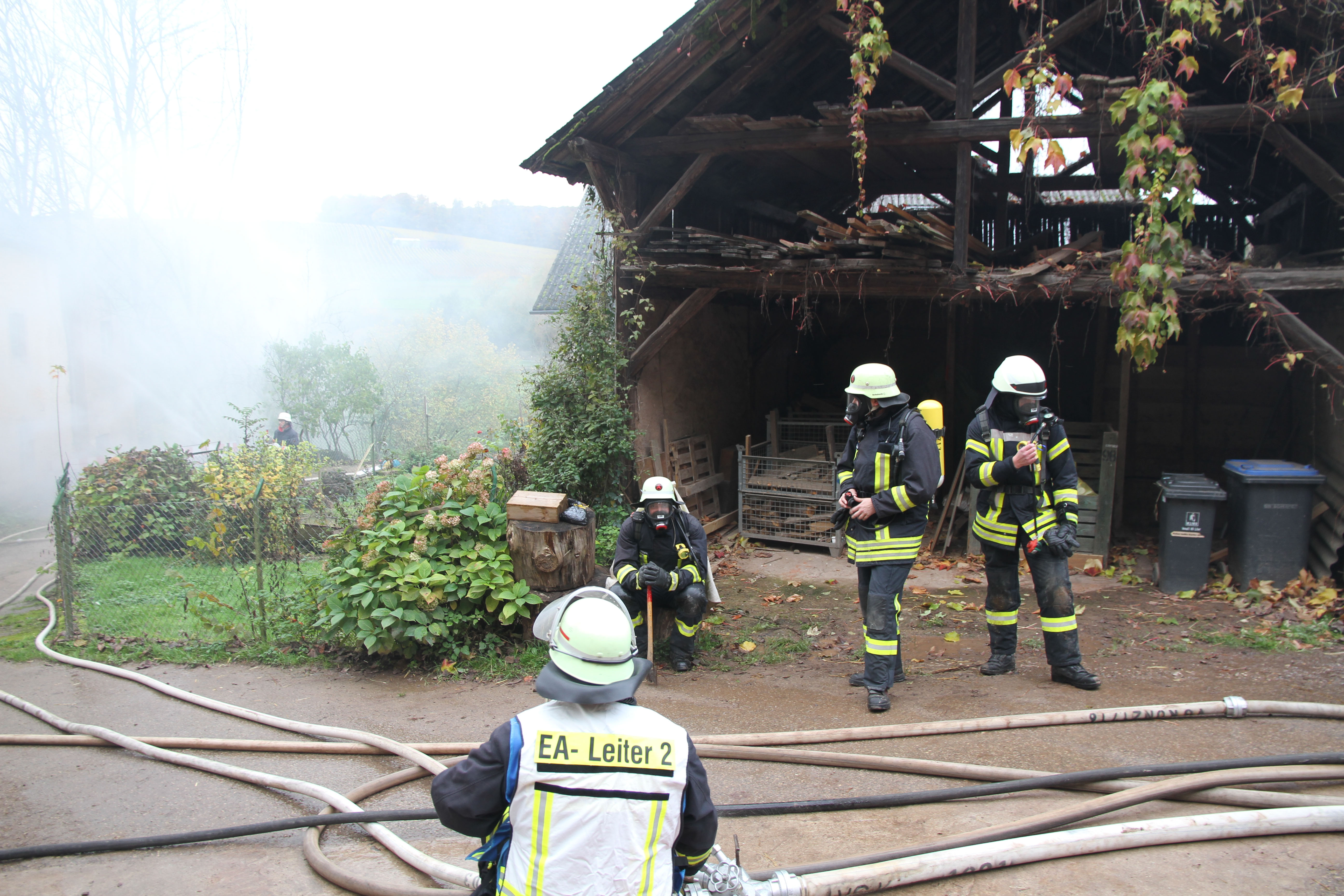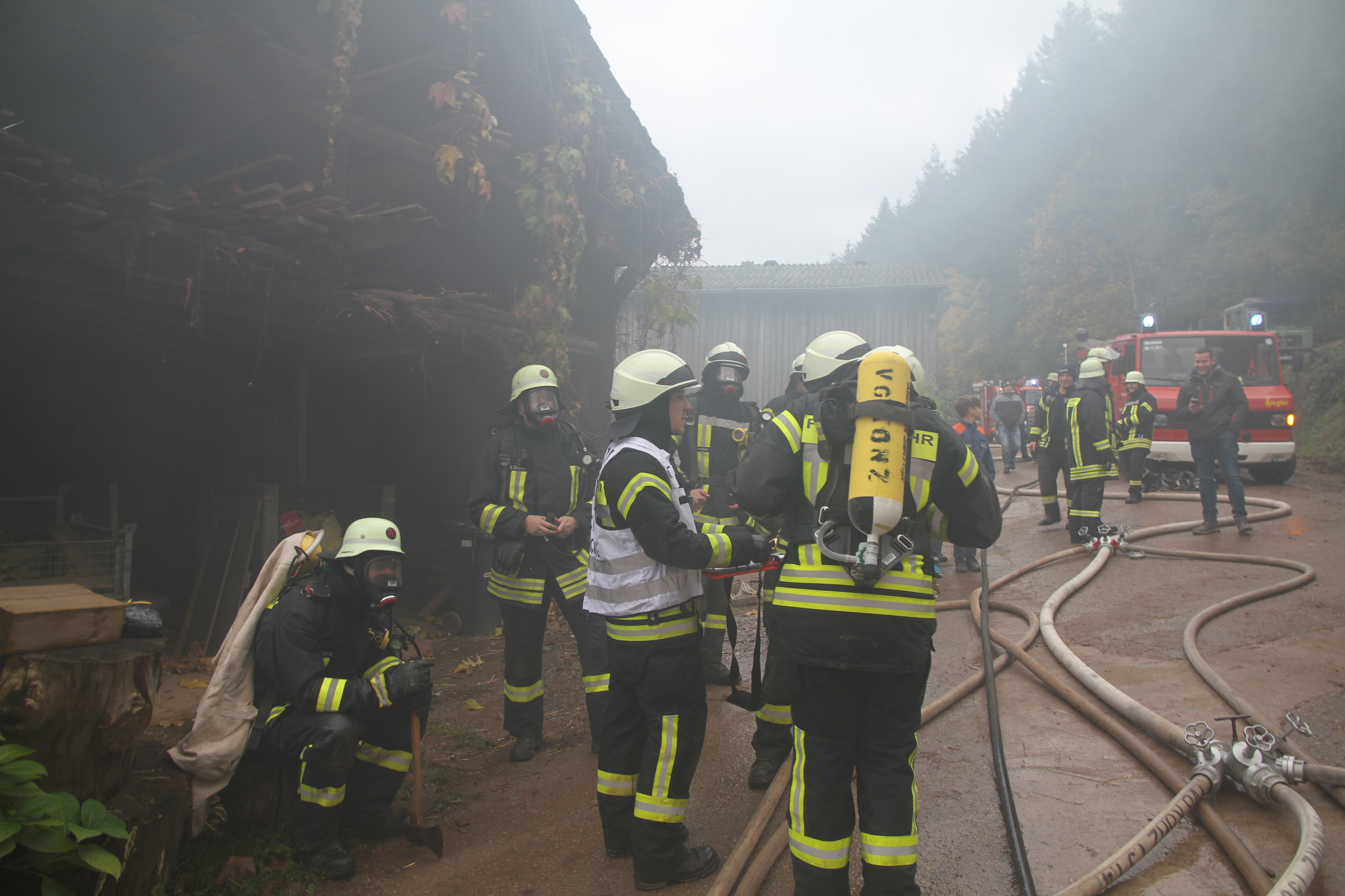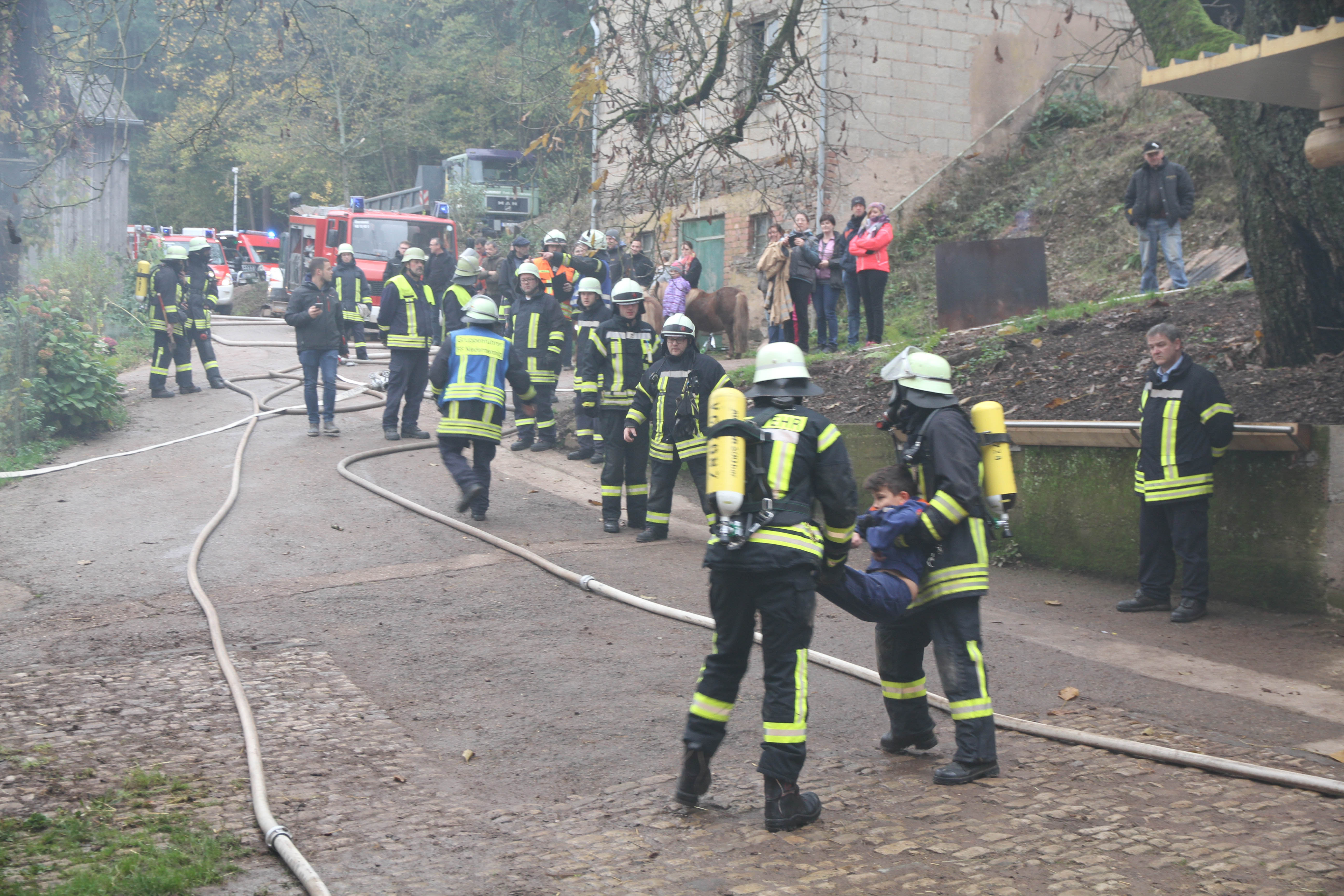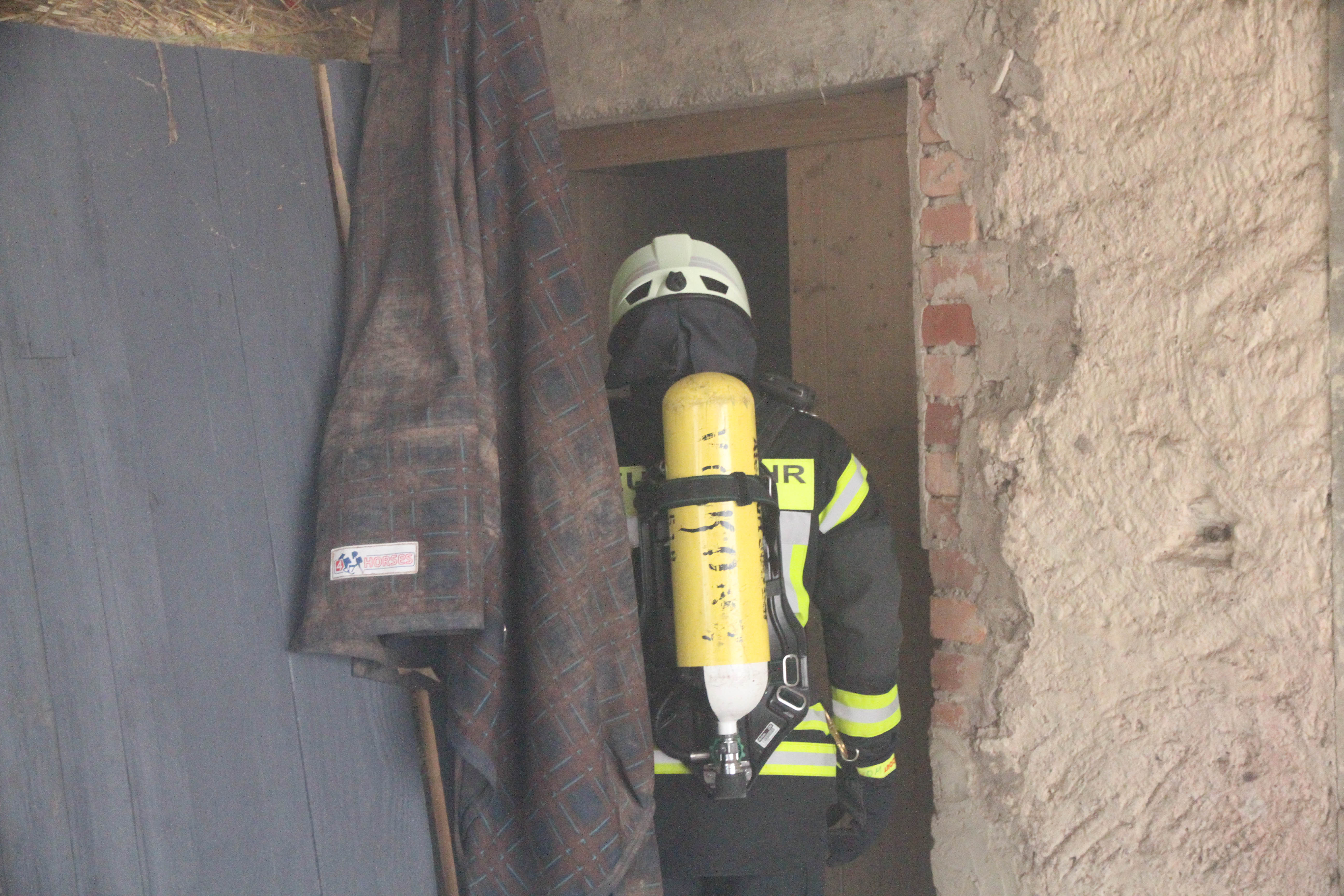 Die erst eintreffendem Einsatzkräfte bei dieser Jahreshauptübung stellten sowohl im Nebentrakt eines Stallgebäudes sowie im Hauptgebäude eine starke Rauchentwicklung fest. Nach Angaben des Betreibers der Pferdepension Ivanka Bernardy befinden sich ungefähr fünf Personen im Hauptgebäude. Noch bevor die Wasserversorgung von einem 1,5 km entfernten Niederflur Hydranten von den nachrückenden Einsatzkräften aufgebaut wurde, konnten einige Kleinpferde aus dem Stallgebäude gerettet werden.
