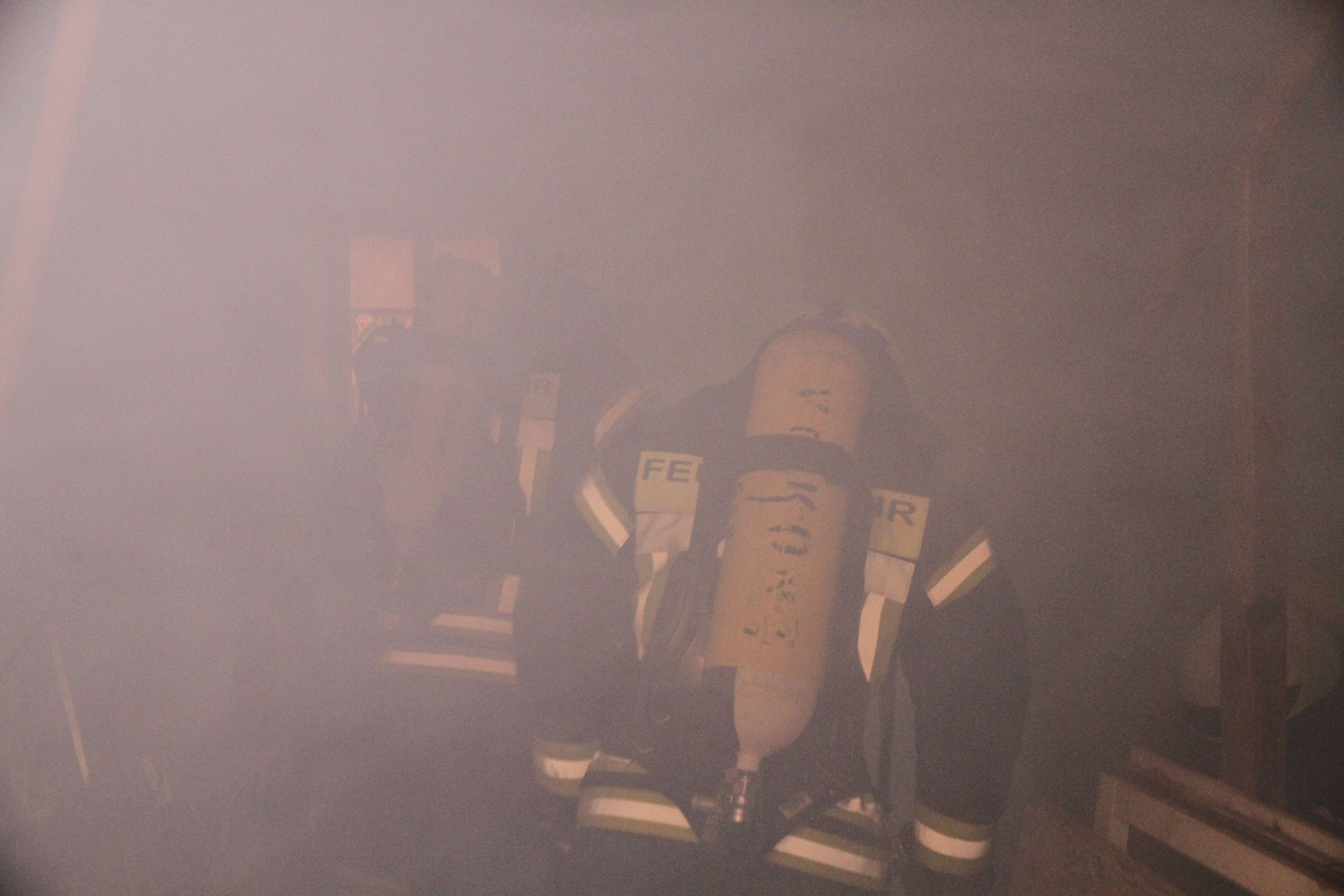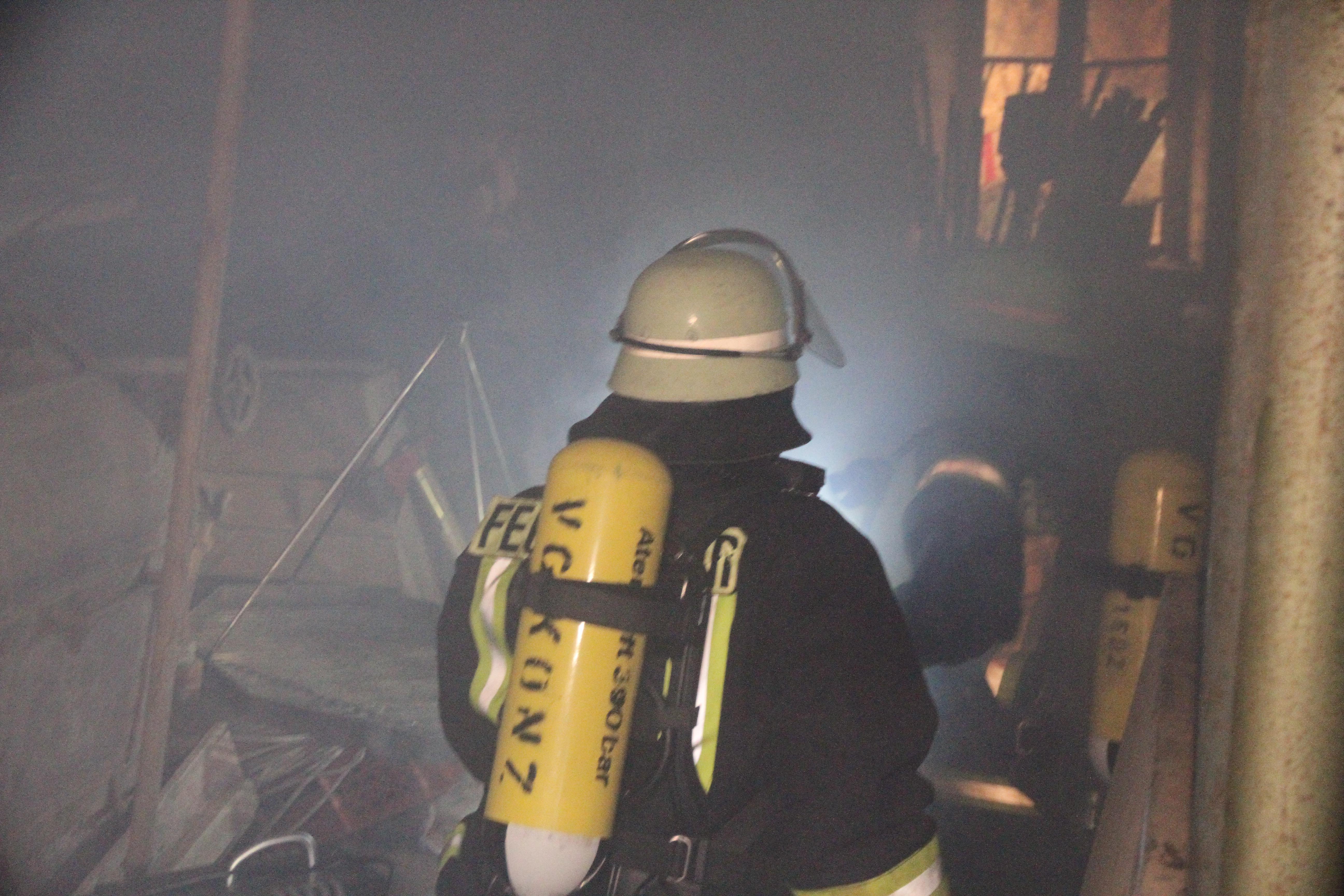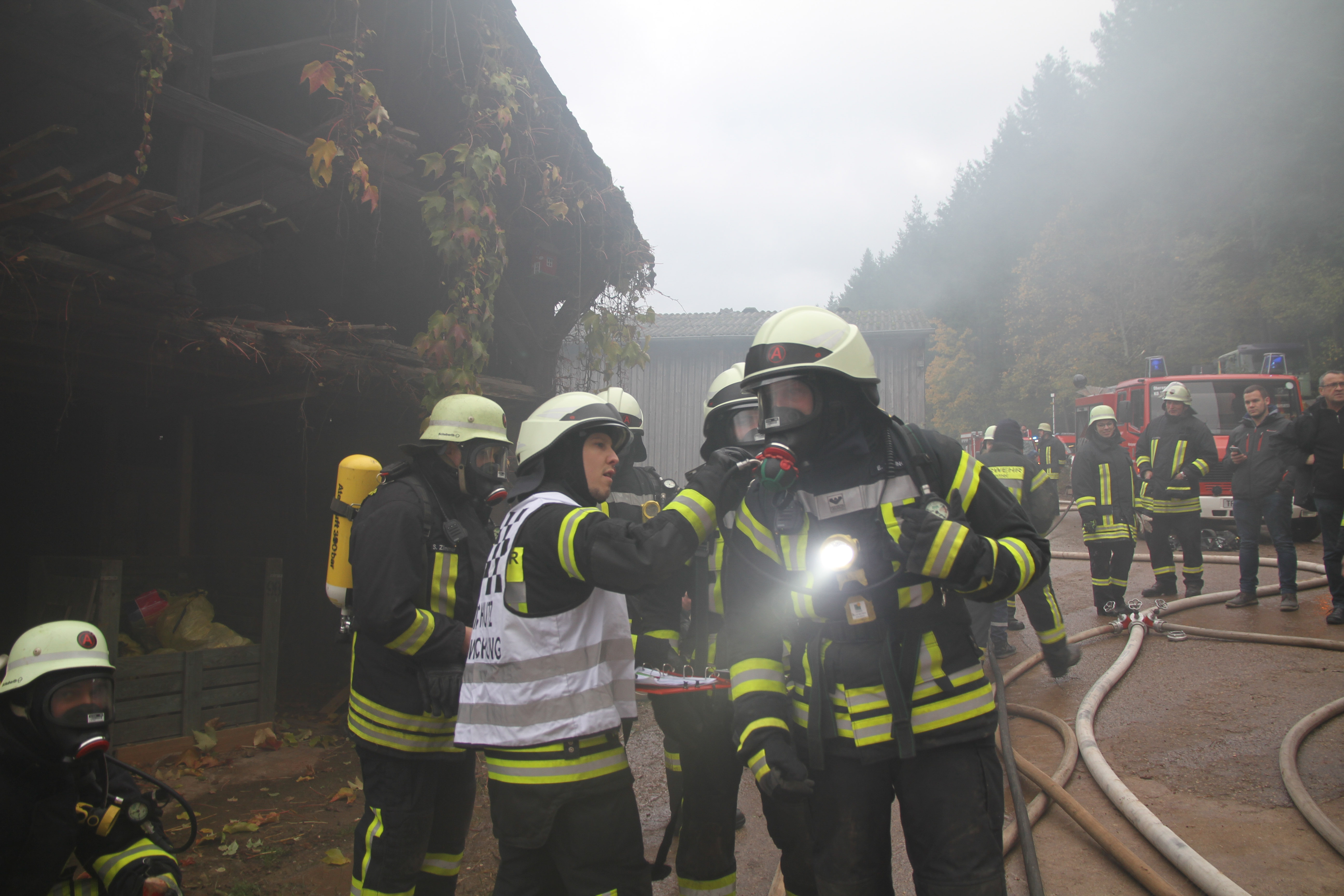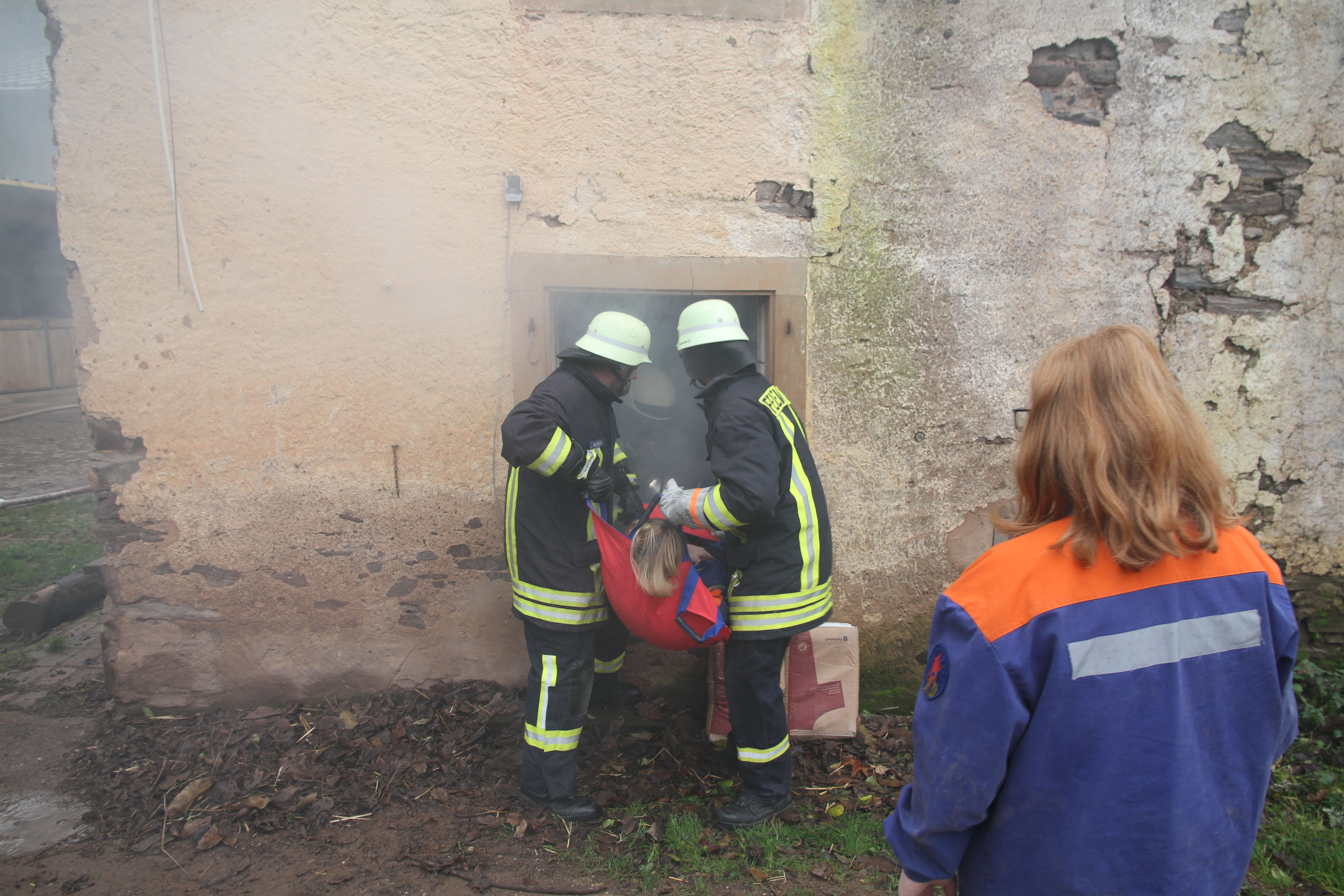 der Innenangriff eingeleitet werden. Sieben Personen konnten mit dem Rettungsschleifsack aus dem Gebäude gerettet werden. Auch ein Kamerad musste mit Schwächeanzeichen aus dem Gebäude gerettet werden. Es war für die Einsatzkräfte mit Atemschutz bei den verengten Verhältnissen im Gebäude schon anstrengend und schweißtreibend. Mit Strahlrohren und einer Wasserwanddüse wurden die Außenflächen der Gebäude bekämpft und gekühlt. Es war eine Übung die von allen Einsatzkräften einiges abverlangte.