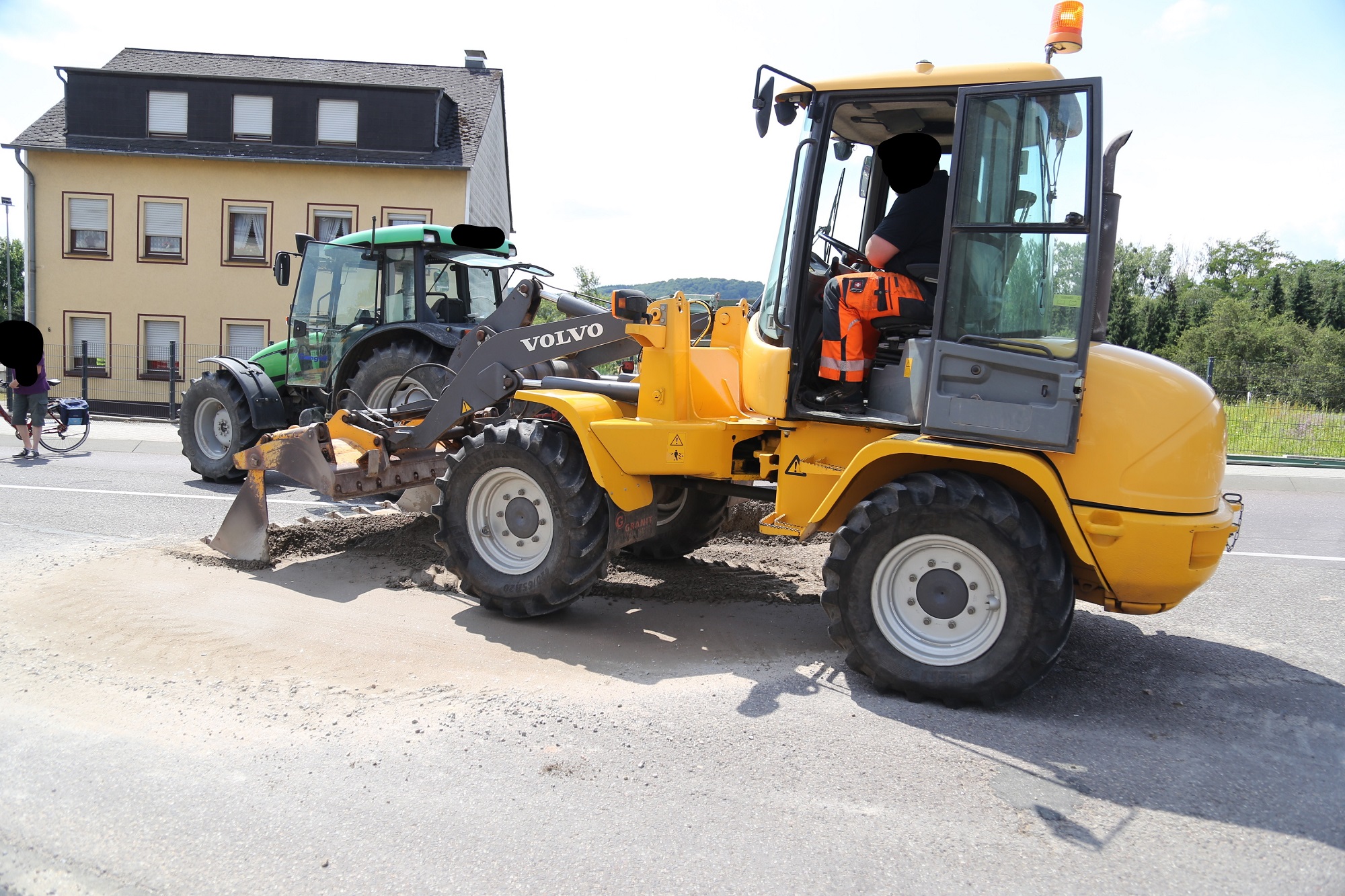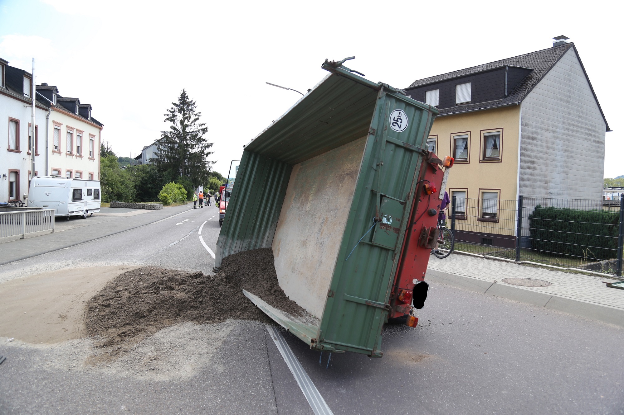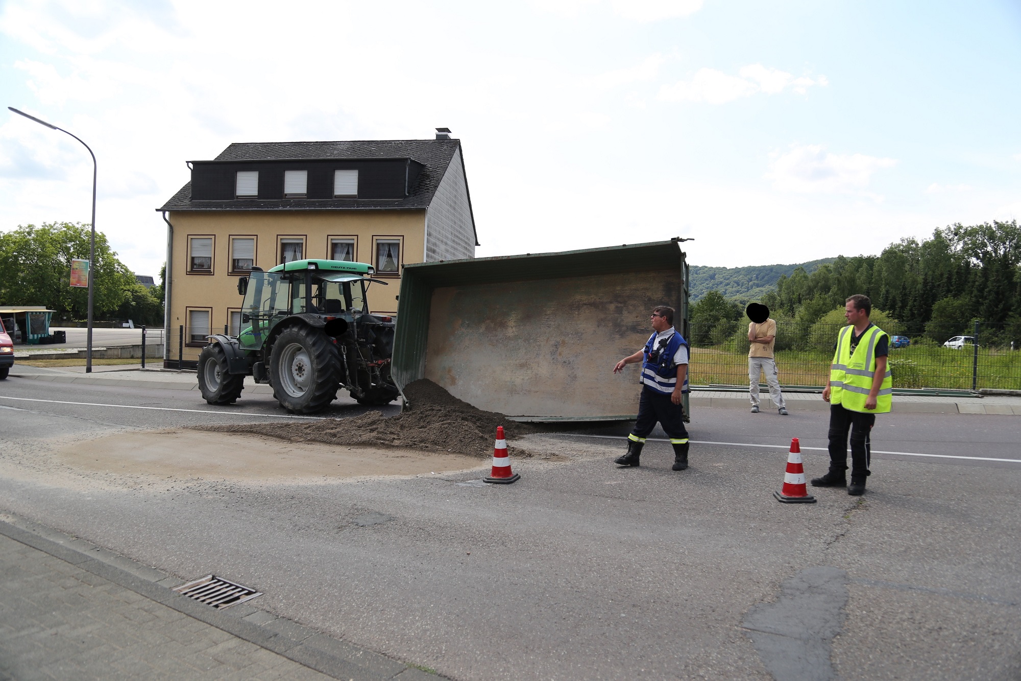 Direkt nach dem Verkehrsunfall kippte ein mit Zement beladener Traktoranhänger bei Konzerbrück um. Die Feuerwehr Könen sicherte gemeinsam mit der Polizei die Einsatzstelle. Der Verkehr wurde an der Unfallstelle vorbei geleitet. Es kam kurzzeitig zu starken Verkehrsbehinderungen. Mit einem Gabelstapler wurde der Anhänger wieder aufgerichtet. Die Ladung wurde mit einem Hublader wieder auf den Anhänger geladen. Verletzt wurde niemand.