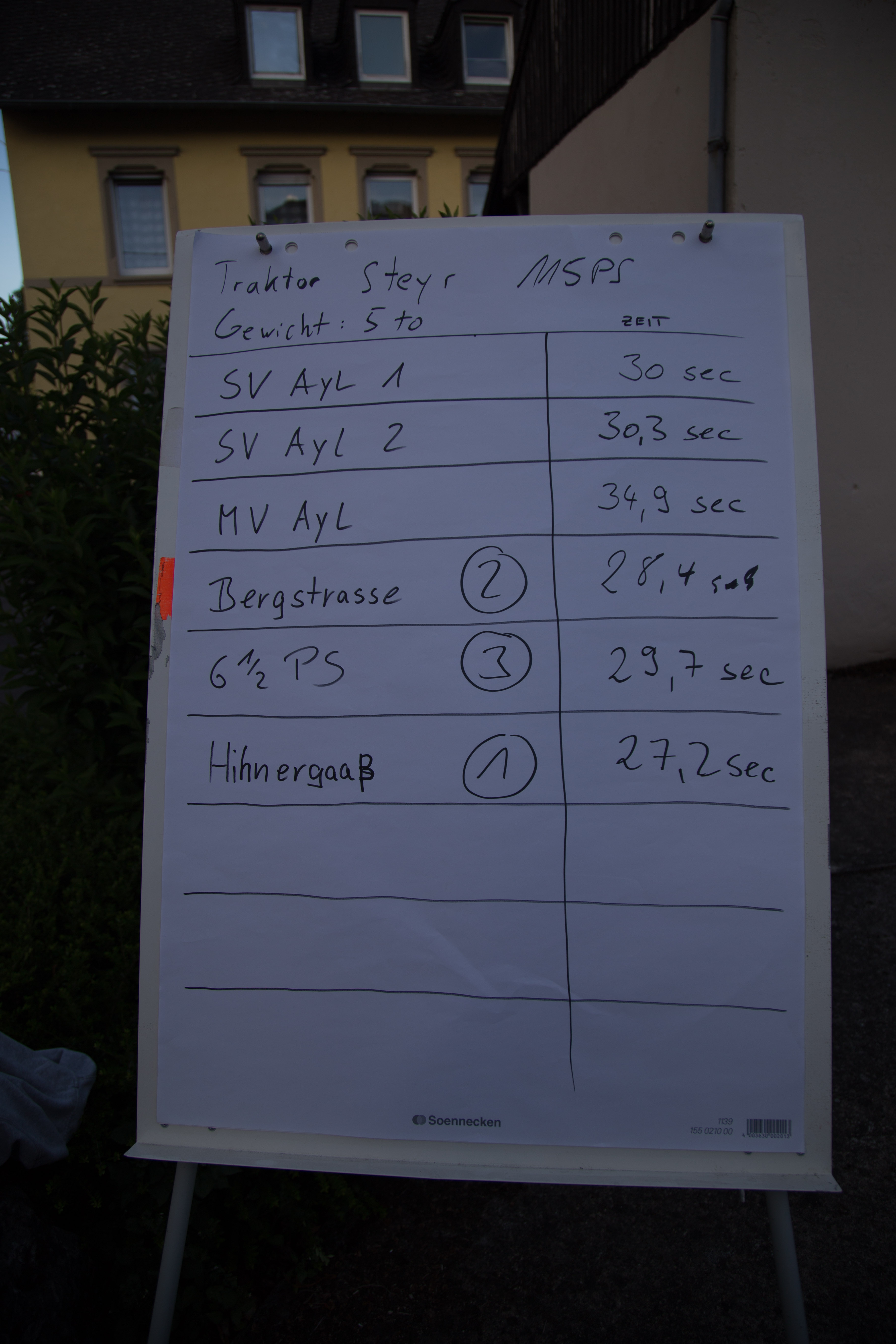 Die Bestzeit lag am Ende bei 27,2 Sekunden, damit ging der Sieg an die Biebelhausener Hühnergaaß. Der zweite Platz ging an die heimische Bergstraße und dritter wurden die 6 ½ PS.
