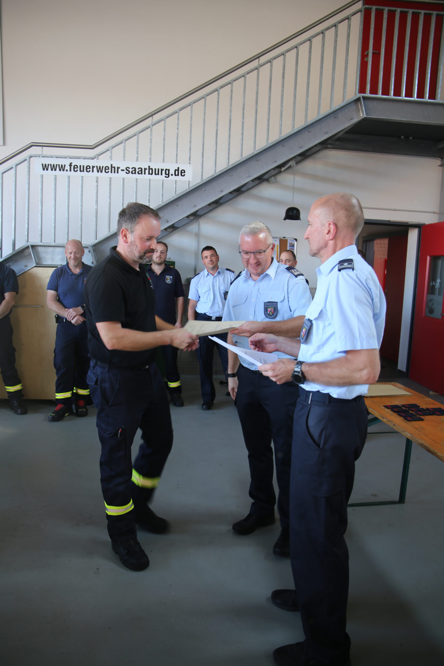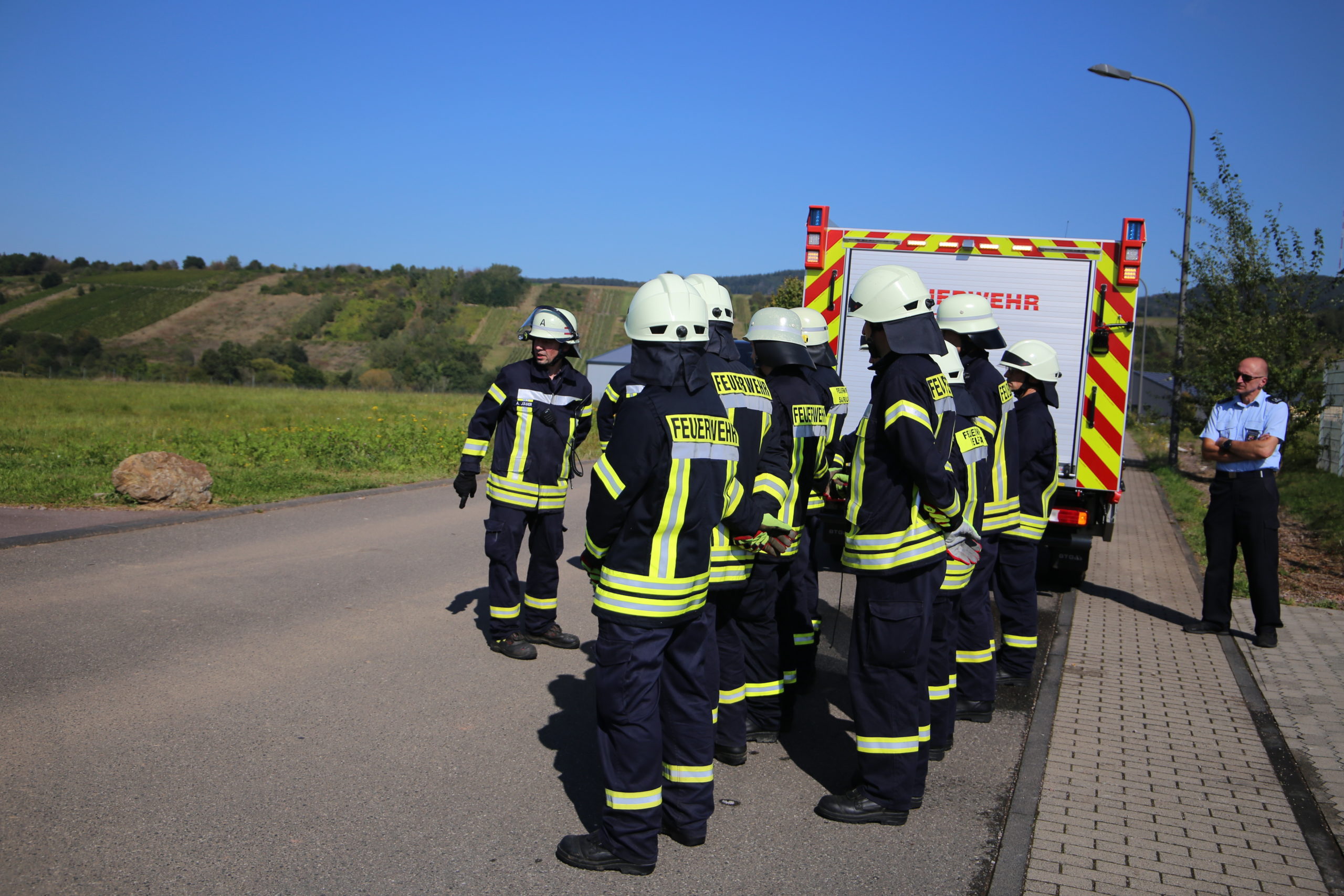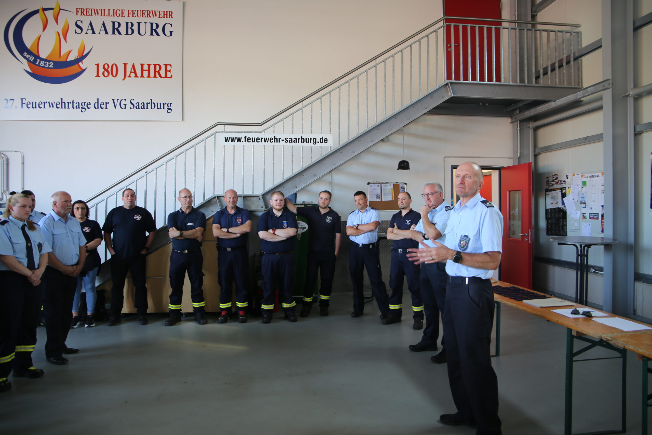 Die Ausbildungsleiter,der Wehrleiter der VG Saarburg-Kell (Stefan Feltes), der stellv. Wehrleiter der VG Saarburg-Kell (Stefan Klang) beobachteten den Übungsablauf mit Ihren Kollegen und Wehrführer der teilnehmenden Ortswehren. Im Anschluss begab man sich zu einer kurzen schriftlichen Prüfung ins Gerätehaus der Feuerwehr Saarburg-Mitte.