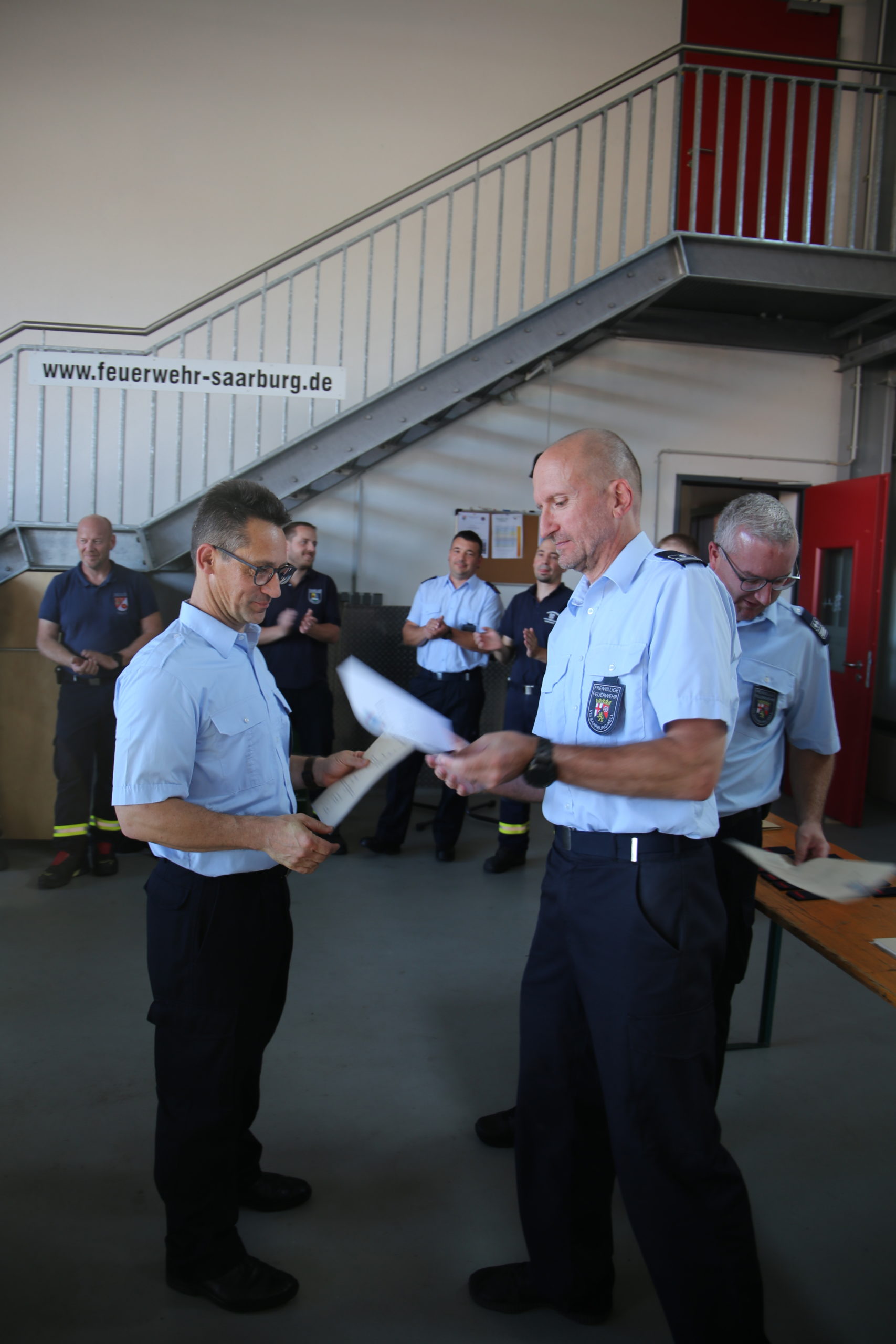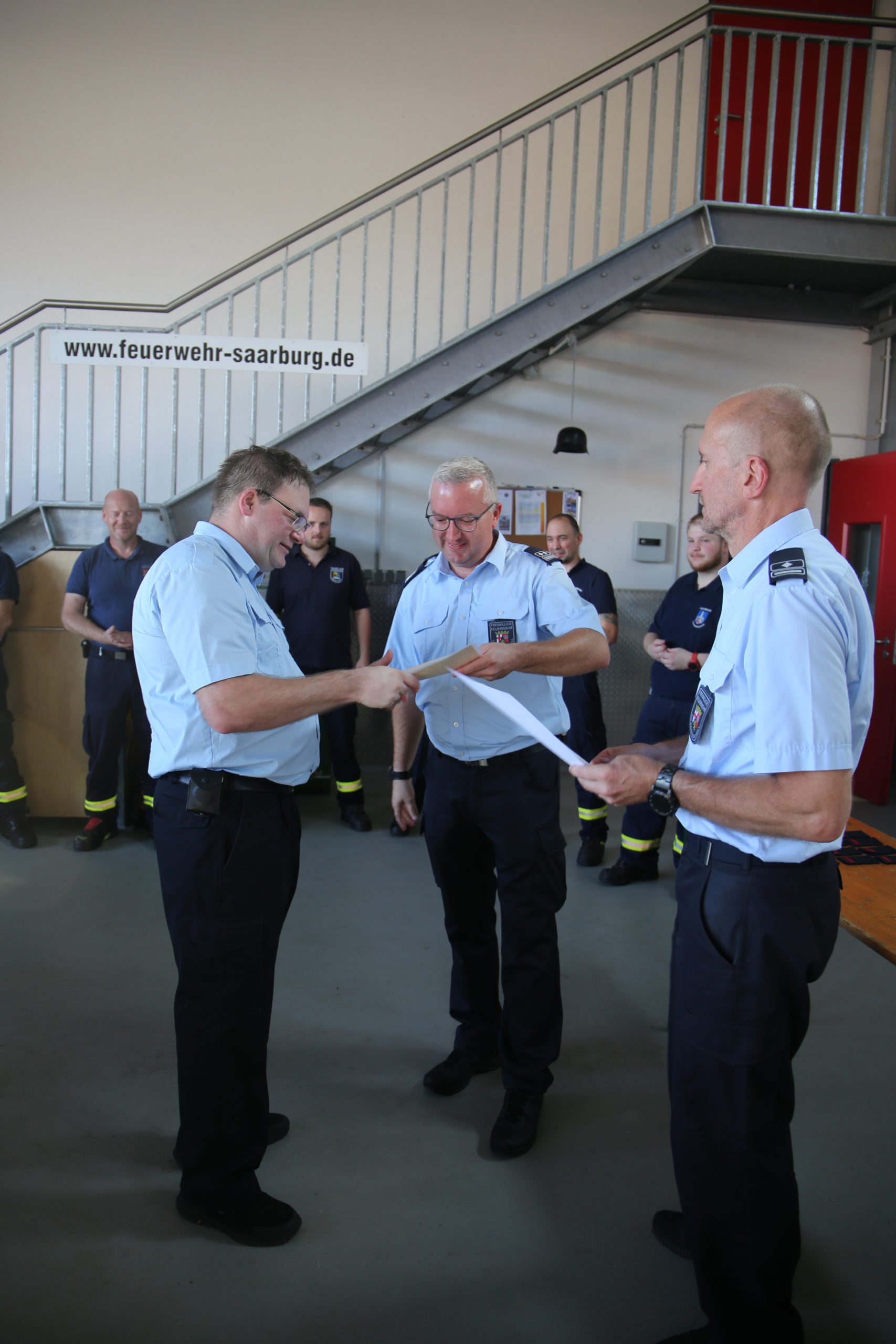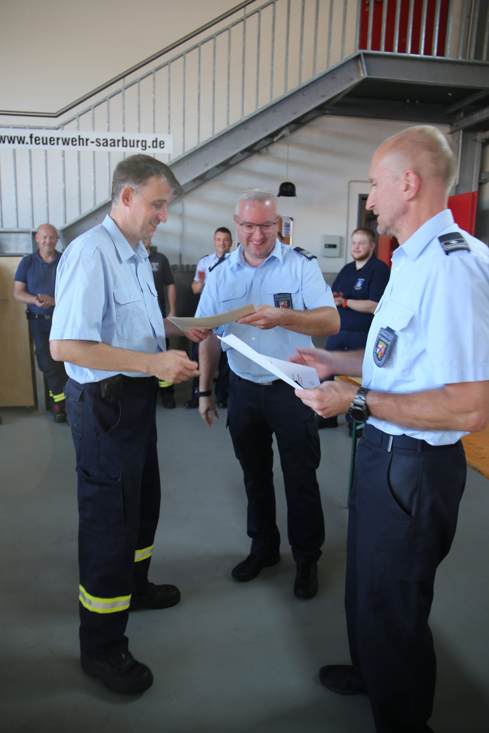 Die Ausbildungsleiter,der Wehrleiter der VG Saarburg-Kell (Stefan Feltes), der stellv. Wehrleiter der VG Saarburg-Kell (Stefan Klang) beobachteten den Übungsablauf mit Ihren Kollegen und Wehrführer der teilnehmenden Ortswehren. Im Anschluss begab man sich zu einer kurzen schriftlichen Prüfung ins Gerätehaus der Feuerwehr Saarburg-Mitte.