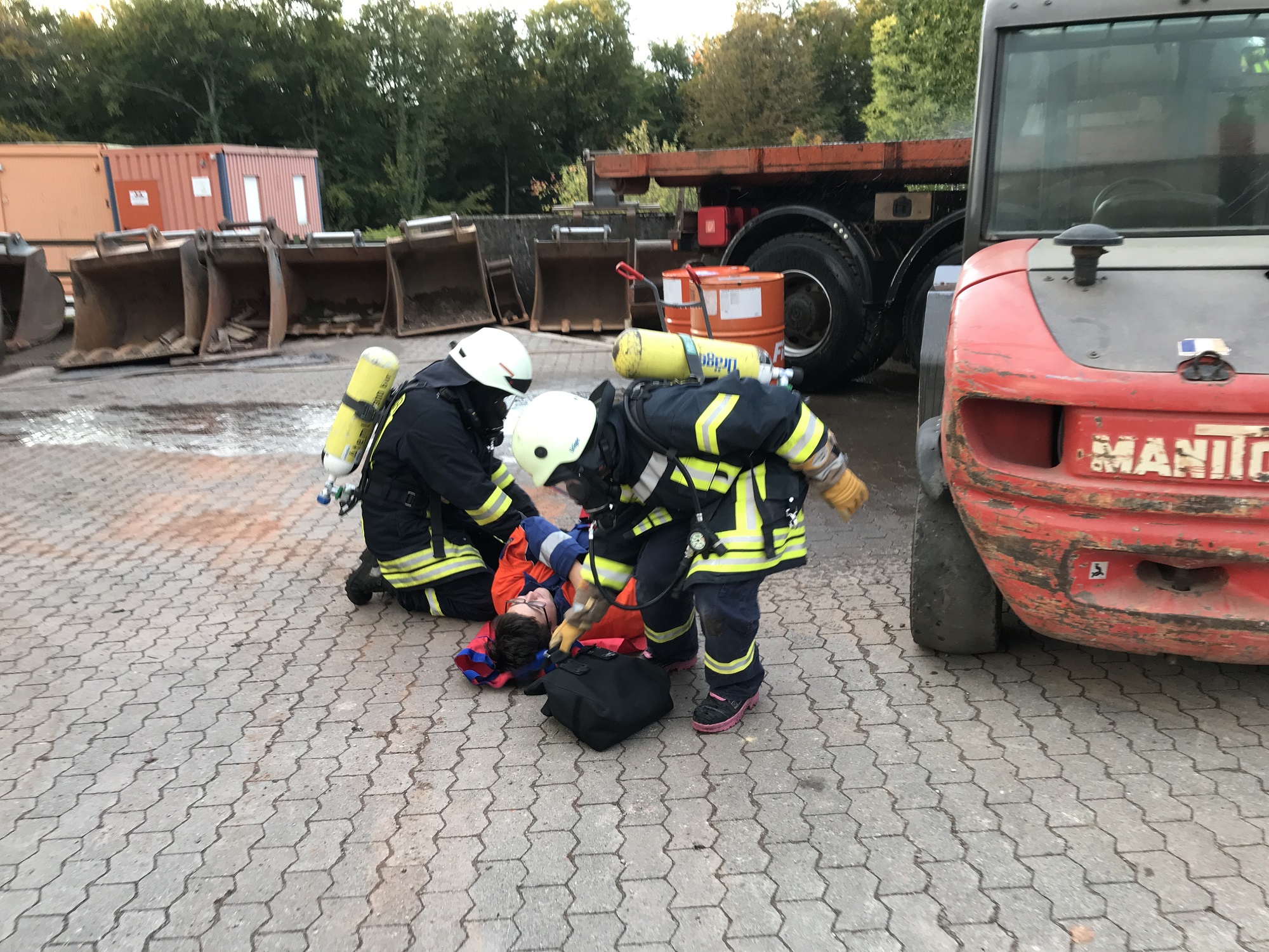 Der Gabelstaplerfahrer, sowie zwei Arbeiter werden durch den Gefahrstoff verletzt. Die Verletzten wurden von der Jugendfeuerwehr Freudenburg gestellt. Gegen 18:00 Uhr kam der Alarm und die Feuerwehren rückten zum Einsatzort aus.