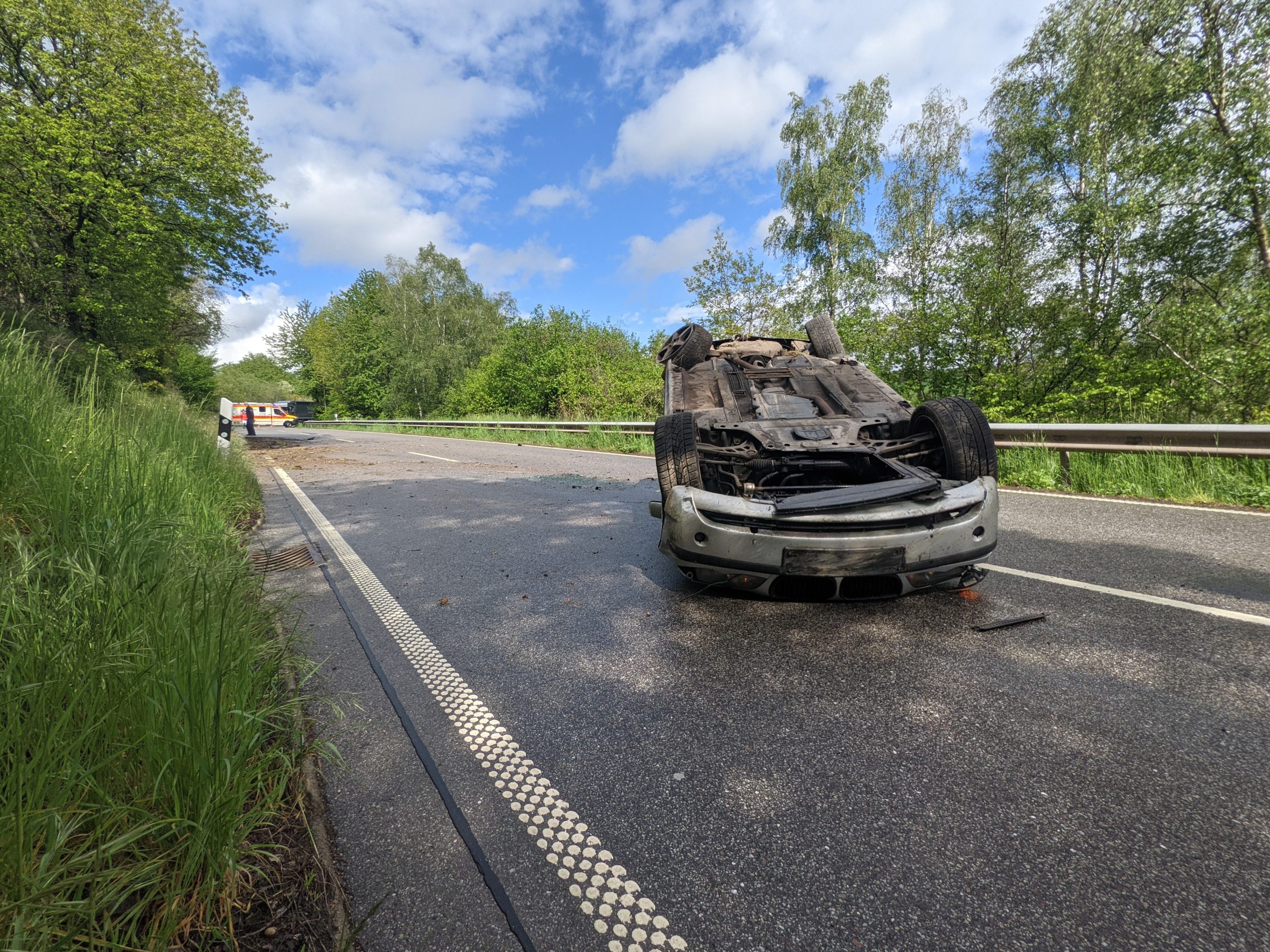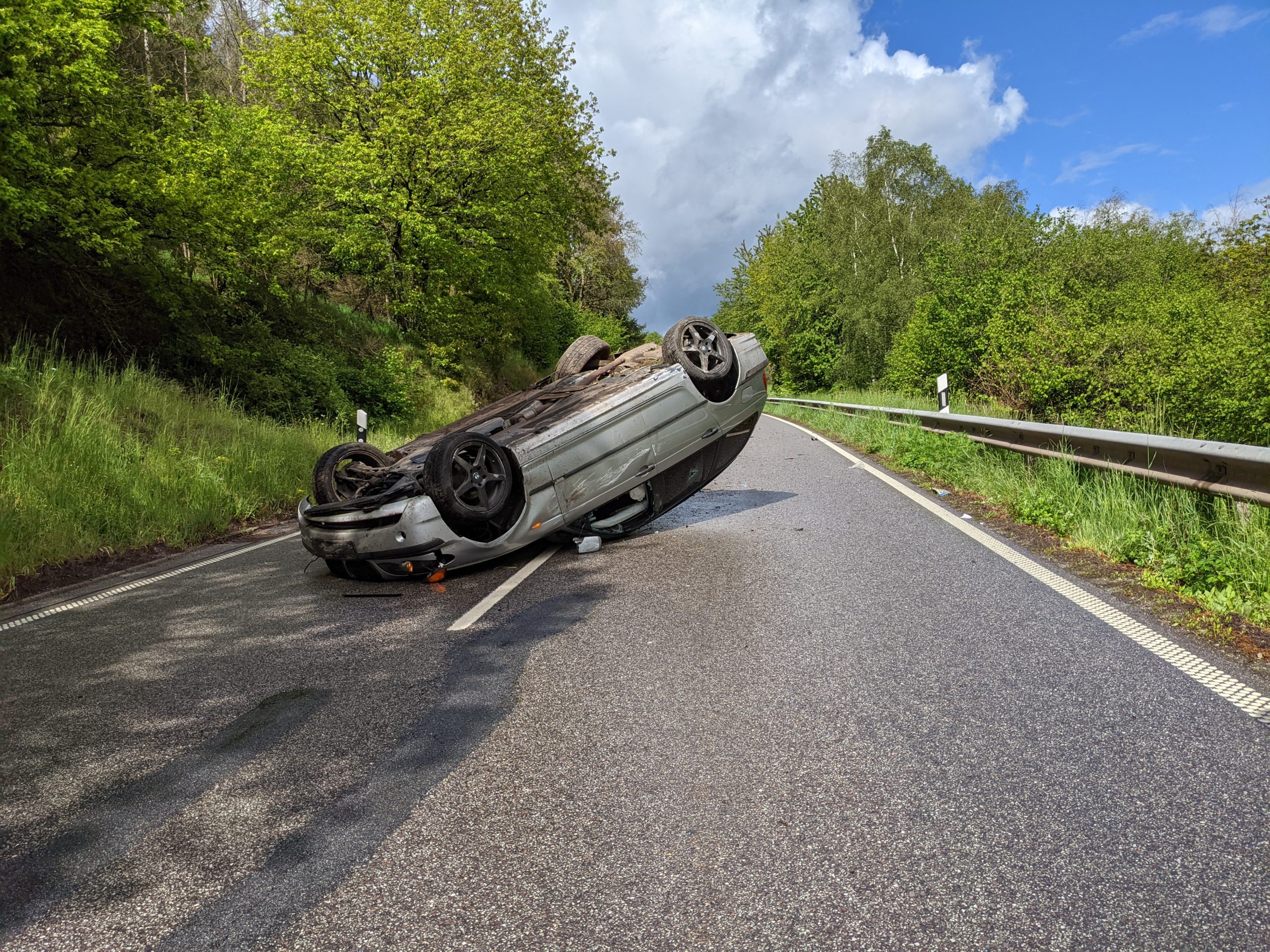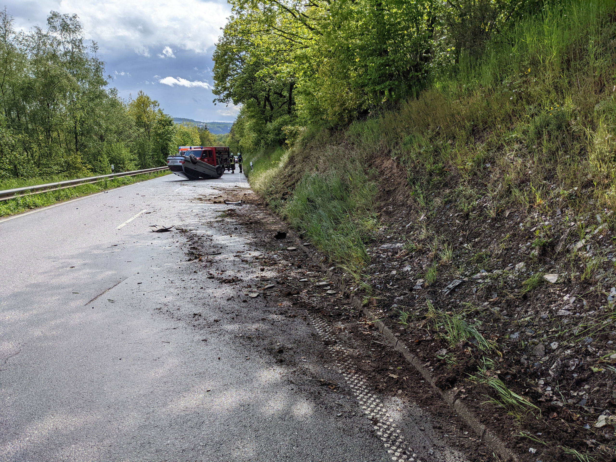 Ein 25 Fahrer aus dem Raum Trier-Saarburg kam mit seinem BMW auf nasser Fahrbahn nach einer Linkskurve von der Fahrbahn ab, rutschte in die Straßenböschung und blieb nach einem Überschlag auf dem Dach liegen.