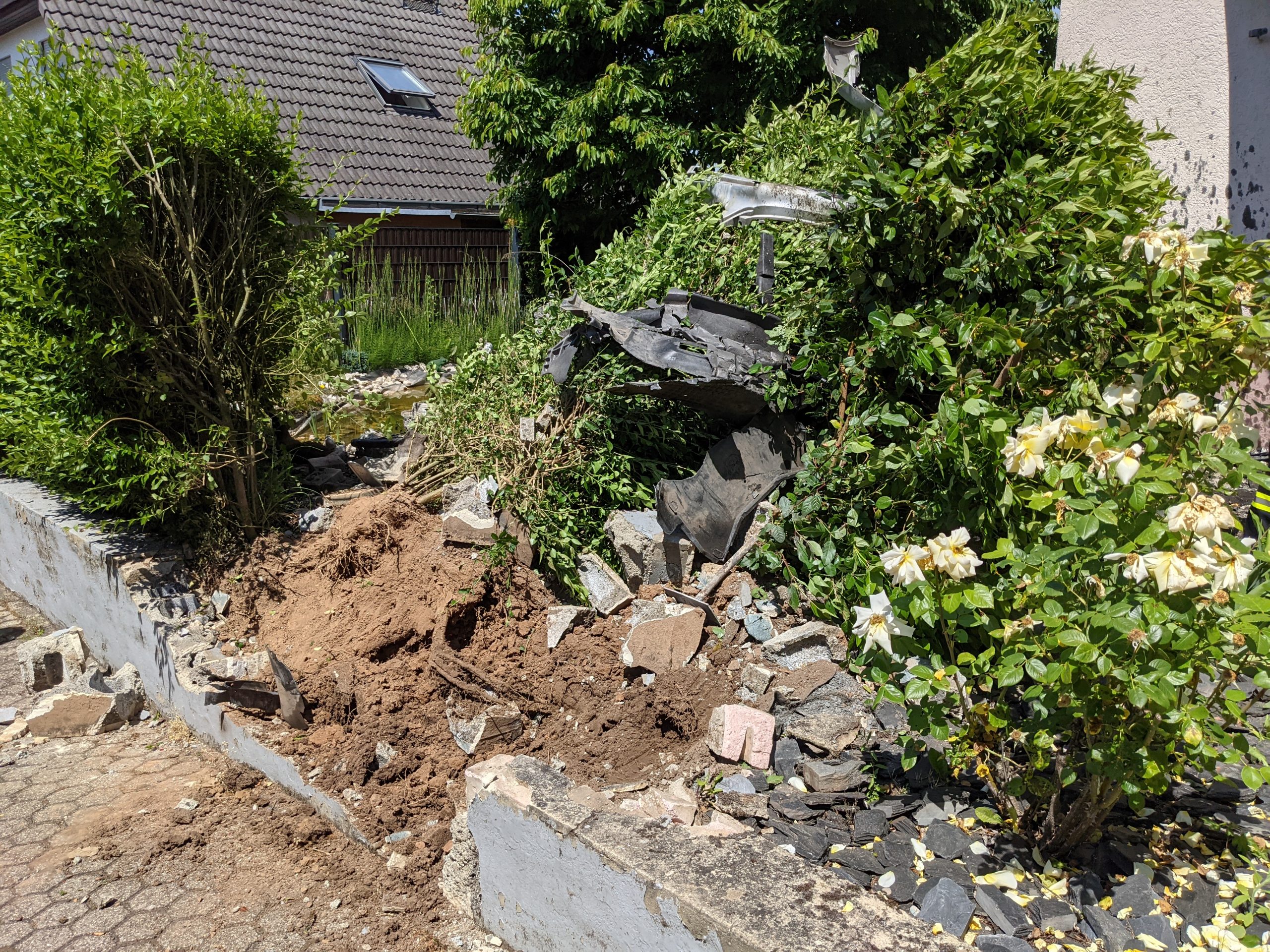 Konz-Roscheid. Am Dienstagvormittag kam es gegen 11.45 Uhr zu einem Unfall in Konz-Roscheid. Nach einem medizinischen Notfall hat ein älterer Mann im Wohngebiet die Kontrolle über sein Fahrzeug verloren, das Auto durchbrach daraufhin ungebremst eine Gartenmauer und eine Hecke, bis es kurz vor der Hauswand zum stehen kam.