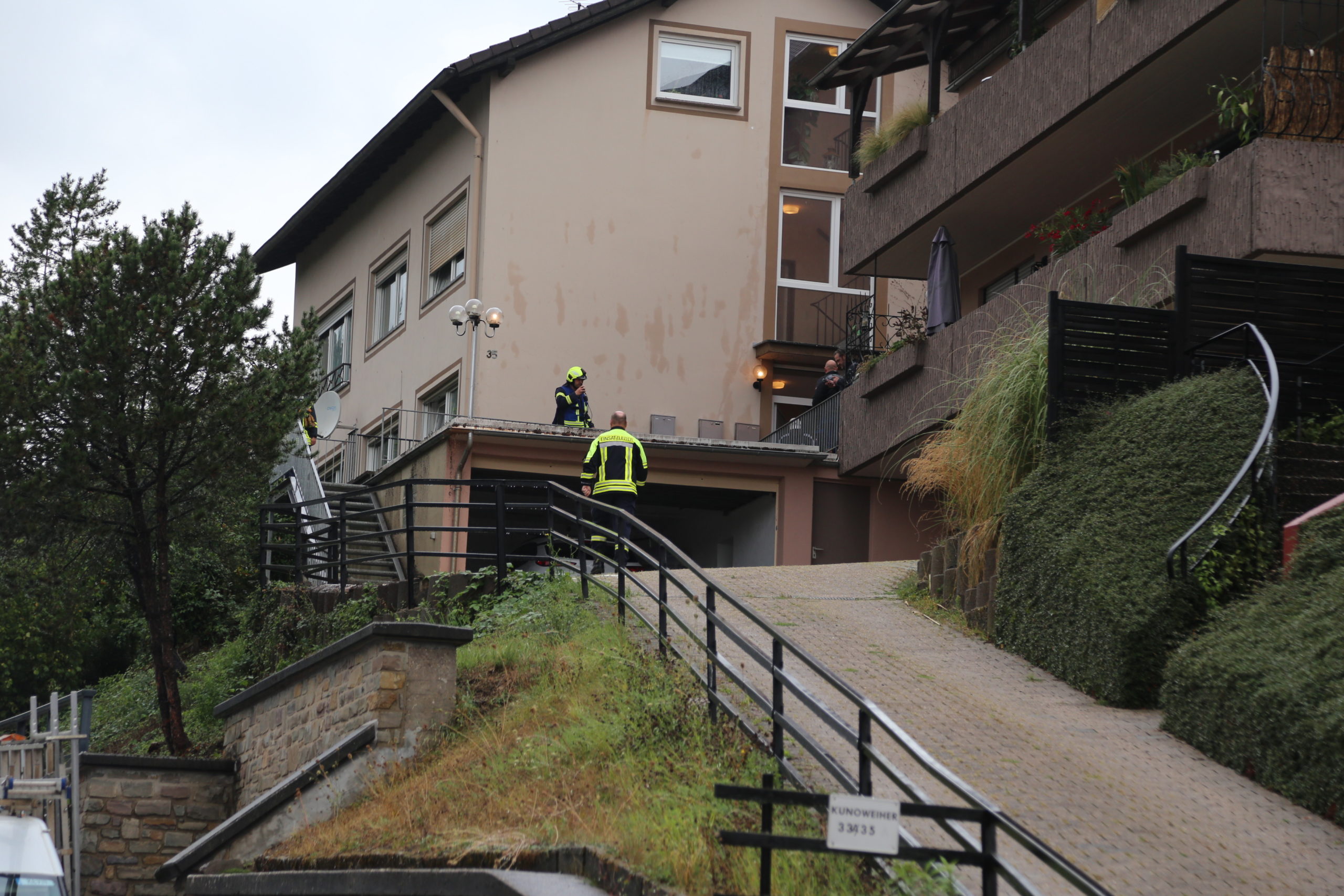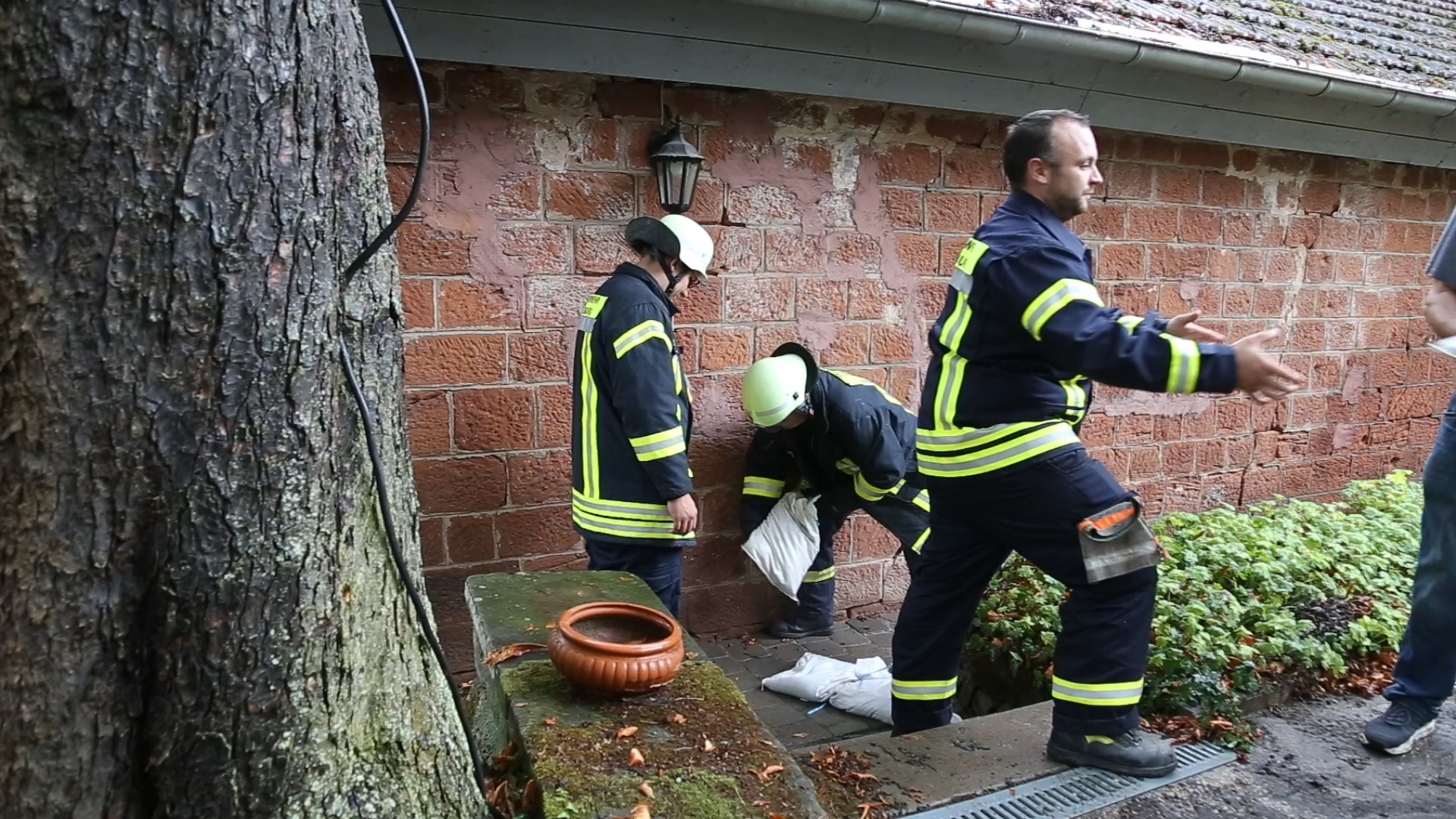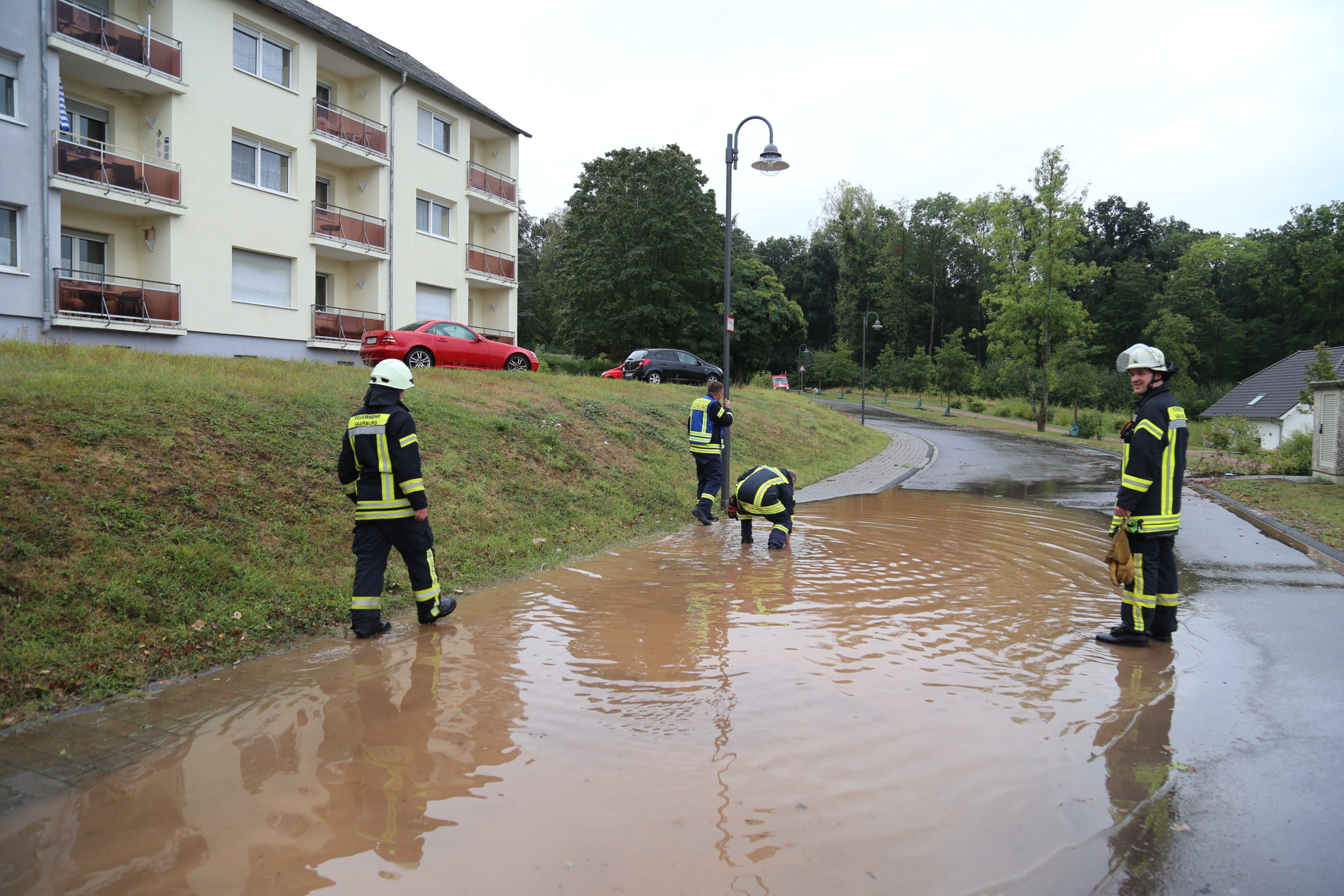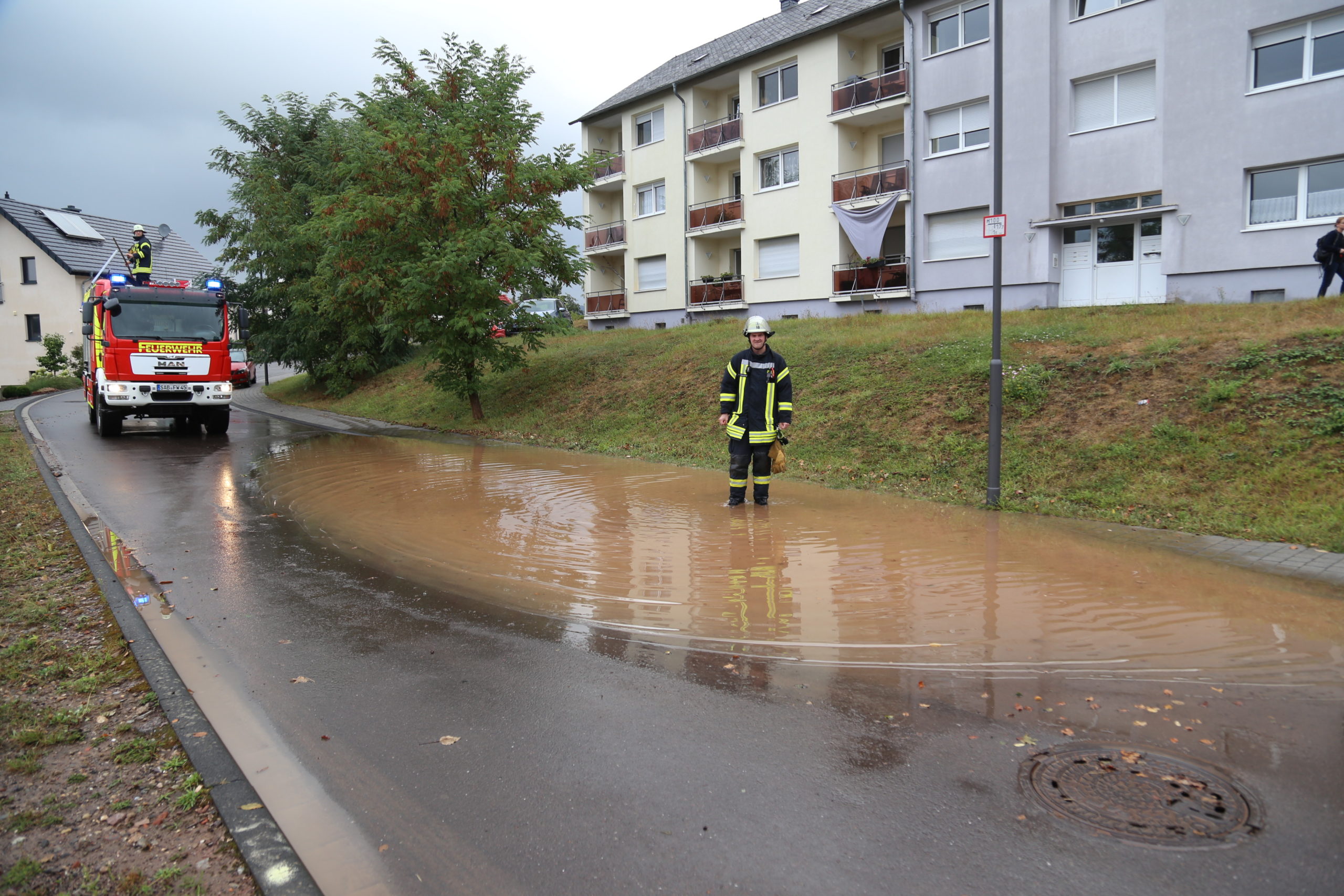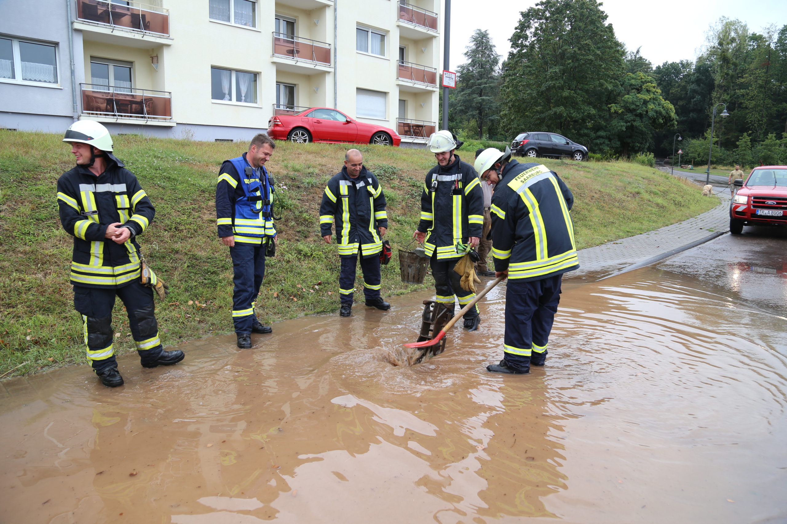An einen Hotel am Saarufer und einem Mehrfamilienhaus in der Kunoweiher Straße musste die Feuerwehr mit Sandsäcken aushelfen um größeren Schaden durch erneute Regenschauer zu vermeiden.