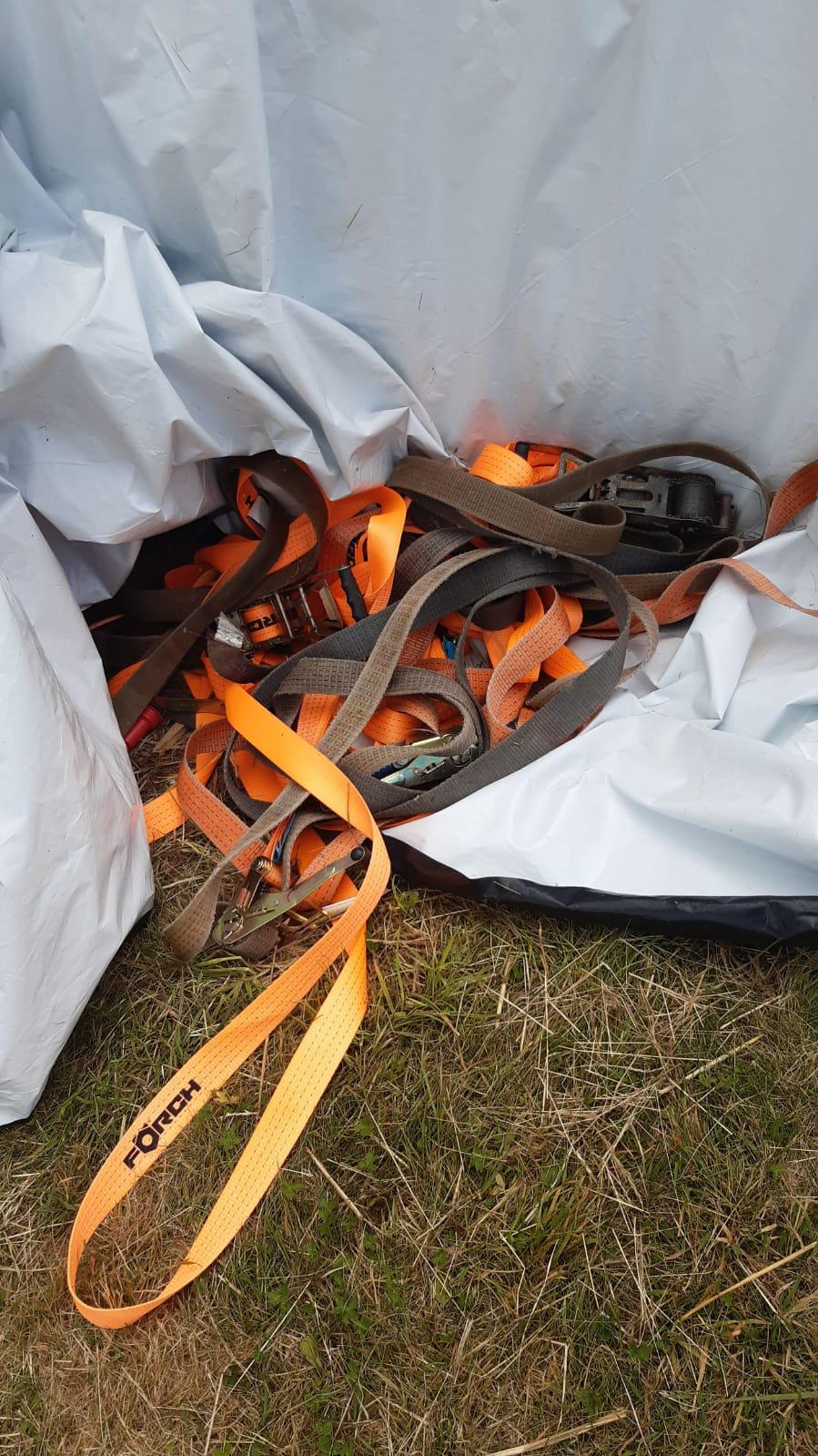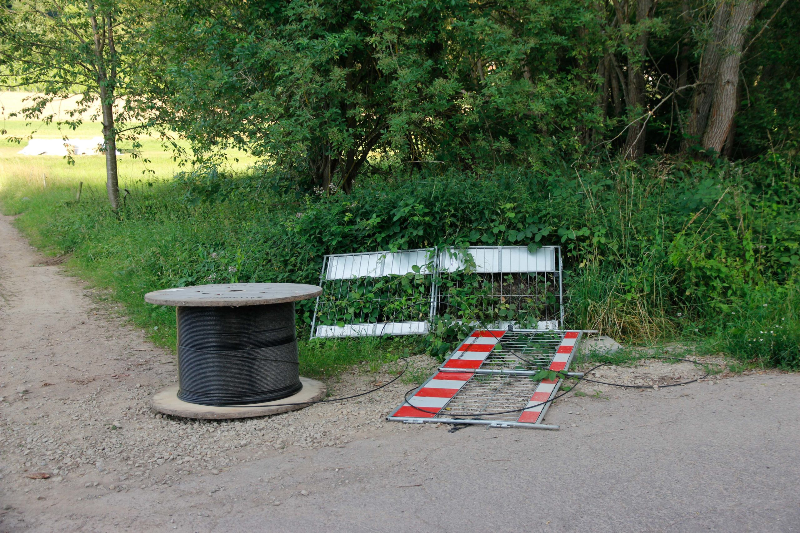 Außerdem wurde in der Zufahrt zum Wiesengrundstück eine Kabeltrommel aufgestellt;teils abgerollt und Warnbaken in die Böschung geworfen.