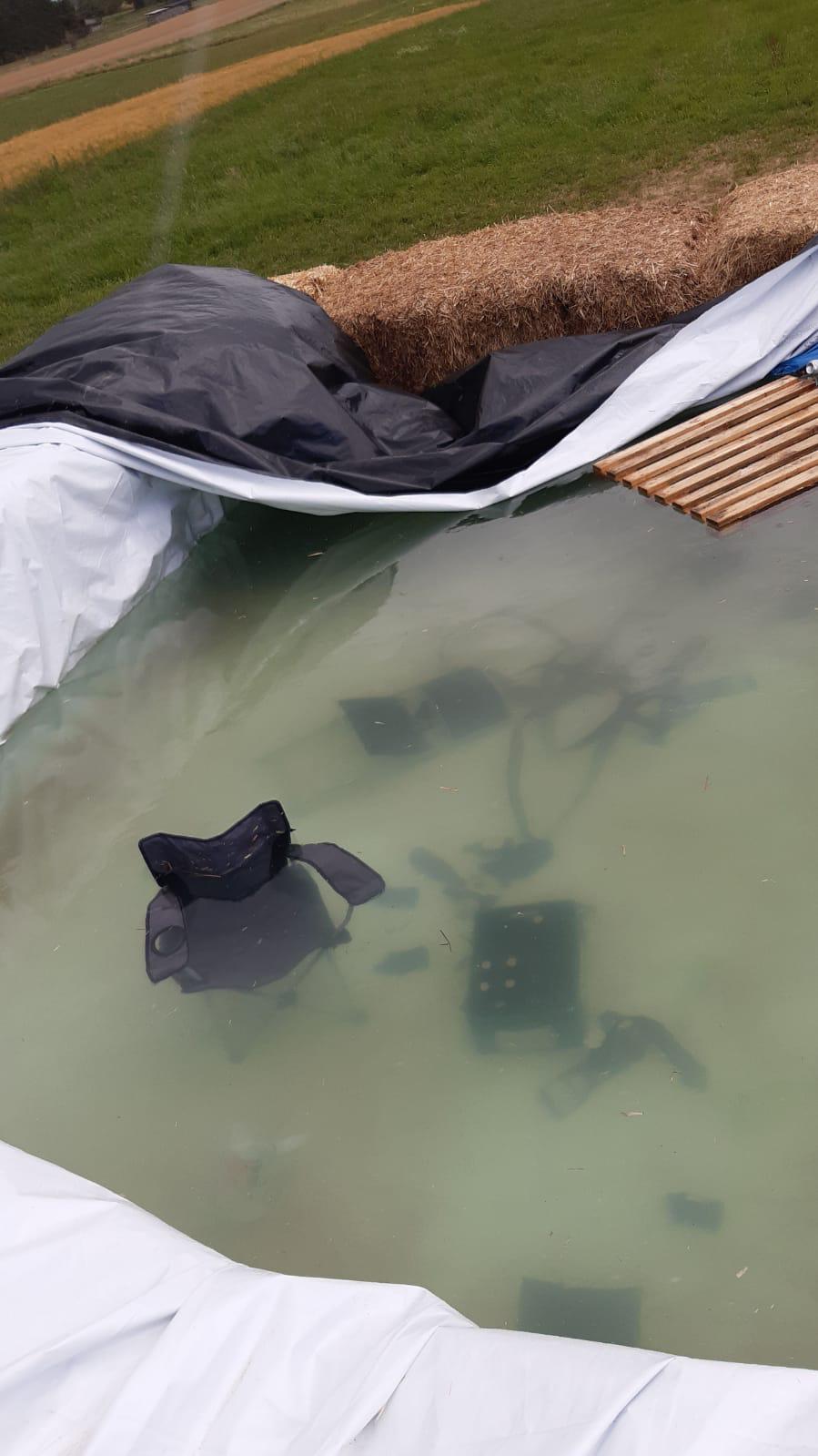Mit viel Arbeitseinsatz und Material stellten sie in Eigendynamik und zur Freizeitgestaltung in Eigenleistung einen großen Pool auf einer privaten Wiese in der Gemarkung Irsch in Richtung Schoden ( Freielsbach) her. Mit Rund und Strohballen, einer entsprechenden wasserdichten Folie und einigen 50mm Spanngurten wurde das Becken mit einem Durchmesser von circa 6×6 Meter erstellt. Hinzu kommt der zeitliche Aufwand, das Becken mit Traktoren und Tankwagen zu füllen.
