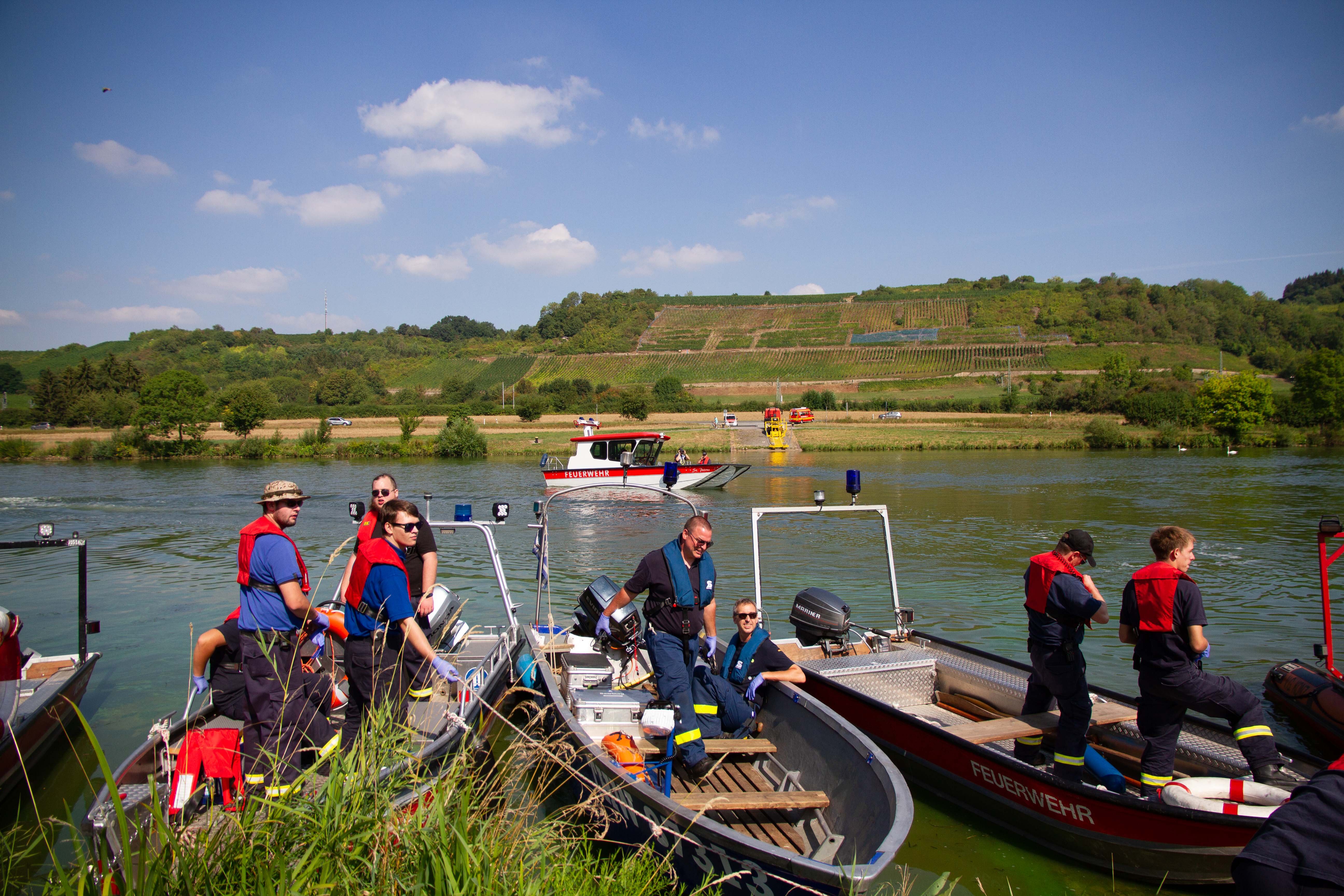 Knotenkunde und allgemeine Grundlagen sowie das Anlegen eines Atemschutzgerätes mit Schwimmweste, Ankermanöver, Anlege – und Abschleppmanöver waren ein Schwerpunkt der gemeinsamen Übung. Die Gruppen Theorie Praxis wechselten die Aufgabenbereiche. Auch die Führungsstrukturen wurden geübt. An die fünfzig Einsatzkräfte waren an der Übung beteiligt. Wegen der derzeitigen Blaualgen auf der Mosel wurden Vorsicht halber von einigen Kameraden Schutzhandschuhe eingesetzt, die unmittelbar mit dem Wasser in Kontakt kamen.