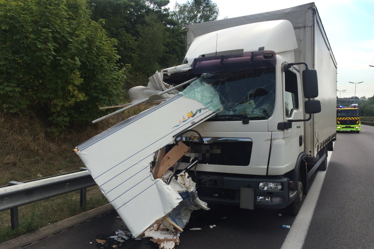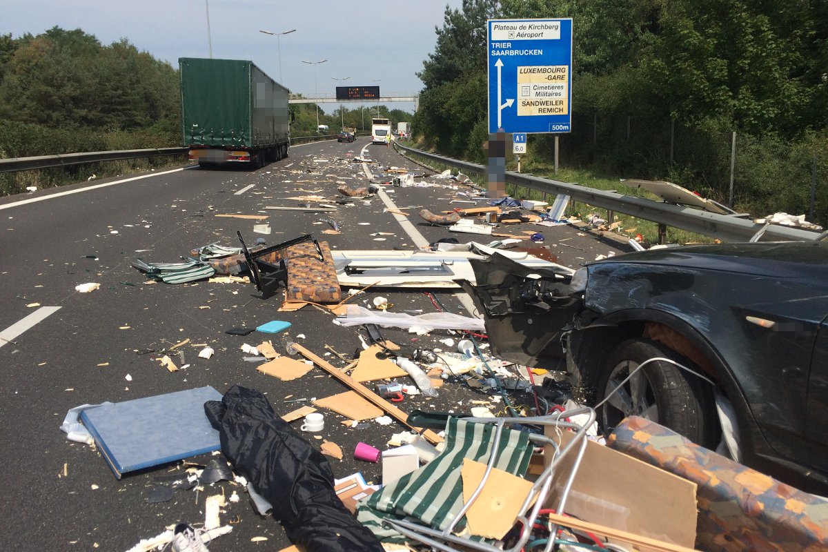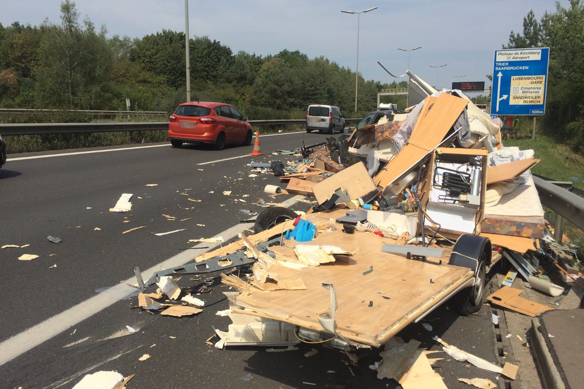 Auf der Autobahn A1 in Richtung Trier kam es kurz vor der Ausfahrt Sandweiler zu einem Verkehrsunfall grösseren Ausmaßes. Ein Wohnanhänger wurde von einem Lastkraftwagen erfasst und zertrümmerte in mehrere Einzelteile. Die genaue Unfallursache ist zurzeit noch nicht bekannt. Durch den Aufprall wurde der Lkw-Fahrer leicht verletzt.