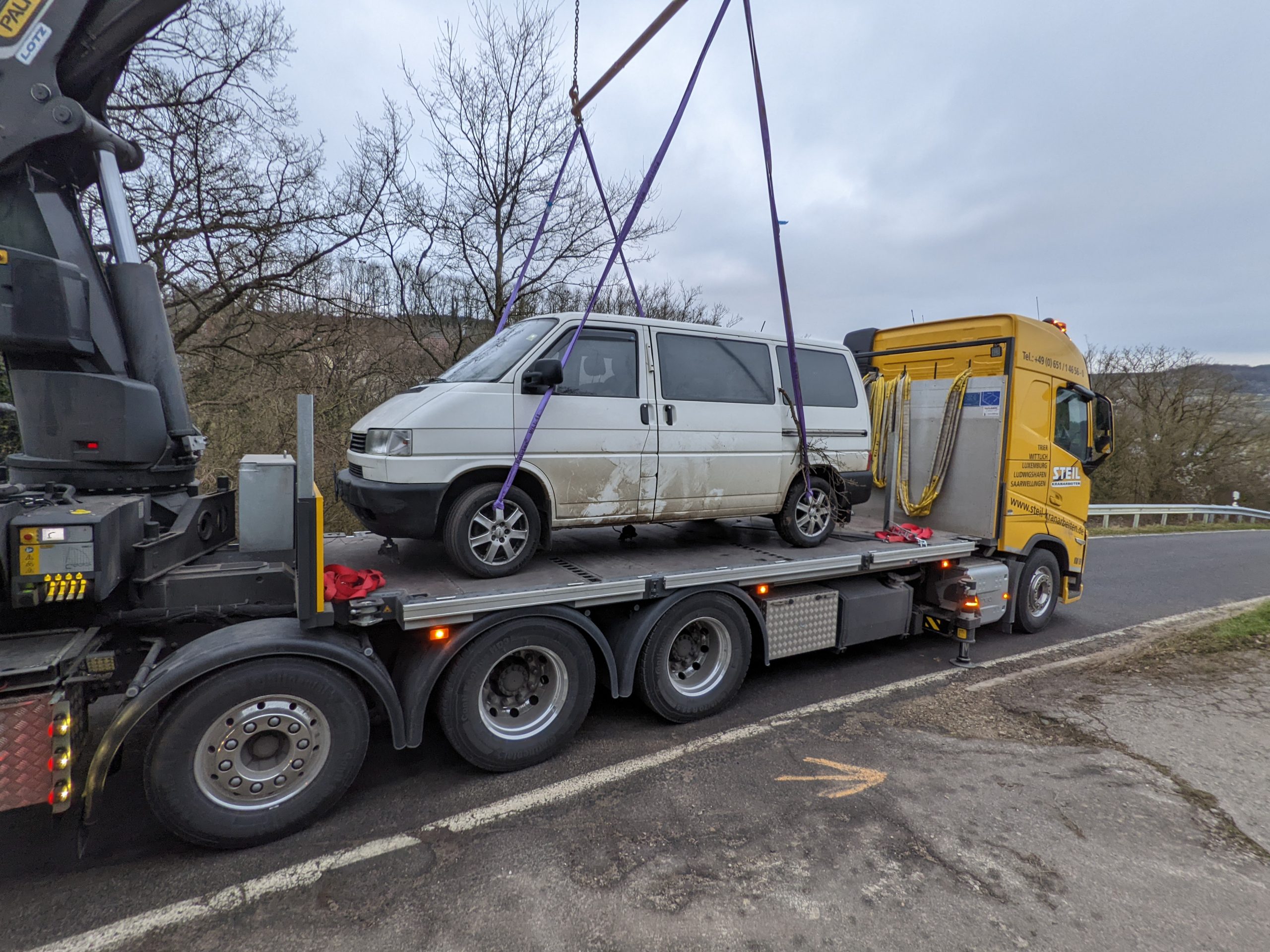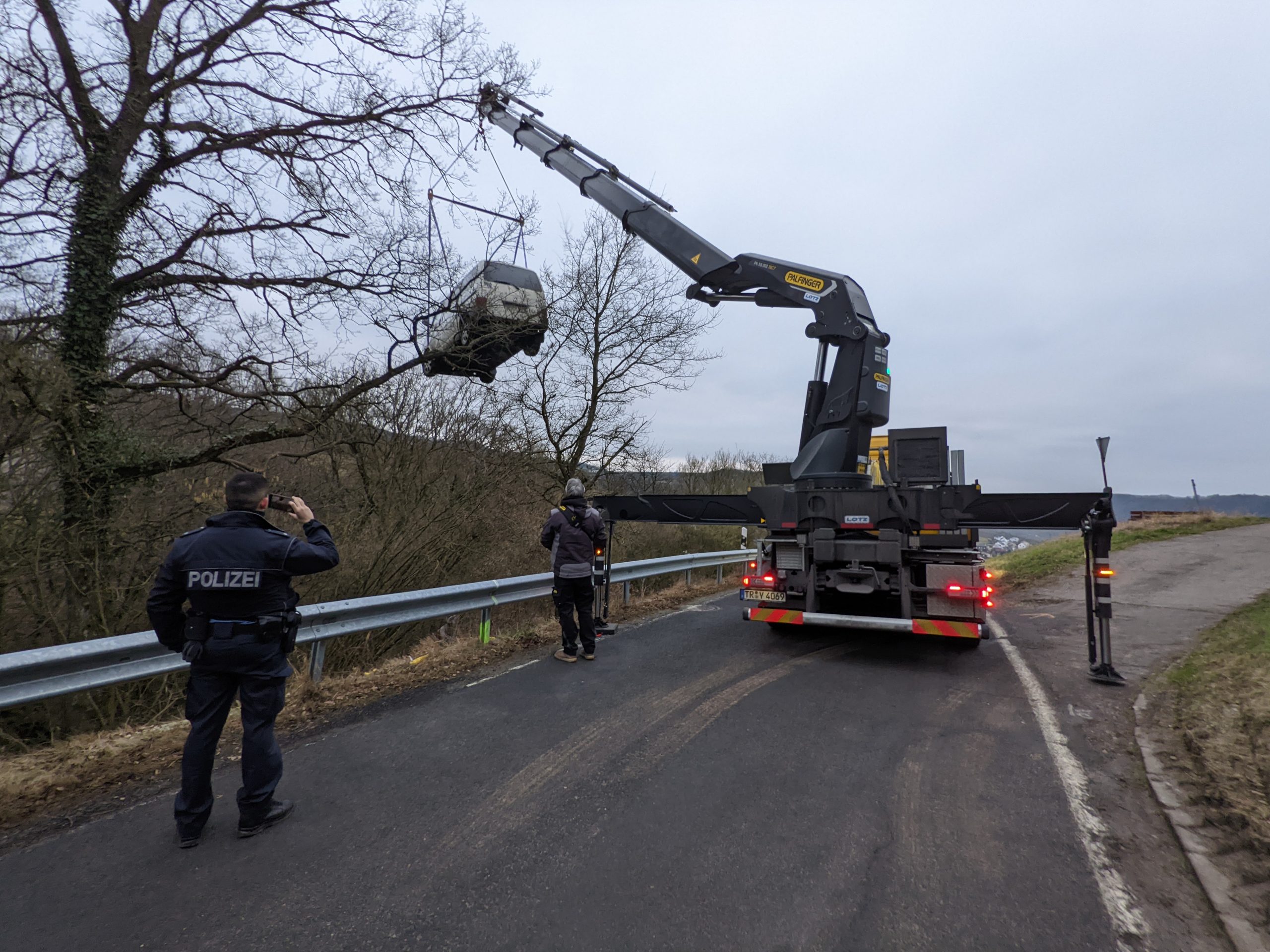 Beim Befahren der Wiese wurde ein Baum und ein Zaun beschädigt. Der 57-jährige Fahrer aus dem Saarland blieb offenbar unverletzt, verließ die Unfallstelle und informierte erst am Folgetag die Polizei über das Unfallgeschehen. Diese veranlasste die Bergung des VW-Busses mittels eines Schwerlastkrans aus dem Waldstück.