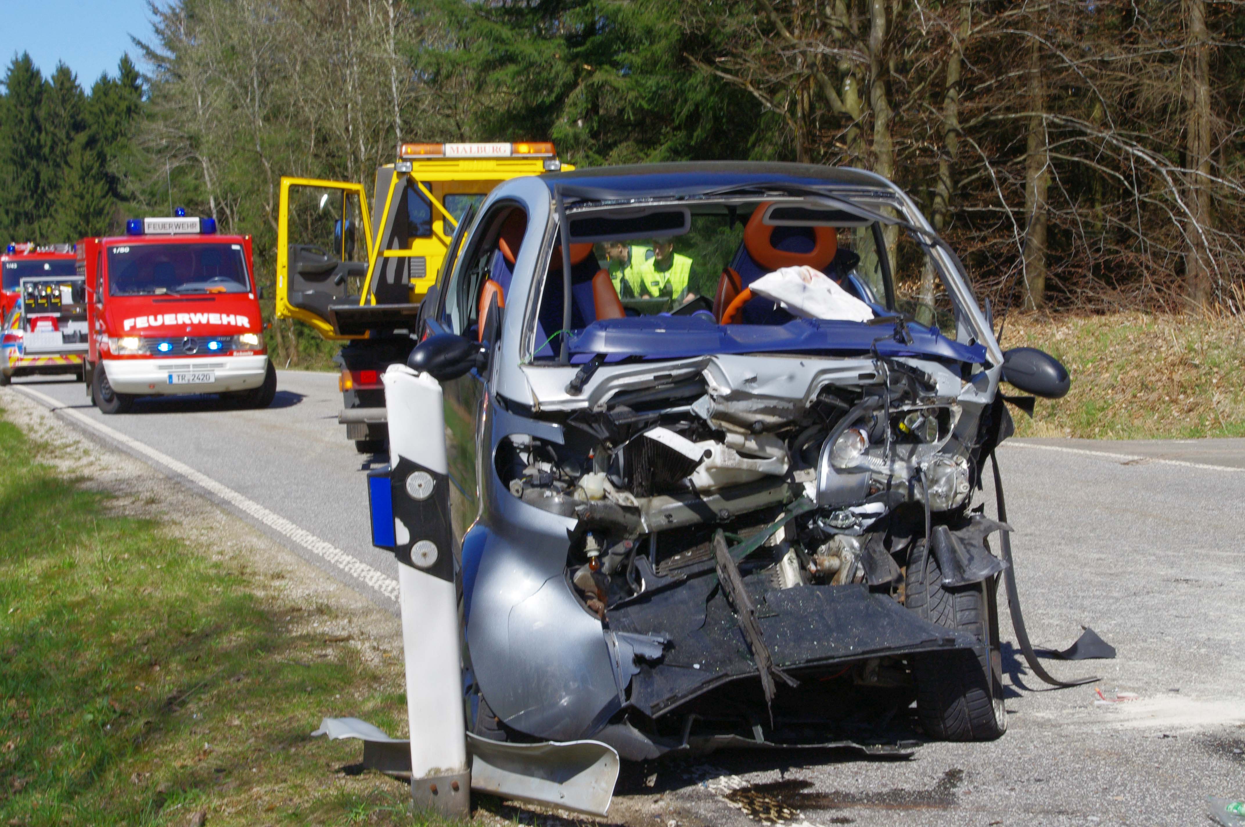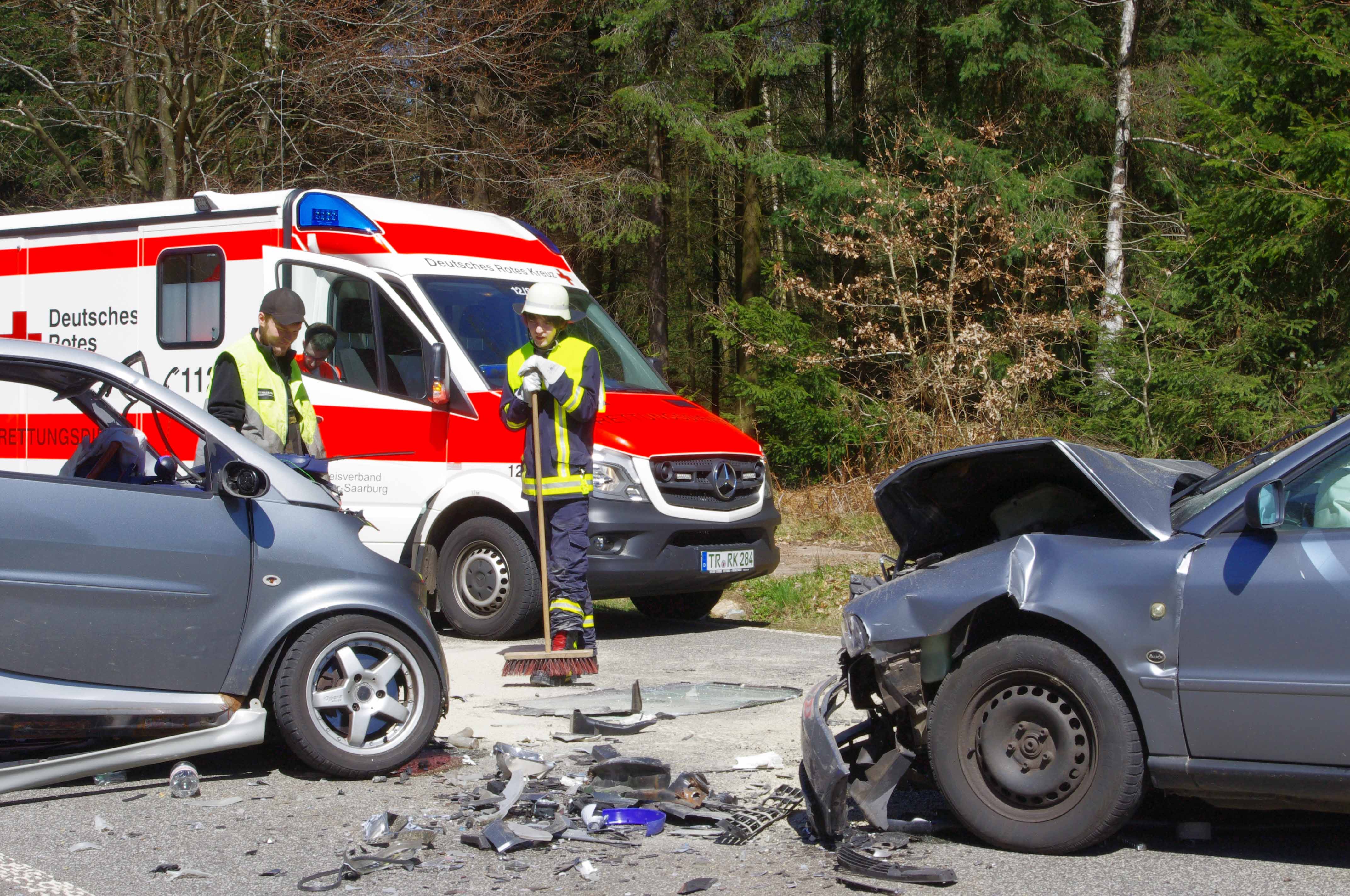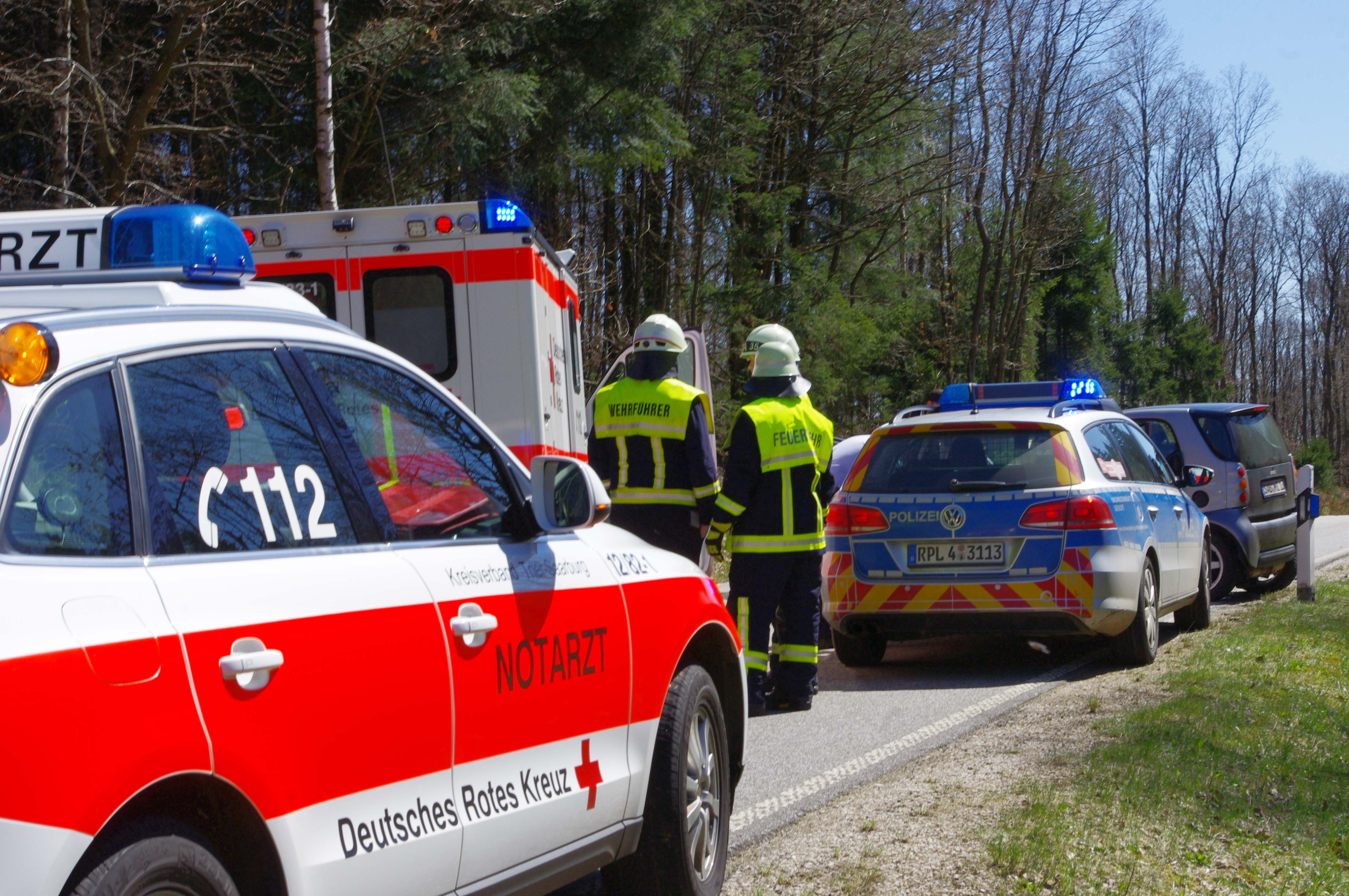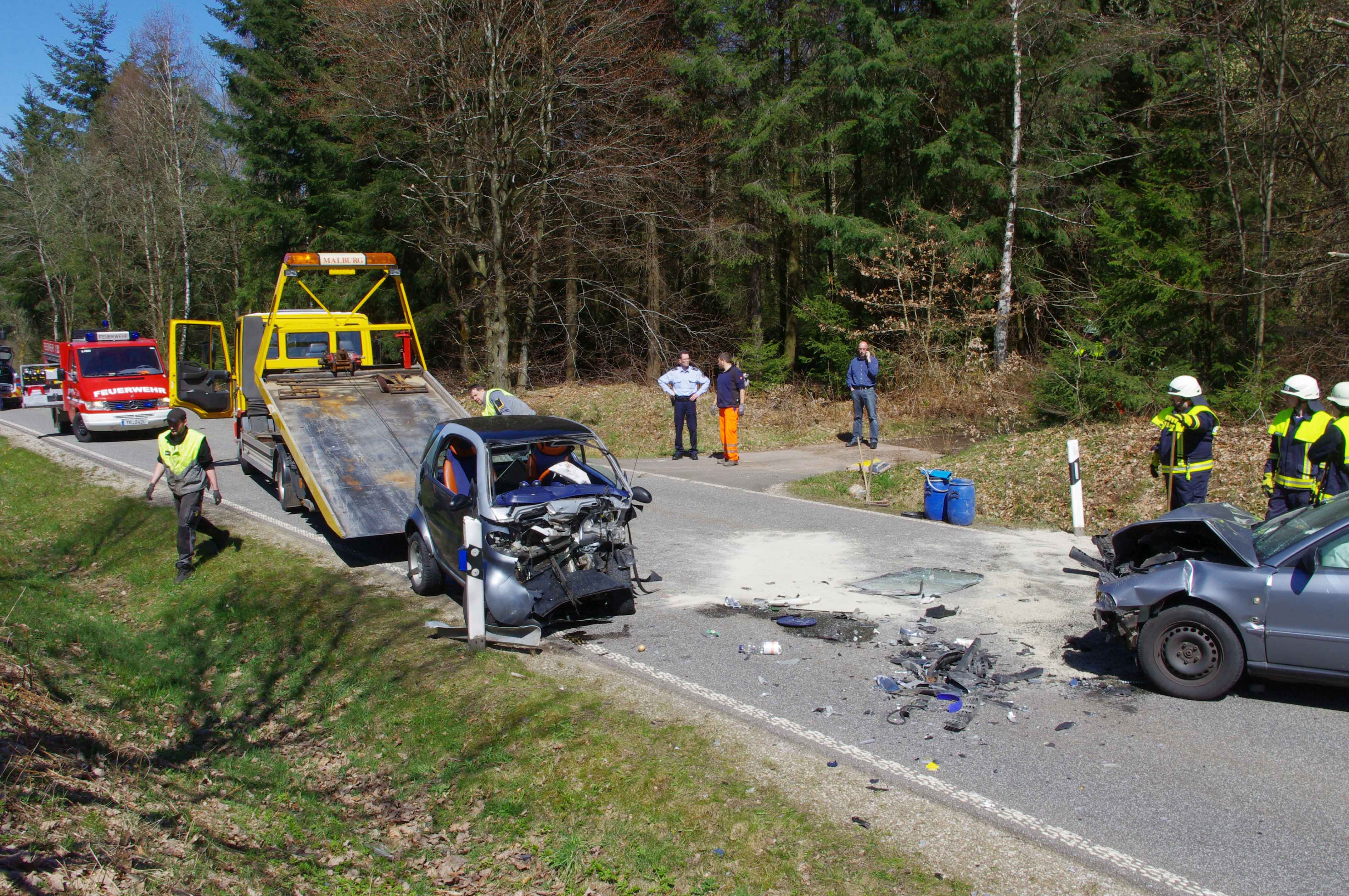 Am Mittwoch, 20. April 2016, gegen 13:35 Uhr, befuhr eine 32 jährige Pkw-Fahrerin aus dem Kreis Trier-Saarburg mit ihrem Smart die Landesstraße 147 aus Richtung Hermeskeil in Richtung Gusenburg. Auf einer leicht ansteigenden Geraden kam diese kurz vor einer Kuppe aus bislang ungeklärter Ursache auf die linke Fahrbahnseite. Hier stieß sie frontal mit dem entgegenkommenden Pkw eines 52 jährigen Audi-Fahrers aus dem Saarland zusammen. Der schwer verletzte Audi-Fahrer konnte sich selbst aus seinem total beschädigten Auto selbst befreien. Die Fahrerin des Smart musste von Kräften der Freiwilligen Feuerwehr Hermeskeil aus ihrem ebenfalls totalbeschädigten Pkw geborgen werden. Beide Fahrer wurden in verschiedene Krankenhäuser verbracht. Im Einsatz befanden sich die PI Hermeskeil, die Freiwillige Feuerwehr und Straßenmeisterei Hermeskeil, sowie Rettungskräfte des DRK und ein Notarzt.