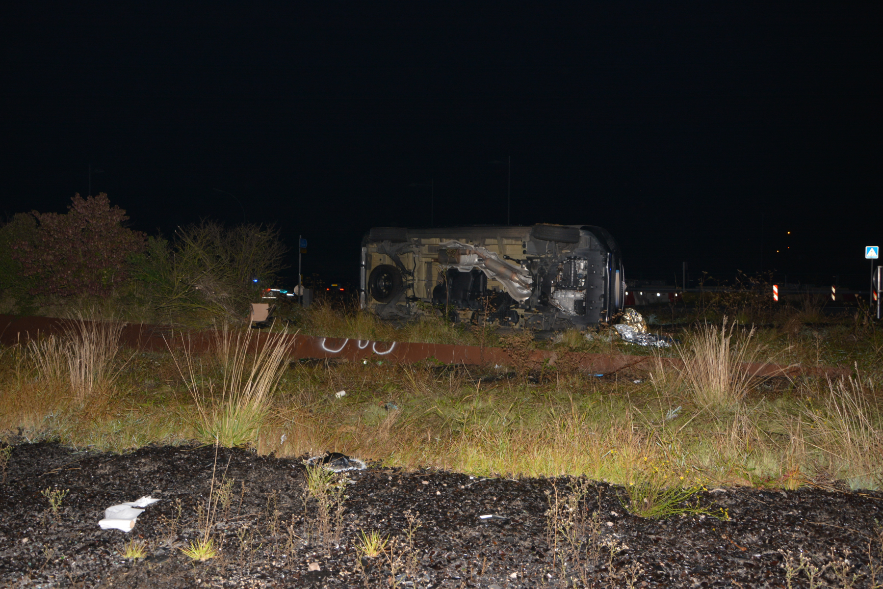 In der Folge überschlug sich das Fahrzeug und kam seitlich liegend im Kreisverkehr zu Stillstand. Insgesamt befanden sich zum Unfallzeitpunkt 9 Personen im Wagen von welchen mehrere aus dem Unfallwagen herausgeschleudert wurden. Eine junge Frau wurde im Wageninneren eingeklemmt und musste seiten den Rettungsdiensten befreit werden.