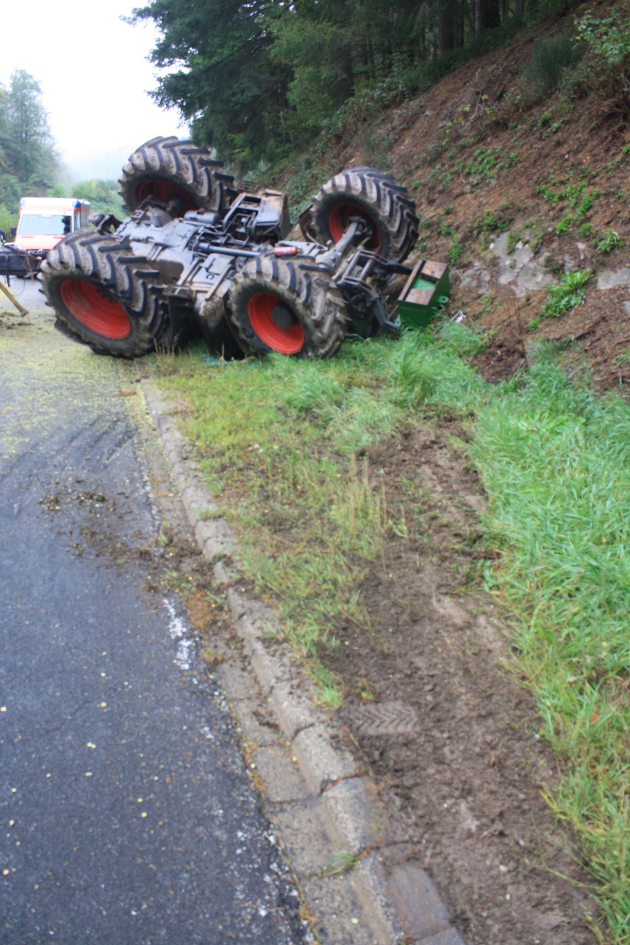 Der Traktor blieb auf dem Dach liegen. Der Fahrer konnte das Führerhaus aus eigener Kraft verlassen und wurde nach Erstbehandlung dem Krankenhaus zugeführte. Er zog sich glücklicherweise nur leichte Verletzungen zu. Der entstandene Schaden dürfte sich im mittleren fünfstelligen Bereich belaufen.