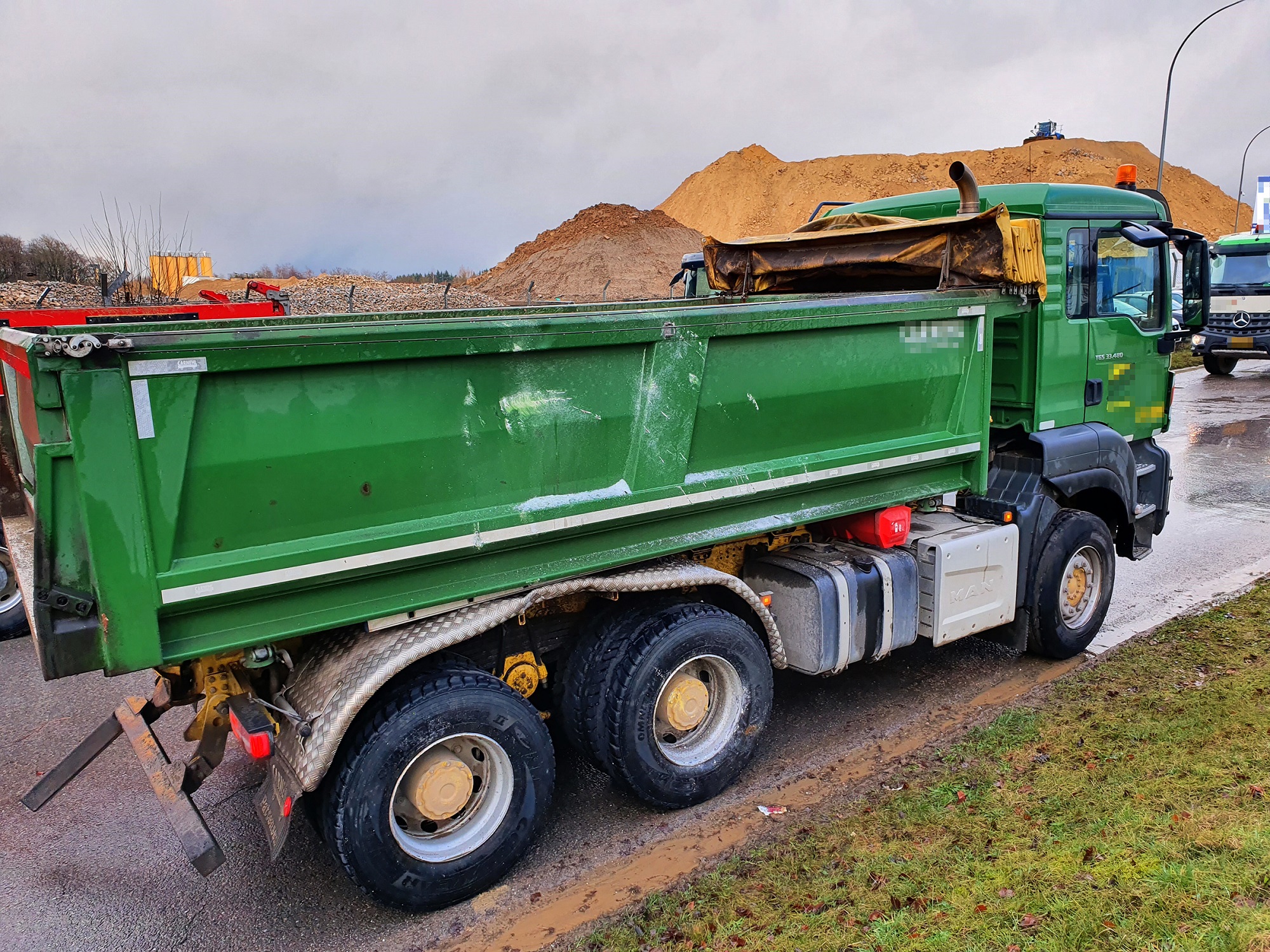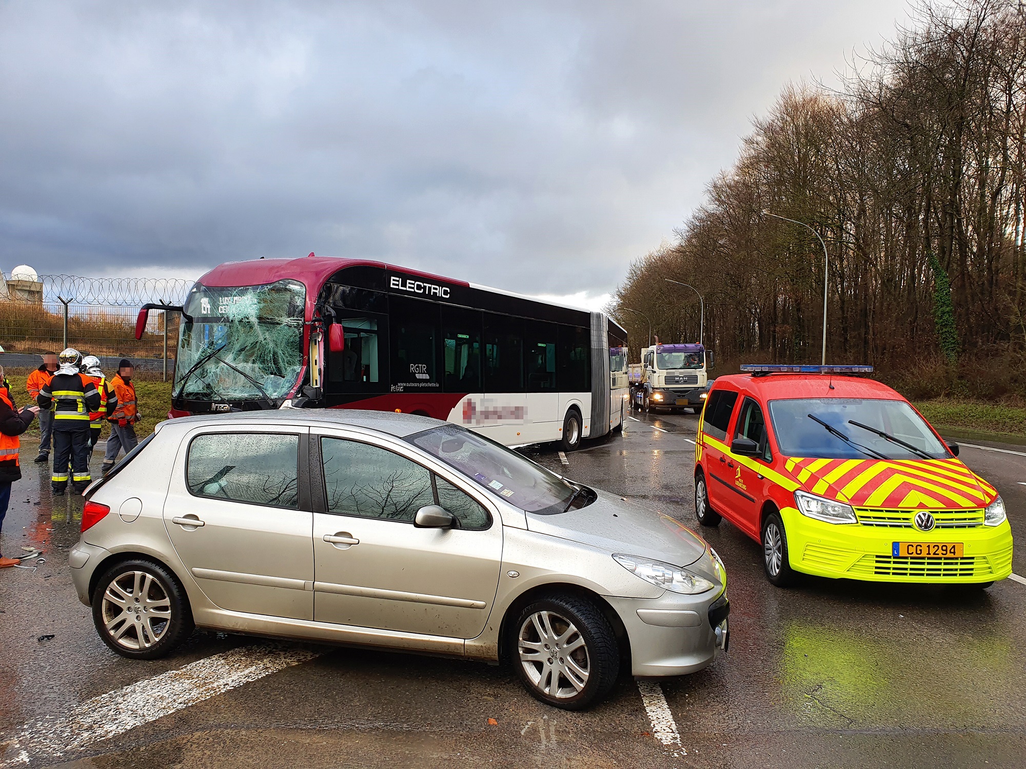 Ein aus Richtung Kreisverkehr Irrgarten kommender Lkw, wurde beim Einbiegen auf das Firmengelände von einem aus Richtung Sandweiler kommenden Linienbus erfasst und gegen einen in der Ausfahrt des Firmengeländes stehenden Pkw gedrückt.