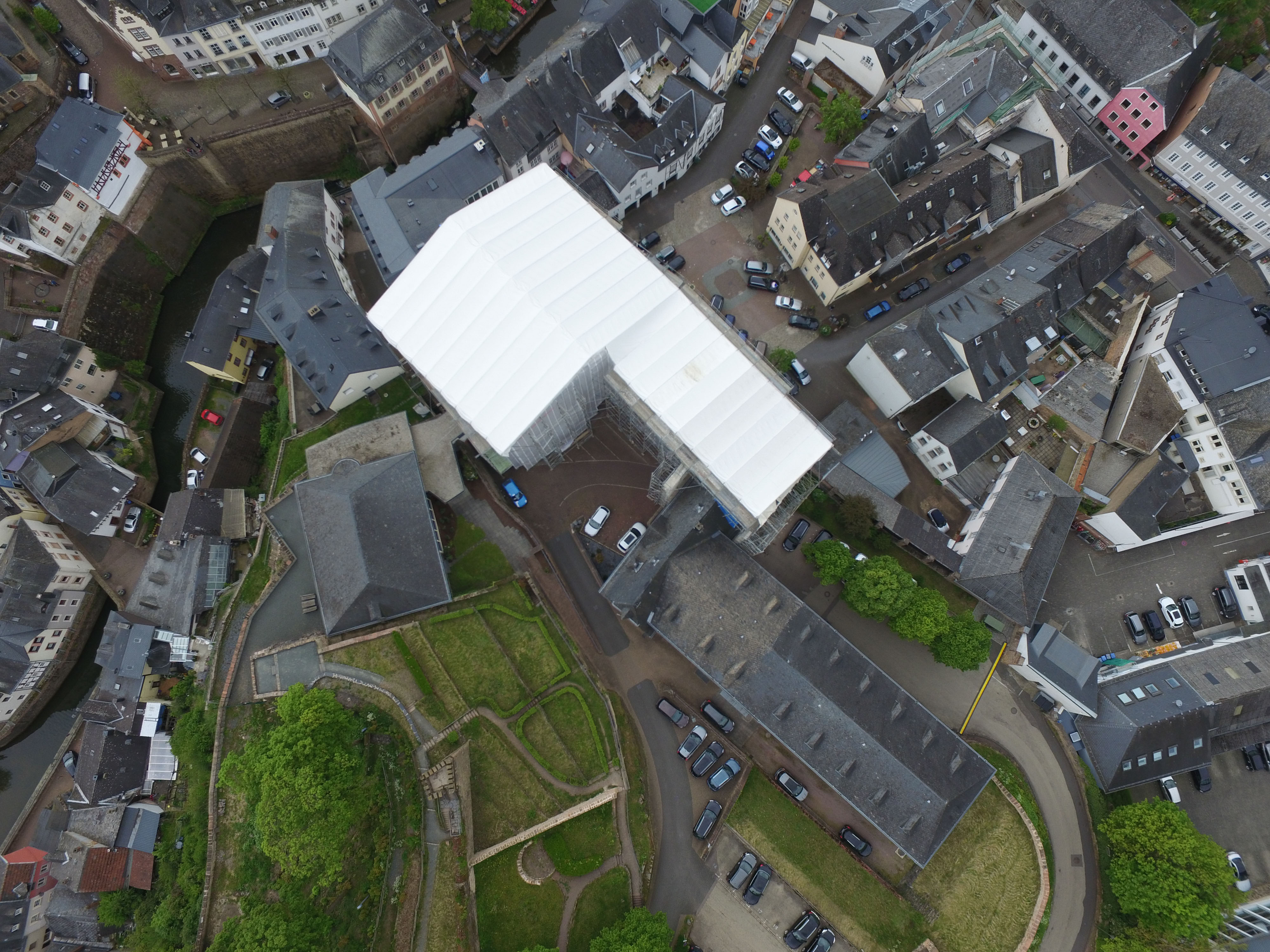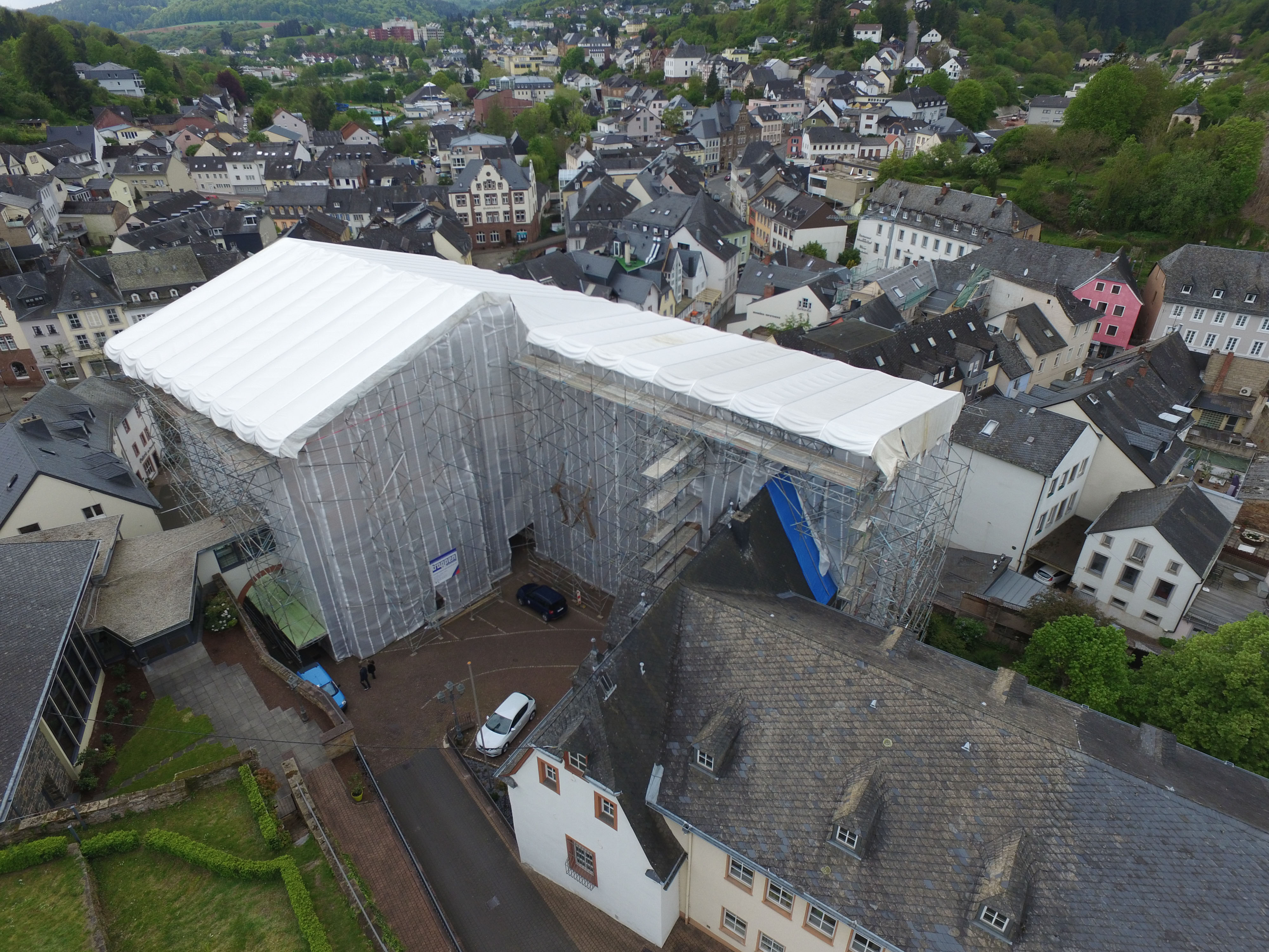 Saarburg. Schon von weitem ist die große weiße Plane erkennbar, die seid dem verheerenden Brand der Verbandsgemeinde im letzten Jahr die Reste umhüllt.Brandursache war ein Maderfraß durch den beim anfressen eines Kabels im 400 Jahre alten Dachgebälk Funken entstanden , die dann zusammen mit der erhöhten Außentemperatur zum Ausbruch des Feuers geführt haben.