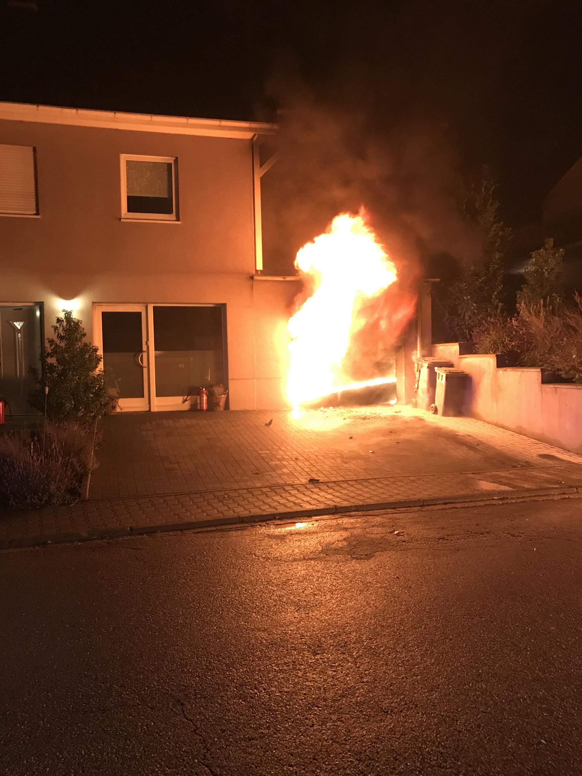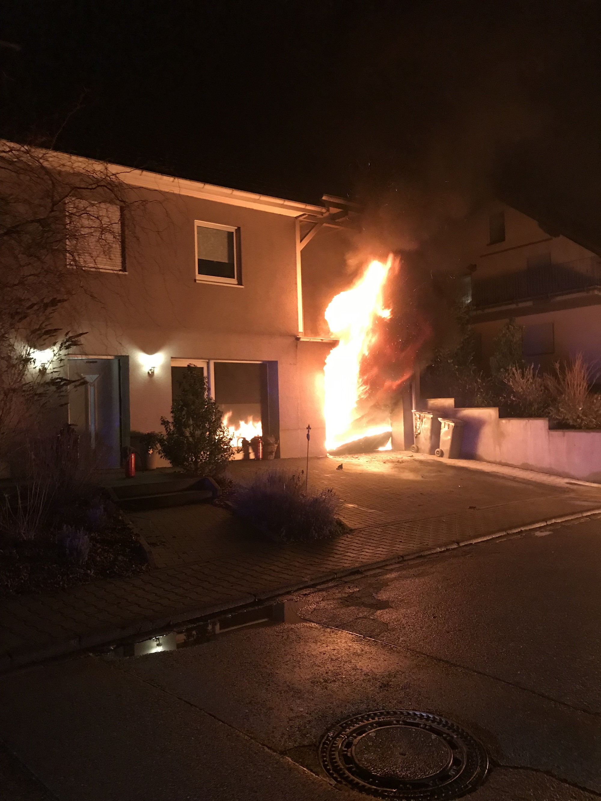 Der brennende PKW in der Garge konnte noch durch einen Bewohner in der abschüssigen Einfahrt auf die Strasse durchs Lösen der Handbremse aus der Garage entfernt werden. Offenbar wegen eines techn. Defekts geriet der PKW in der Garage in Brand. Der Familienvater hatte sich hierbei eine schwere Rauchgasvergiftung zugezogen.
