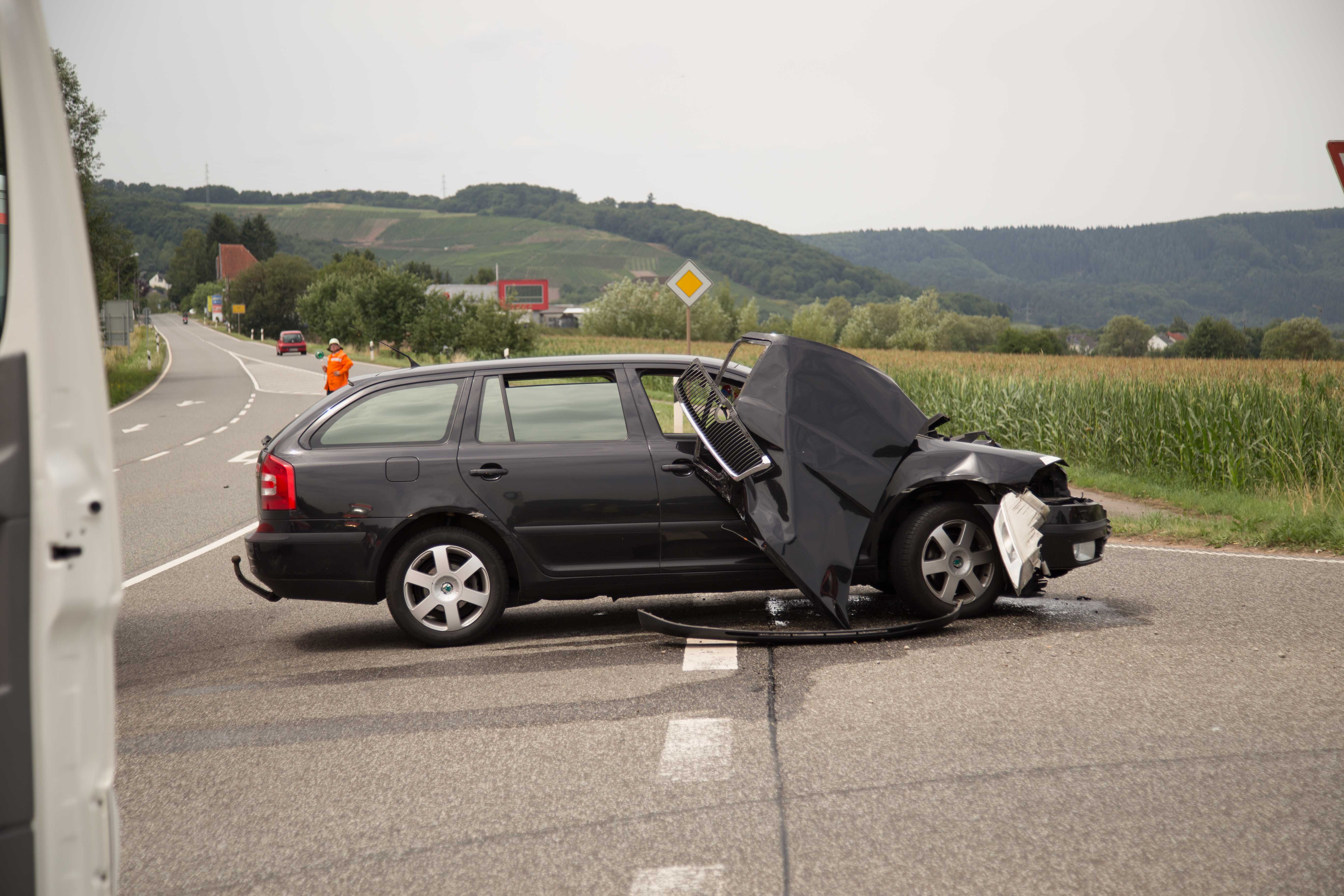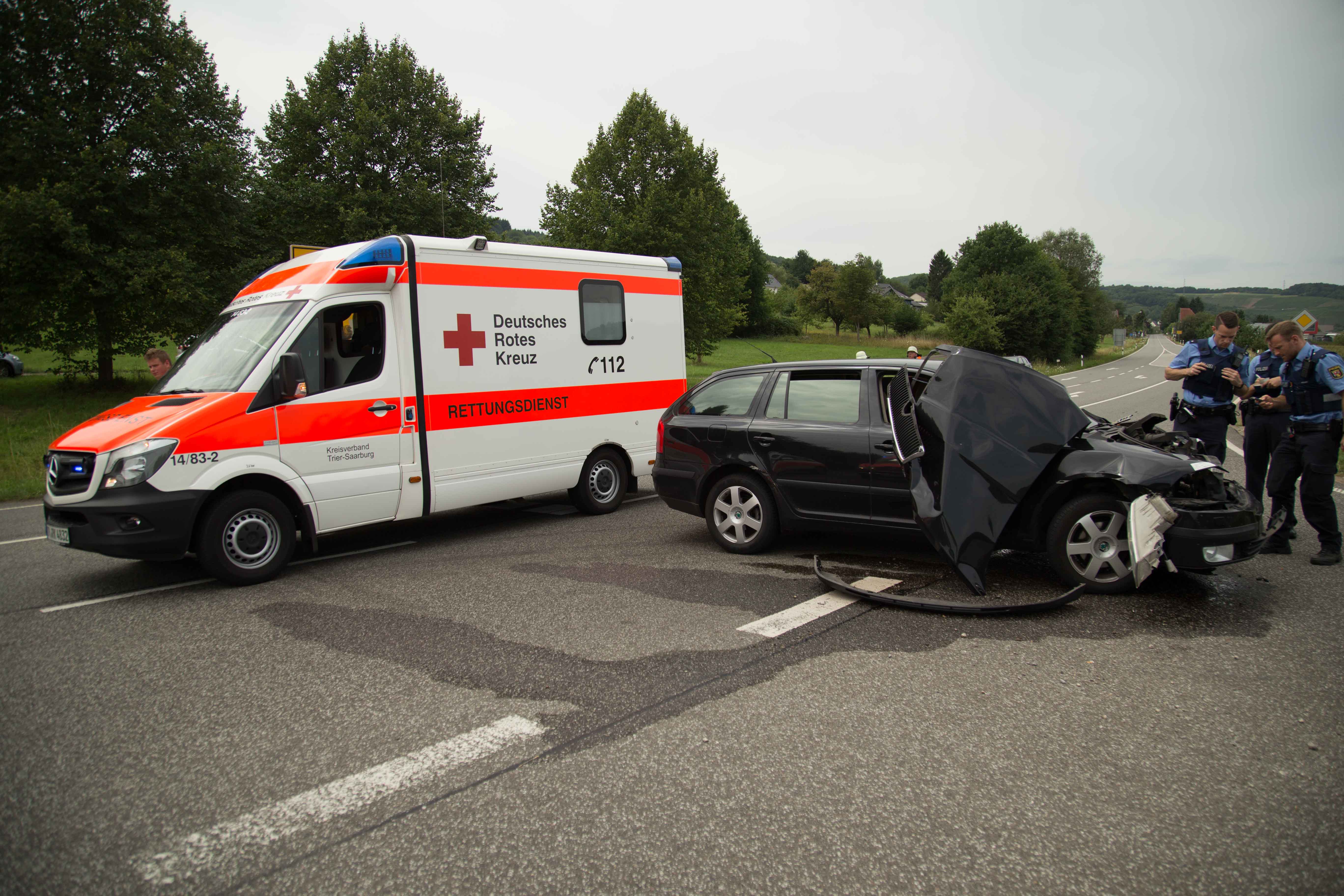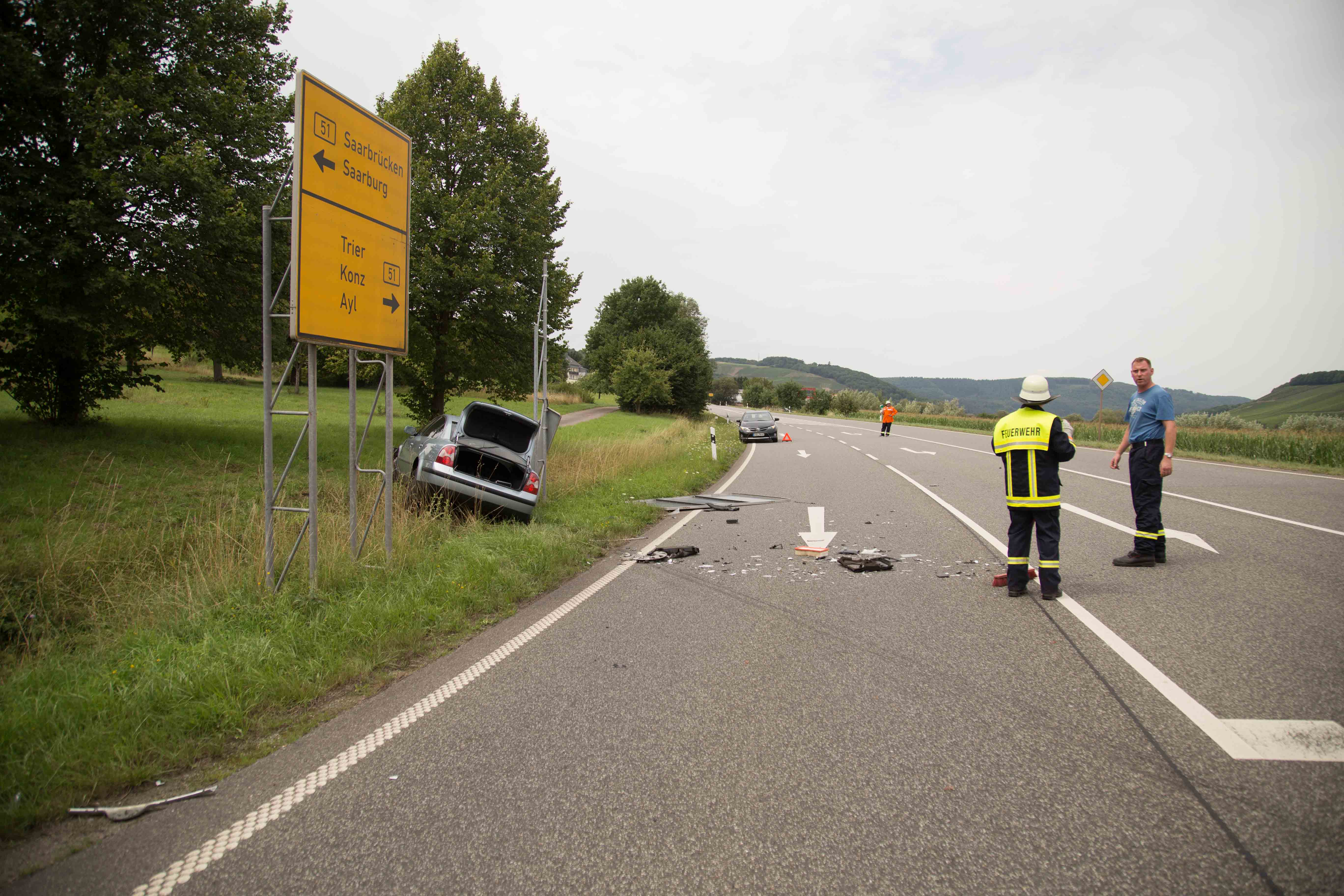 Der 32 jähriger Fahrer eines VW Passats befuhr die Bundesstraße 51 aus Saarburg kommend in Richtung Ayl. Als ein 37 jähriger Skodafahrer von Biebelhausen links auf die B51 Richtung Saarburg abbiegen wollte kam es zu einem heftigem Zusammenprall.