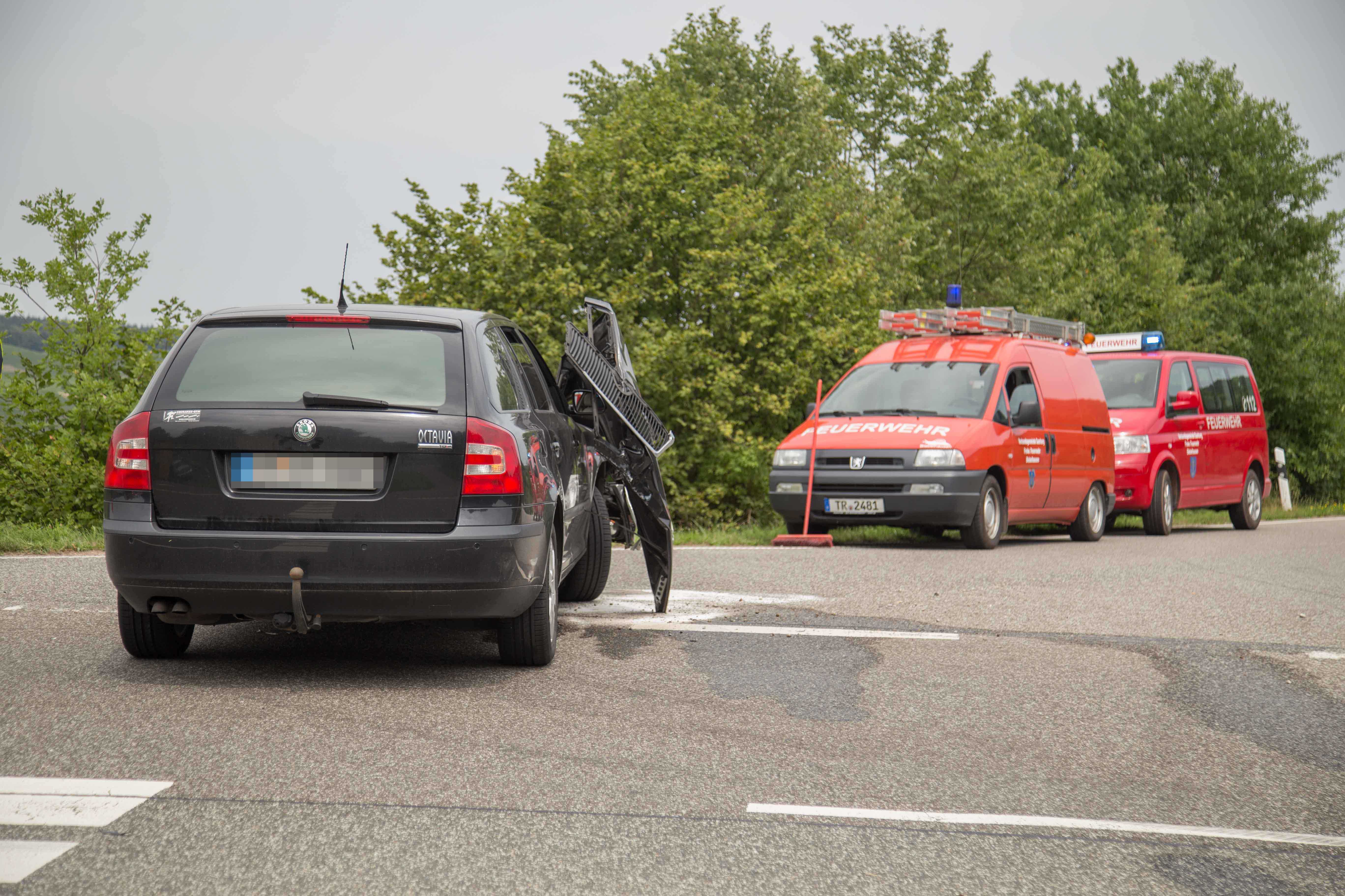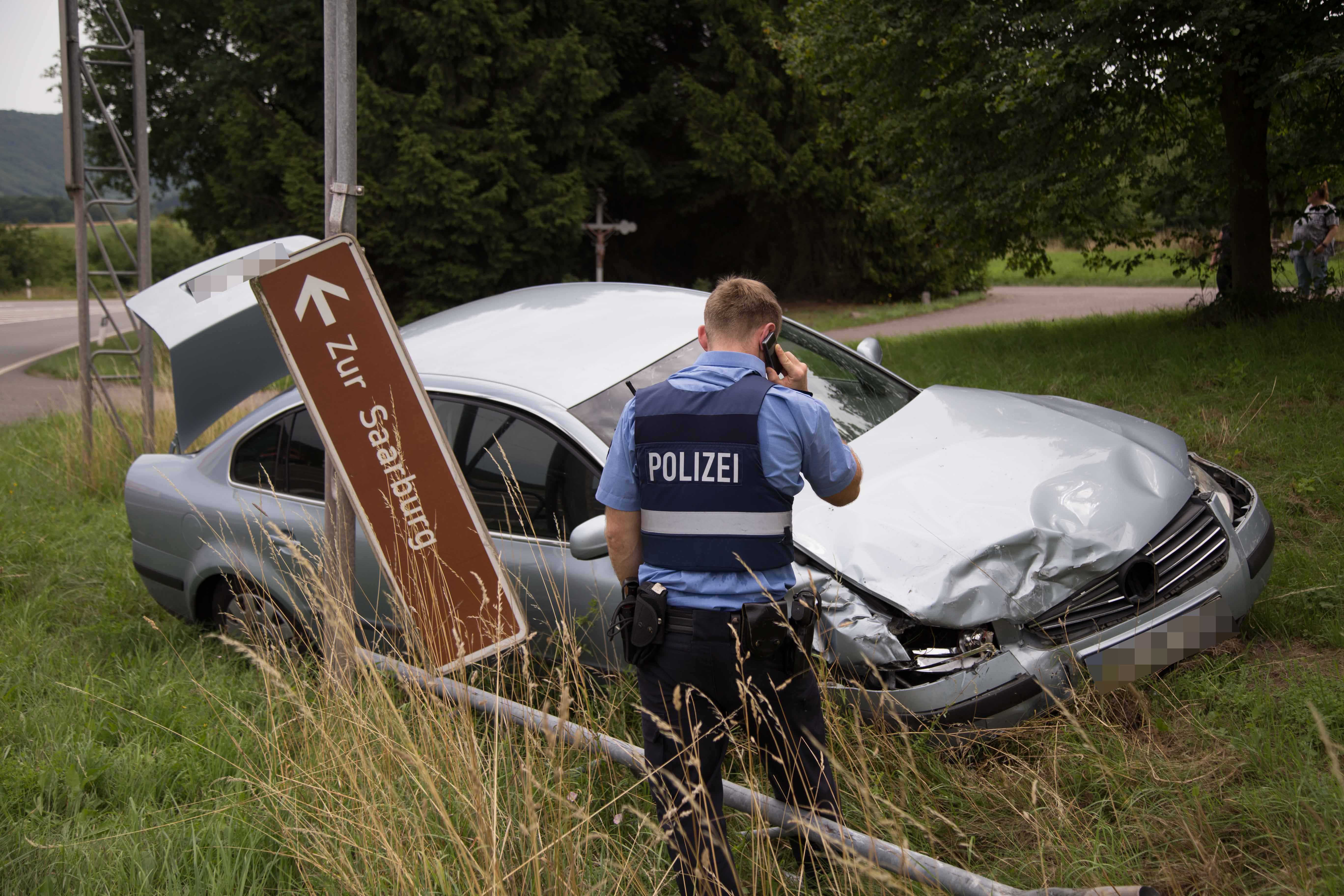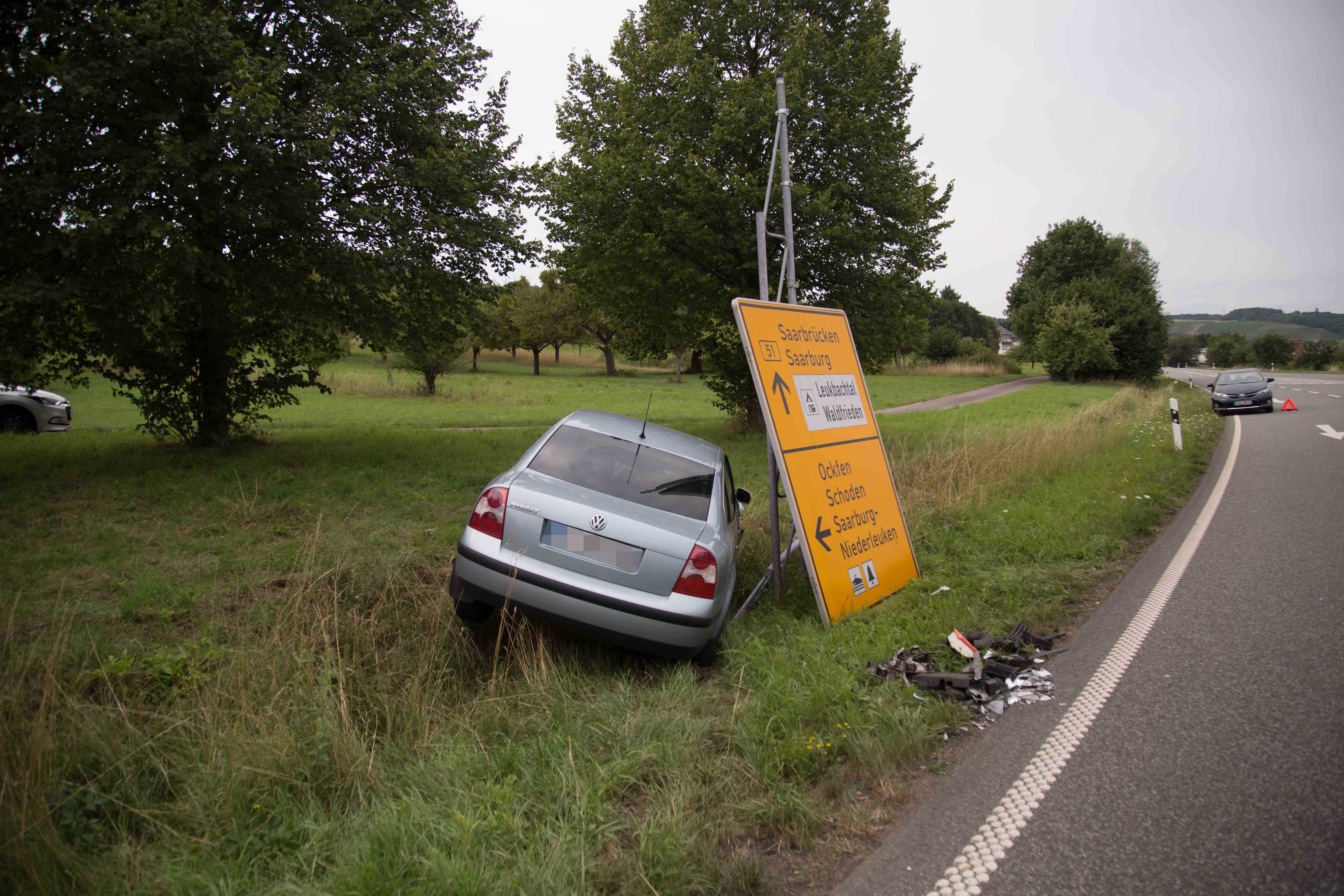Der Passat wurde hierbei auf die Gegenfahrbahn geschleudert und riss dabei eine große Verkehrstafel um. Der Skoda drehte sich aufgrund des Aufpralls um 180 Grad.
