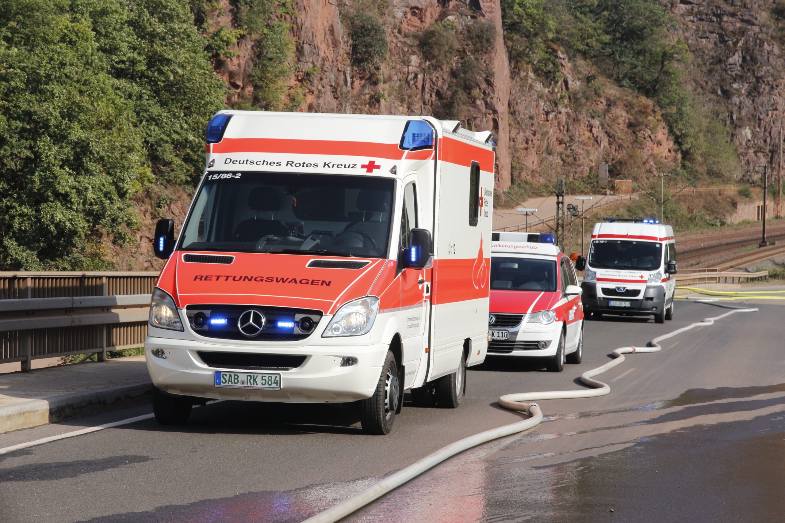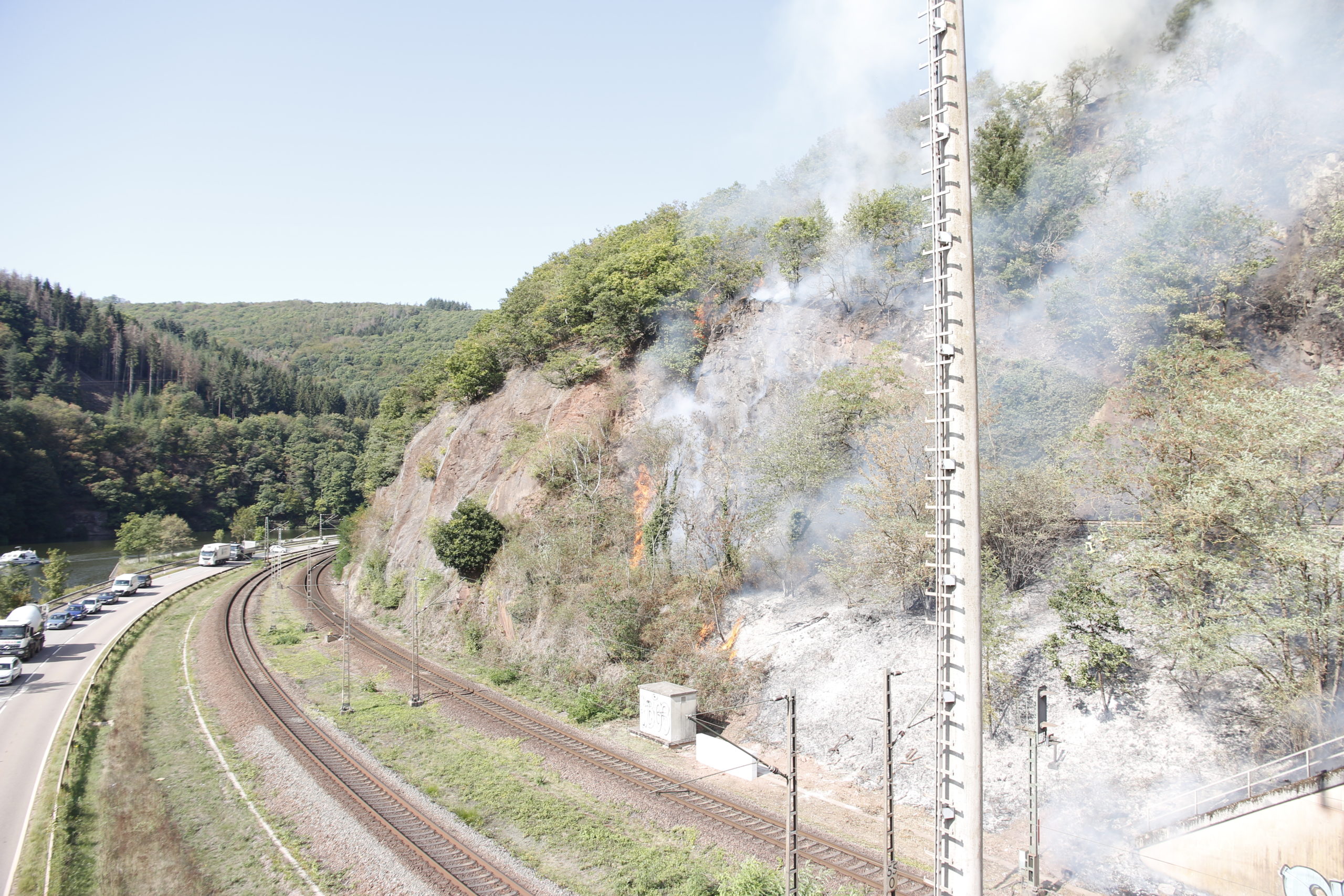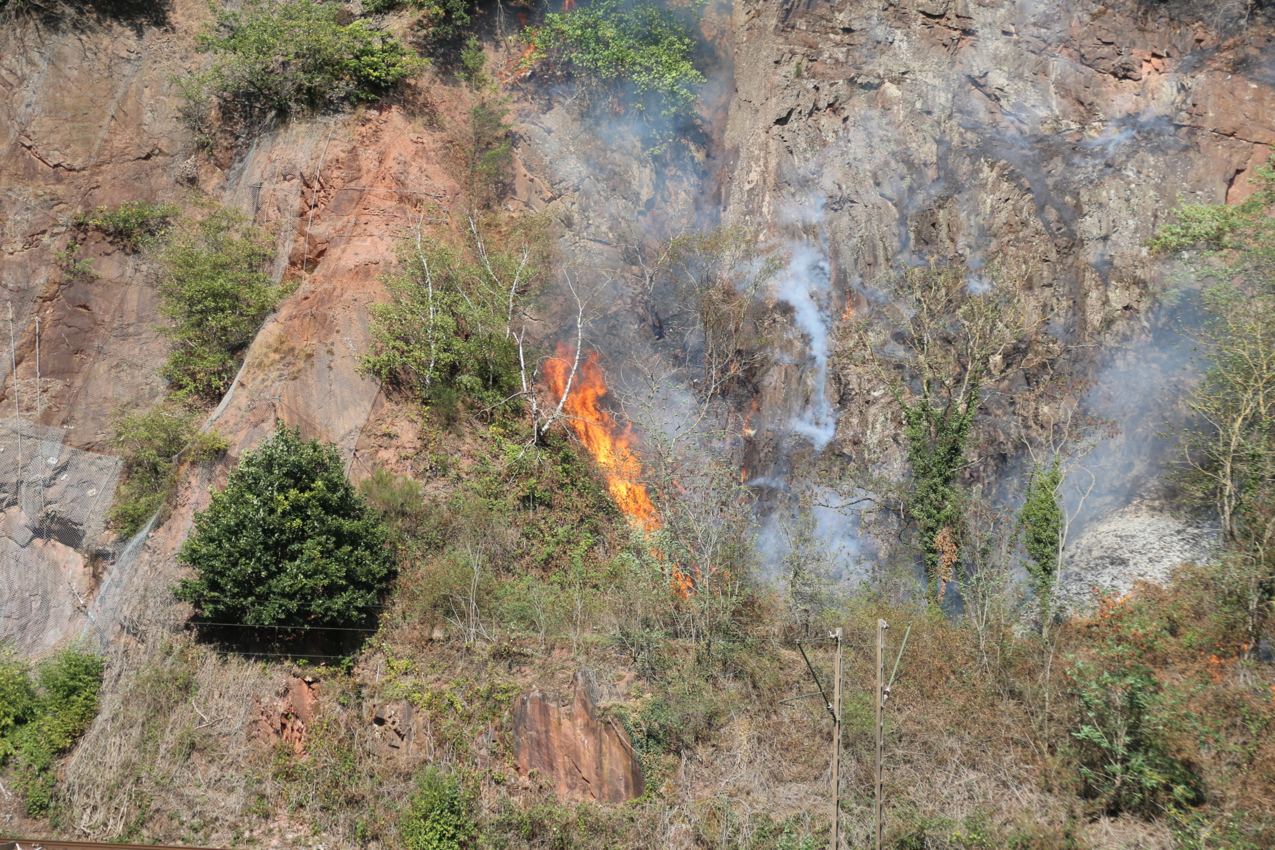 Taben-Rodt/Serrig. Die Einsatzkräfte der Feuerwehr und des Katastrophenschutzes sind am 17.09.2020 gegen 14:00 Uhr zu einem Brand im Bereich des Bahnhofs Taben-Rodt gerufen worden. Im Bereich der Bahngleise brach ein Feuer aus, das sich schnell auf der Fläche ausbreitete. Die Einsatzstelle befindet sich an einem Steilhang, der dicht bewachsen ist. Das gesamte Einsatzgebiet ist für Rettungskräfte nur schwer zugänglich. Daher gestaltet sich die