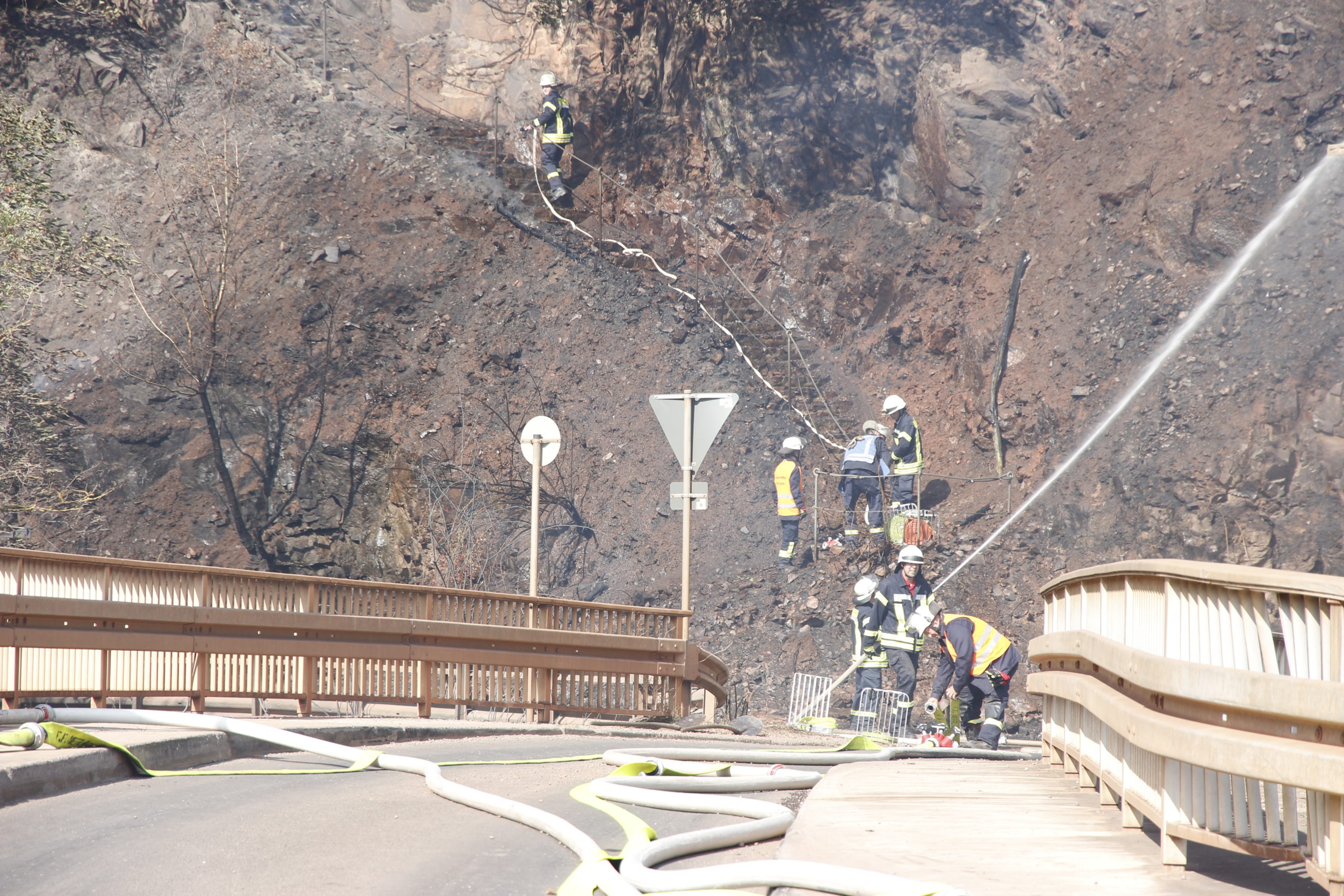 Die Sicherheit der Einsatzkräfte steht während der gesamten Zeit im Vordergrund. Daher war auch zur Absicherung der Löschmannschaften im Steilhang die Facheinheit „Spezielles Retten aus Höhen und