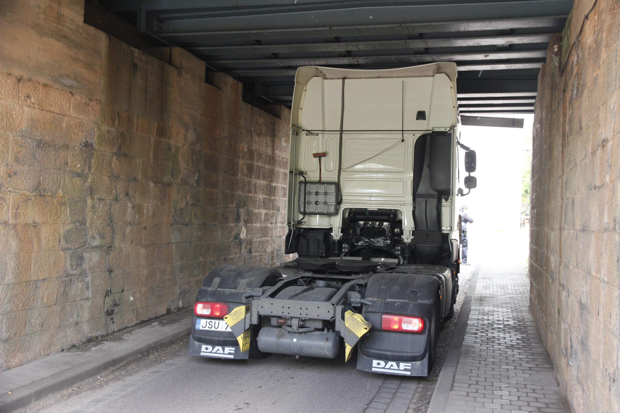 Am heutigen frühen Nachmittag gegen 14.15 Uhr fährt sich eine Zugmaschine aus Litauen mittig des Tunnels mit seiner Kabine fest. Die Tunnelhöhe ist mit 3.50 Meter begrenzt und beschildert.