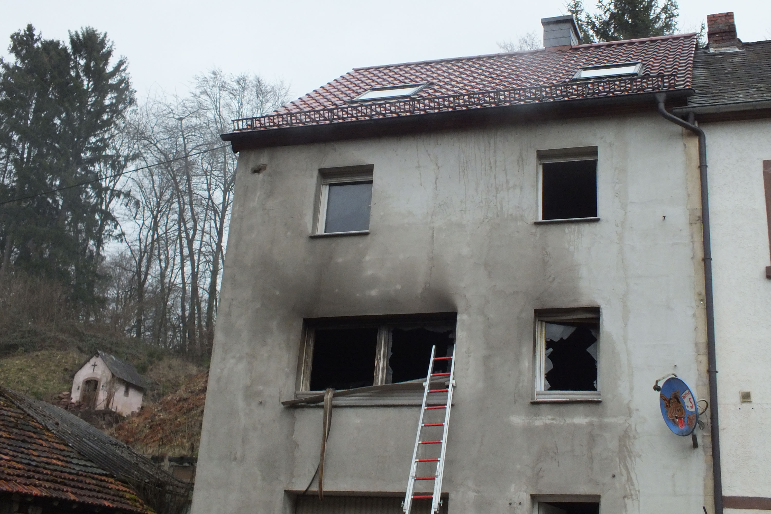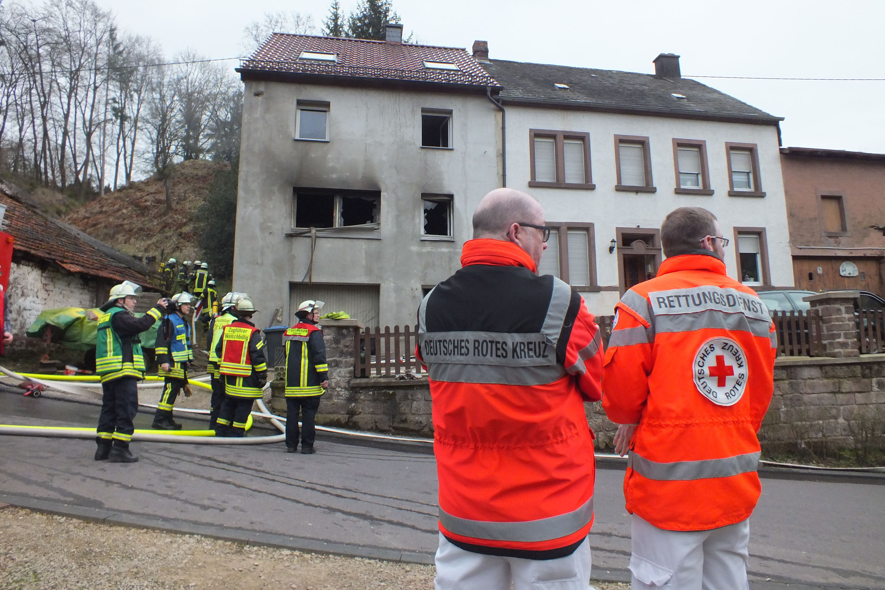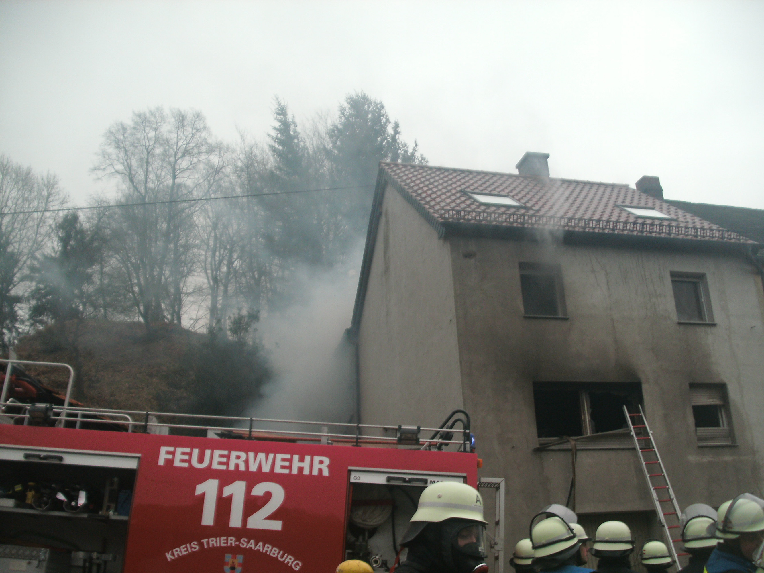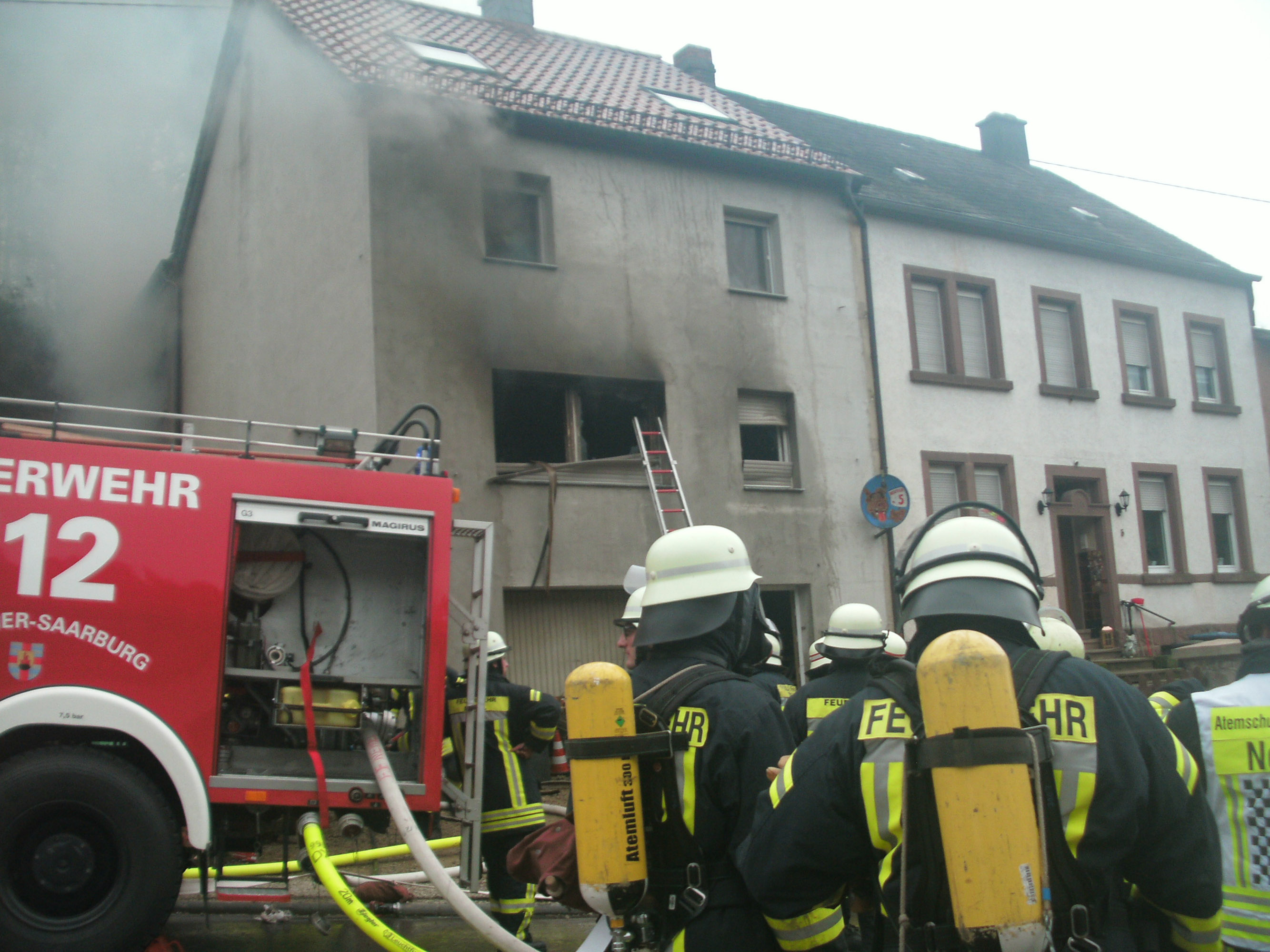 Mittlerweile schlagen Flammen aus den zerbrochenen Fenstern. Die alarmierte Feuerwehr innerhalb kürzester Zeit an der Einsatzstelle und beginnt unter schwerem Atemschutz mit den Löscharbeiten von Innen. Mit mehreren Strahlrohren dringen die Feuerwehrleute in der erste Obergeschoss vor. Dort ist aus bislang ungeklärten Gründen das Feuer ausgebrochen. Durch das schnelle Eingreifen kann ein Übergreifen der Flammen in das 2. Obergeschoss verhindert werden. Dennoch wird das komplette Haus durch den starken Rauch in Mitleidenschaft gezogen. Der erste Geschoss brennt komplett aus, dort gibt es nichts mehr zu retten.