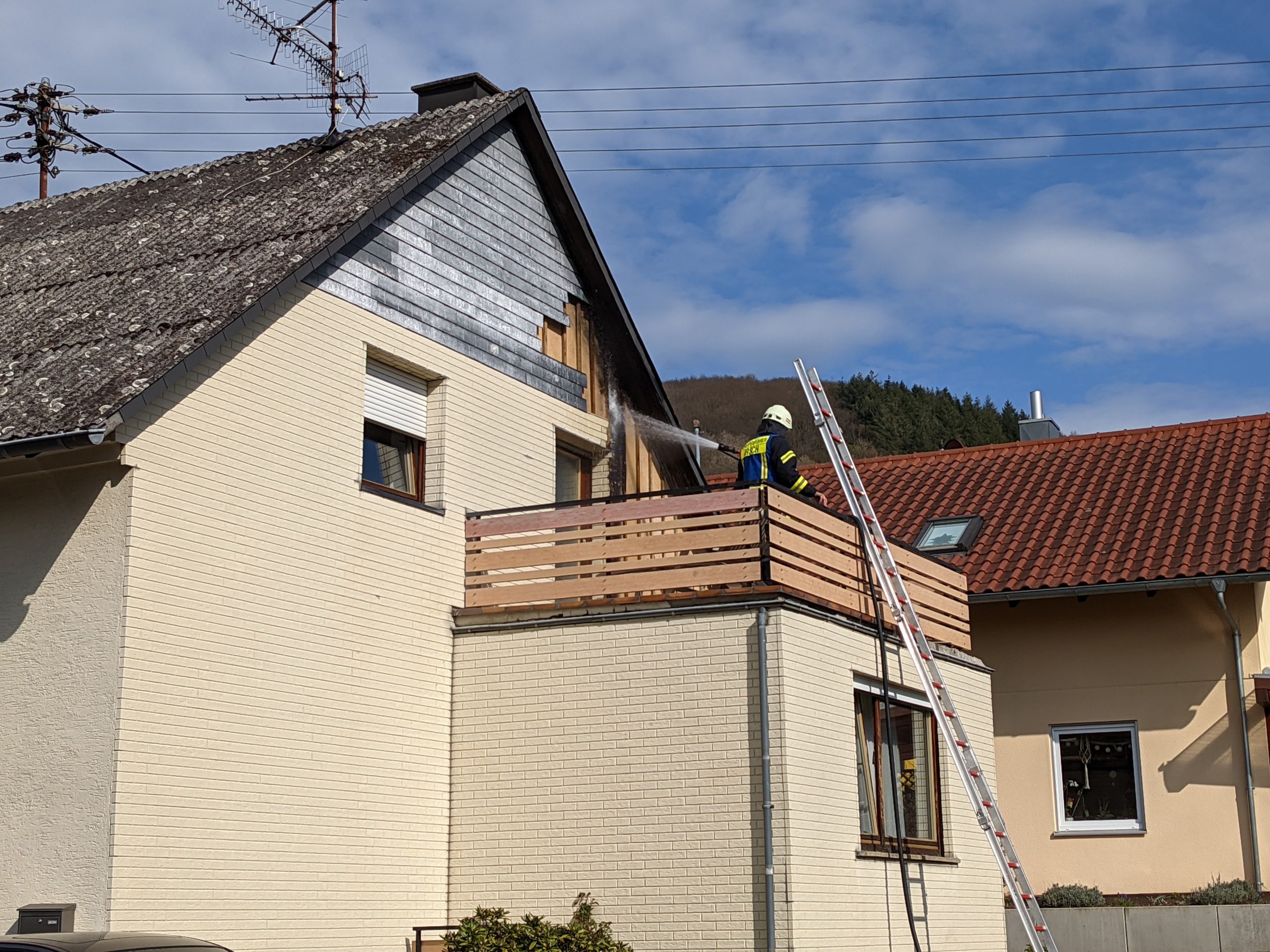 Vor Ort stellten die Einsatzkräfte eine in Brand geratenen Hausfassade fest. Durch das beherzte Eingreifen der Hauseigentümer konnte ein übergreifen, der Flammen auf das Dach verhindert werden.