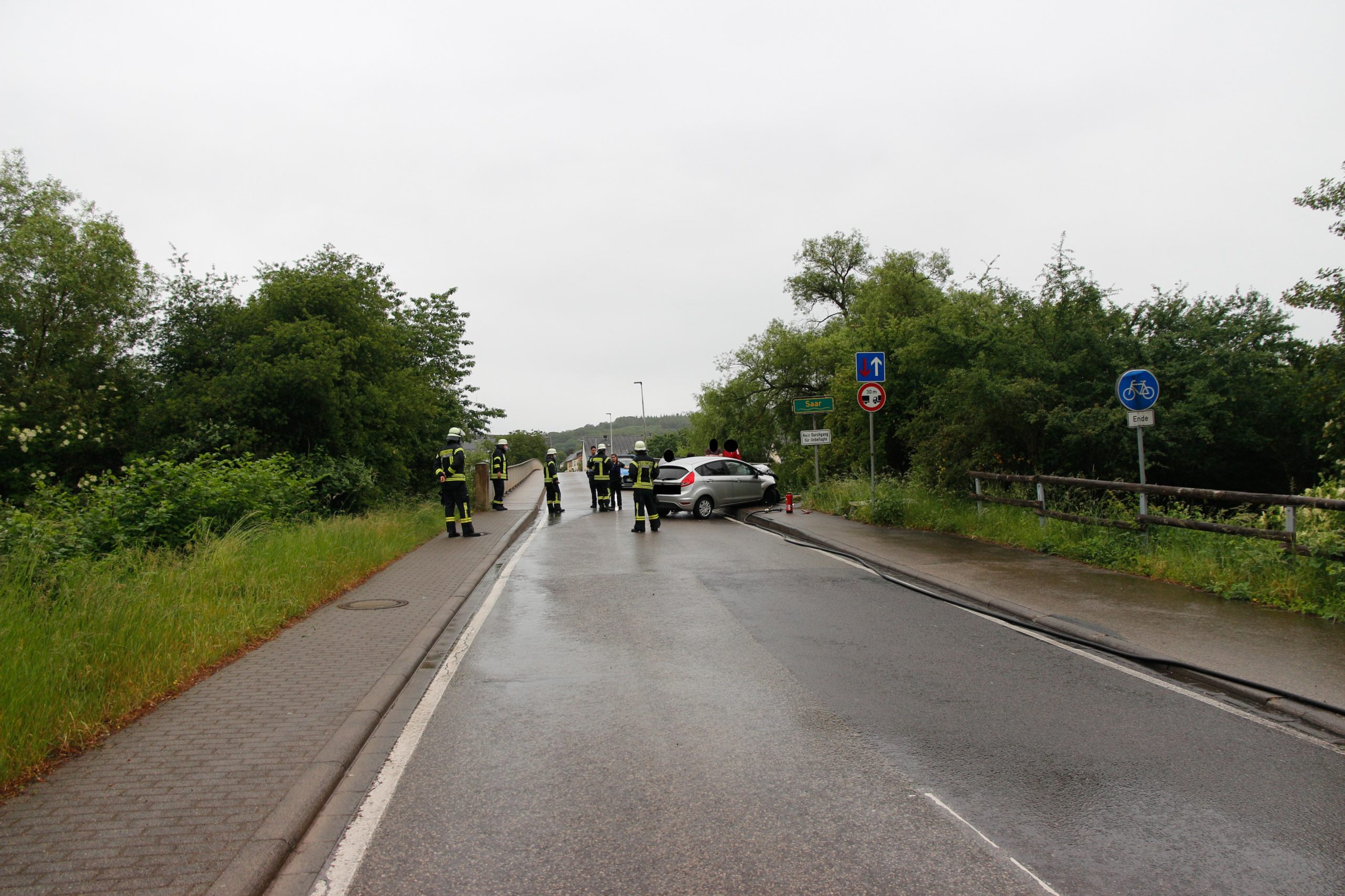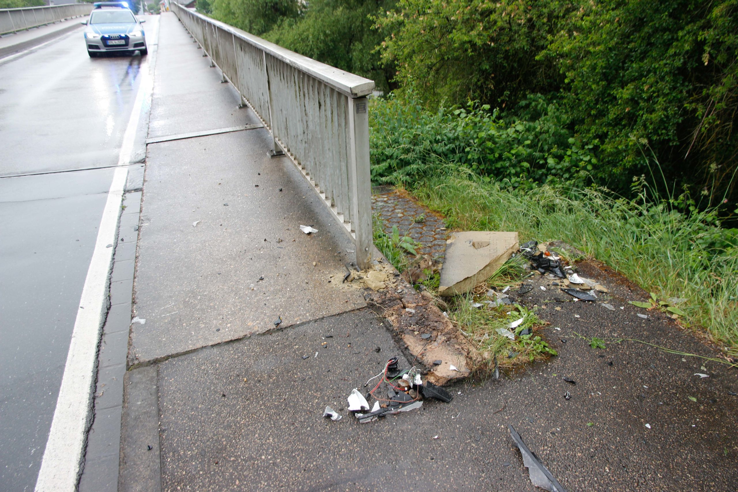 Eines der beteiligten Fahrzeuge rammte nach dem Zusammenstoß zunächst ein Verteilerkasten der Telekom und anschließend ein Sandsteinbrückenpfeiler, der anlässlich des Brückenneubaus nach dem Krieg beidseitig vor der Brücke angebracht wurde.