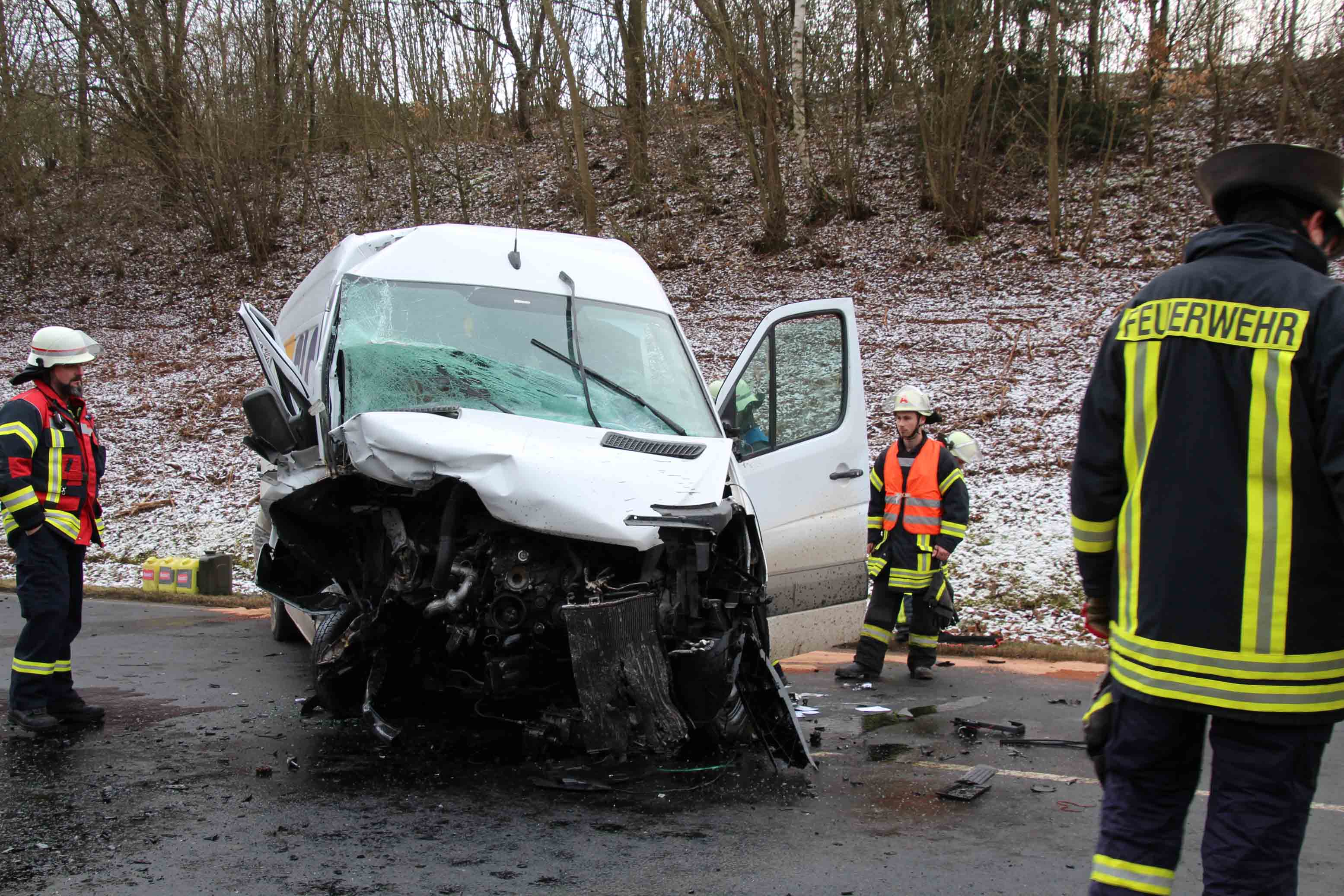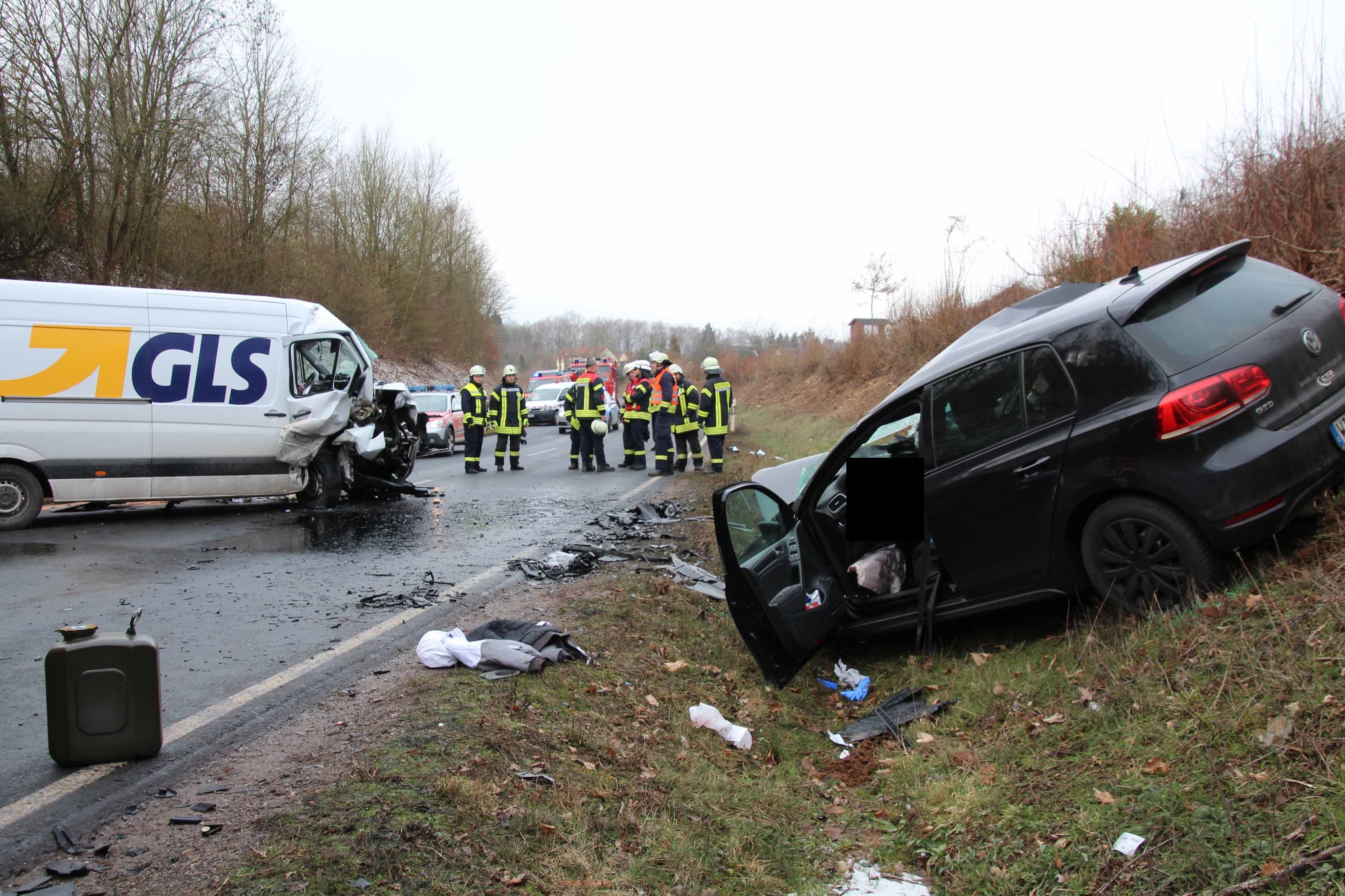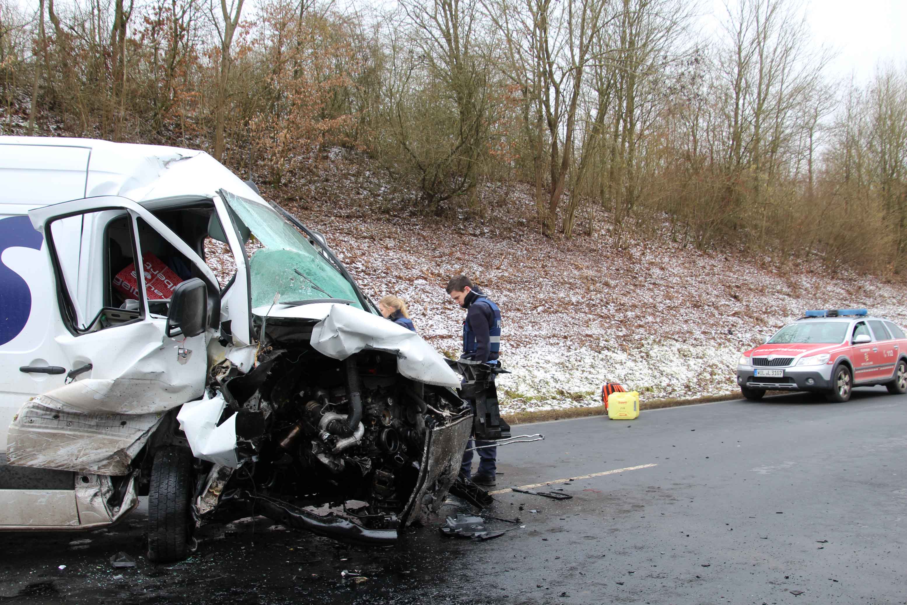 Klausen/Salmtal. Bei einem Frontalzusammenstoß am heutigen Freitagmittag gegen 12.:25 Uhr kam es auf der L 47 zwischen Samltal und Klausen im leichten Kurvenbereich zu dem heftigen Zusammenstoß zwischen einem PKW und einem Kleintransporter.